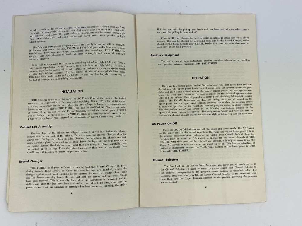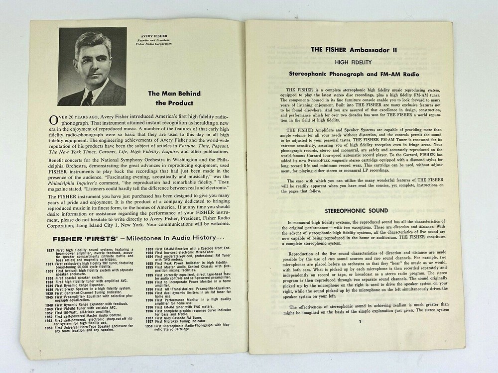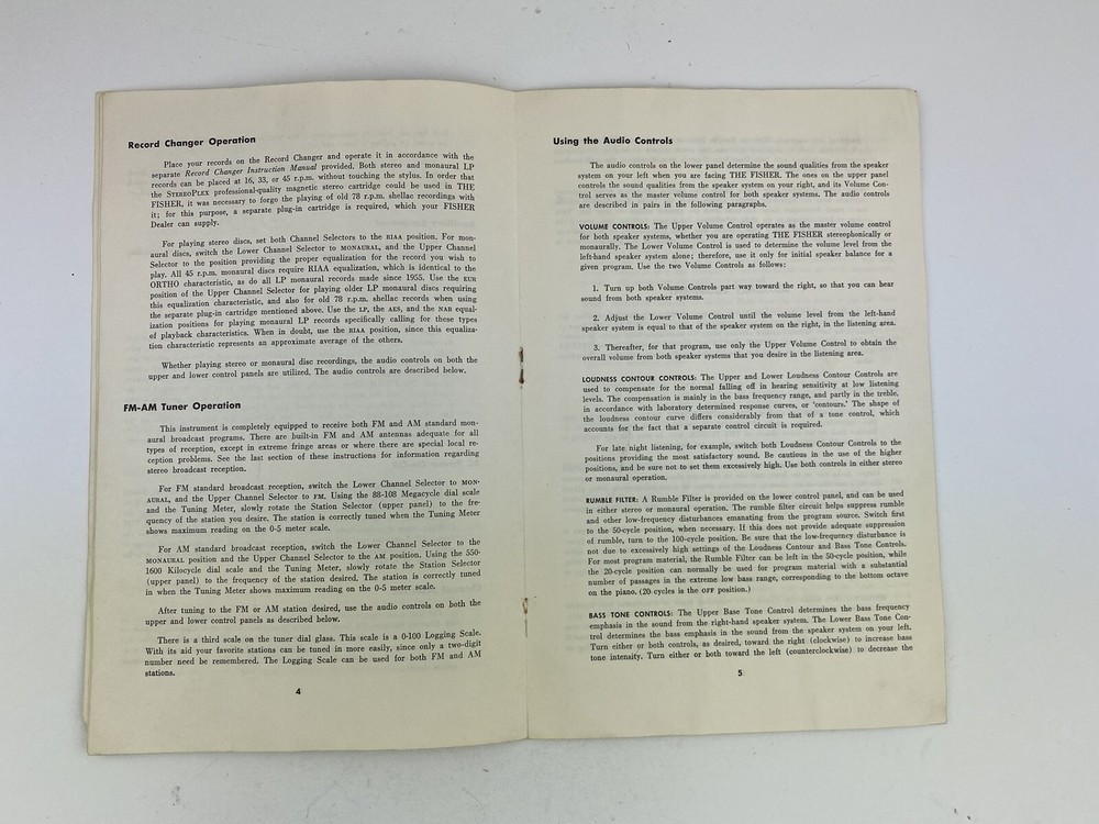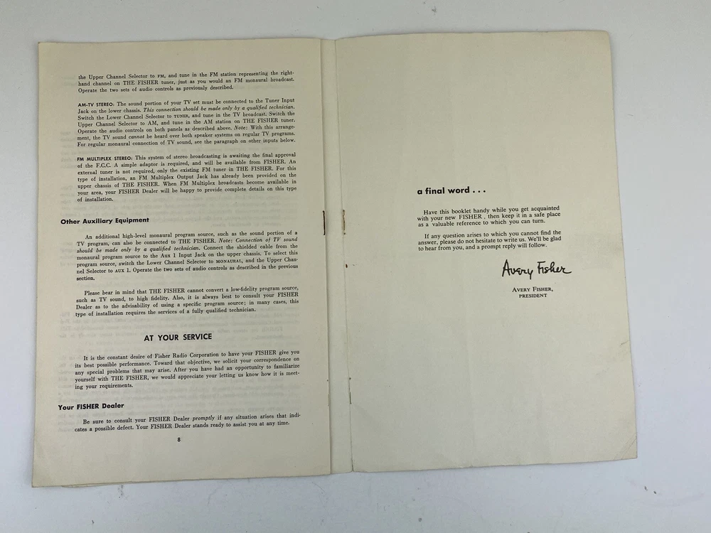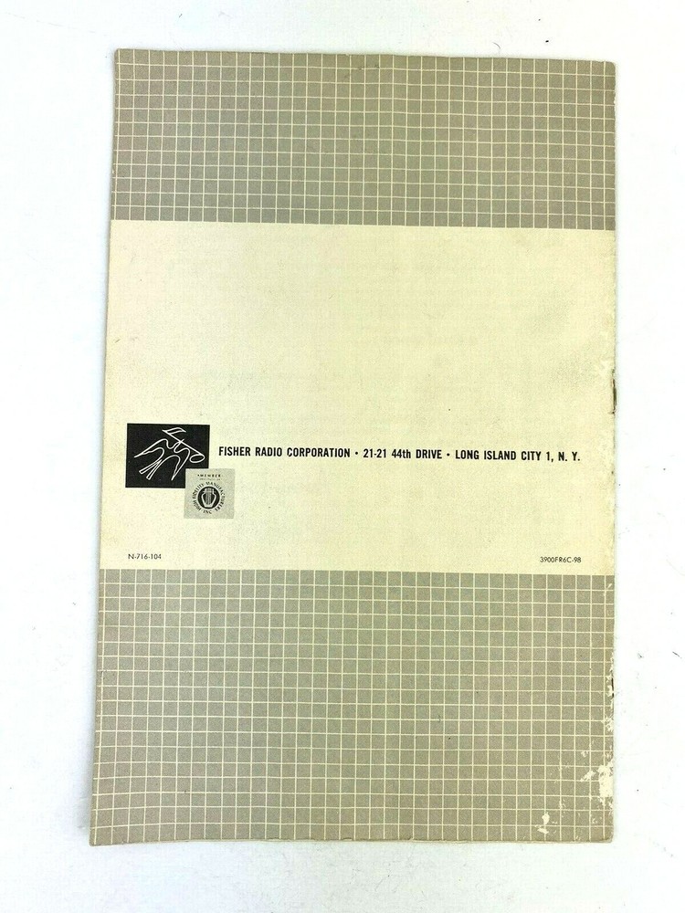 Fisher Radio Corporation The Fisher The Amassador II Operating Instructions Manual - Undated 1950-1960's - Vintage The Ambassador II Stereophonic Phonograph and FM-AM Radio Pages: 8 Measures approximately: 6" x 9" Condition: Condition: Good minus. Paperback pamphlet manual/operating instructions. The stapes in the binding have disintegrated into rust spots so the pages are loose. There is rubbing on the front and back covers. There are light creases on the pages. The bottom right corner is creased. See photos for a close-up view of the condition.