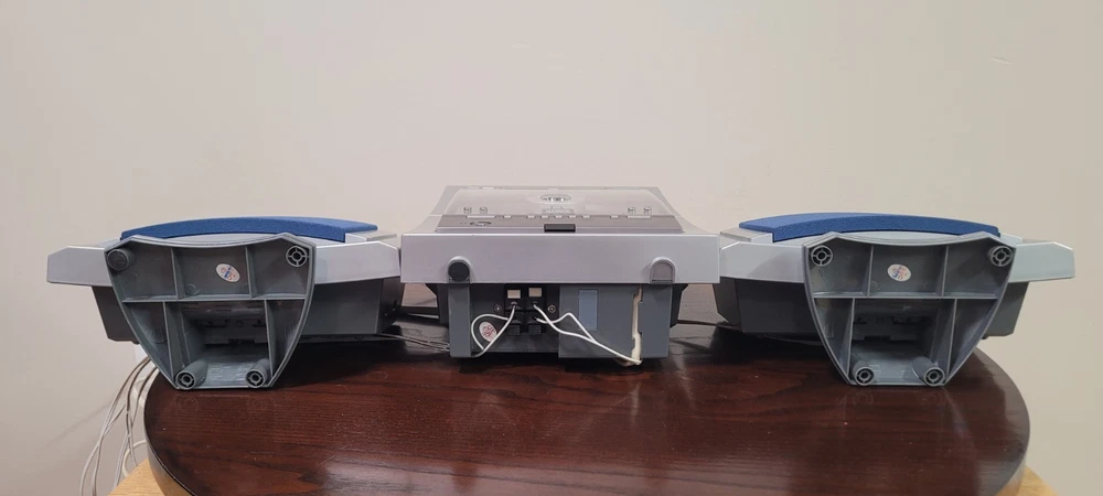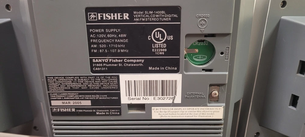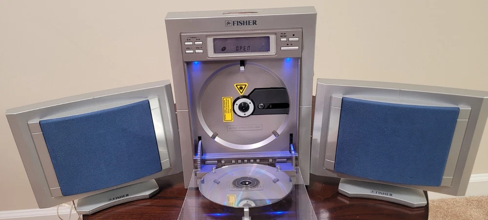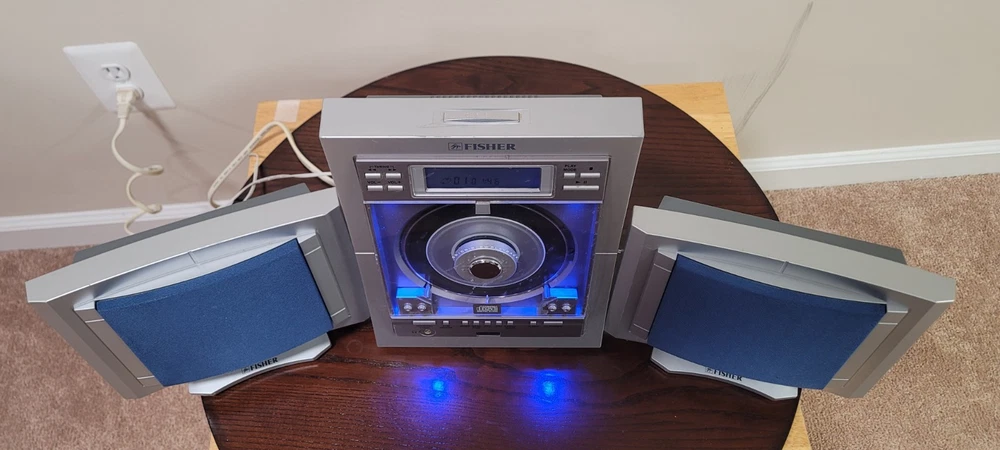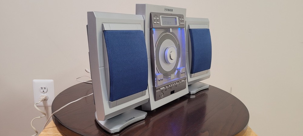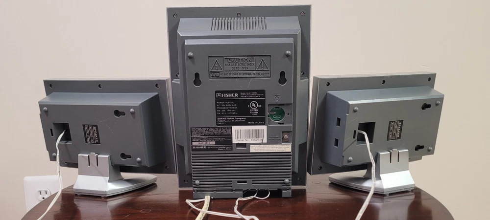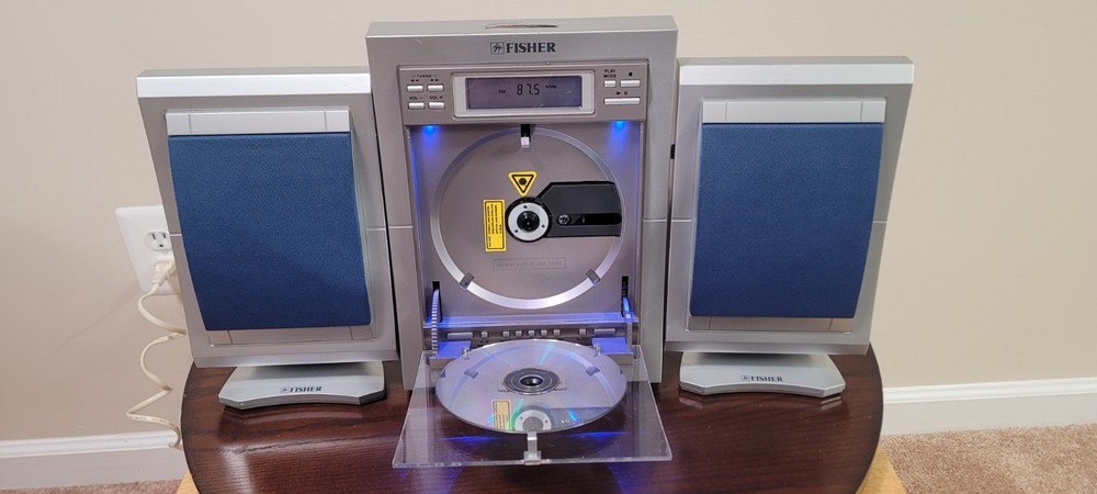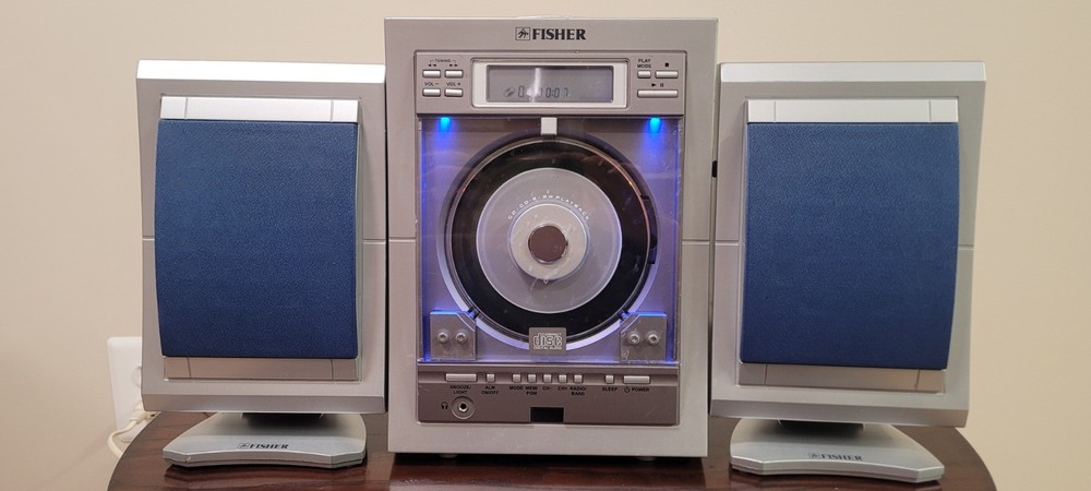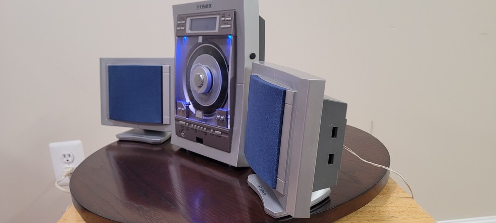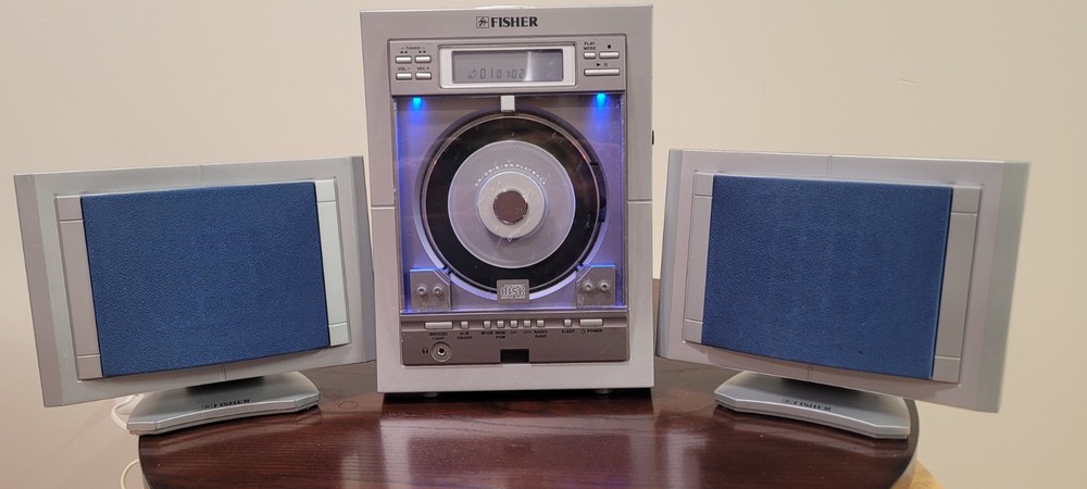 Fisher SLIM-1400 Vertical CD Audio System Digital AM/FM With Speakers. Fully Tested. The functions work perfectly. some minor scratches. Back battery cover missing.