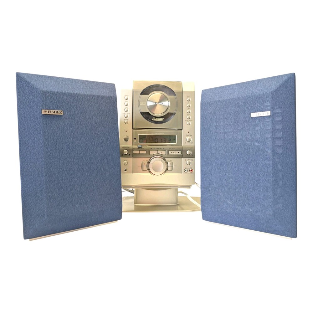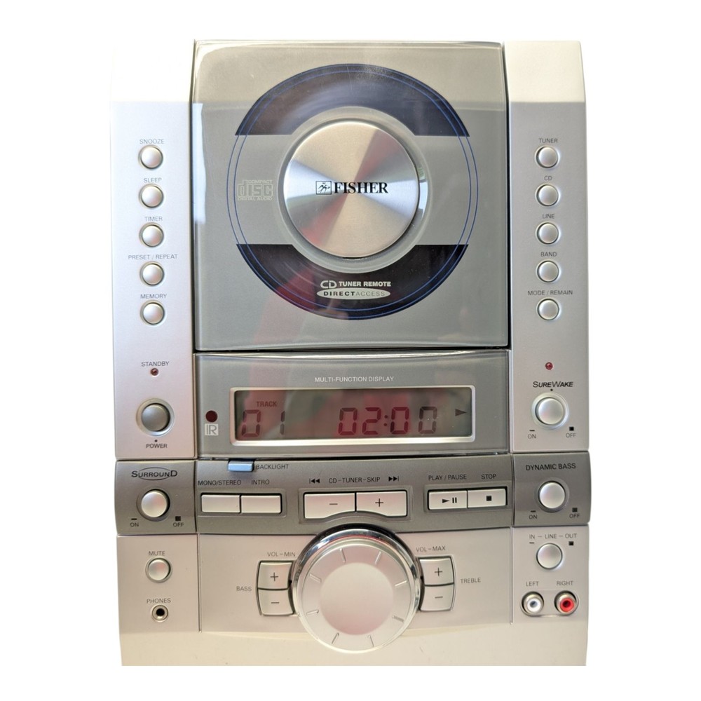 The Fisher SLIM-1500 AM FM Radio CD Player Stereo is a sleek and compact audio system that offers a variety of features, including detachable speakers, headphone jack, and raw cable speaker jacks for audio output. This model, part of the DIGITRADIO product line, plays CD media format and is ideal for home audio setup. With its silver color and AM/FM radio capabilities, this stereo system provides a convenient and stylish option for music enthusiasts.