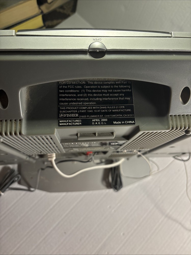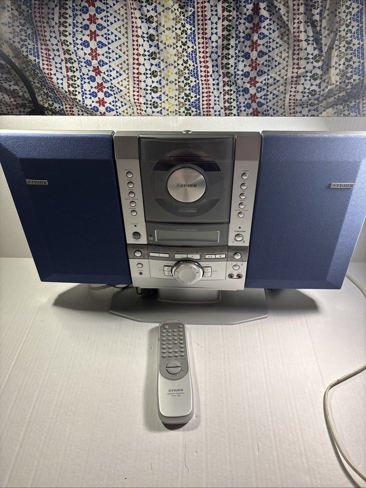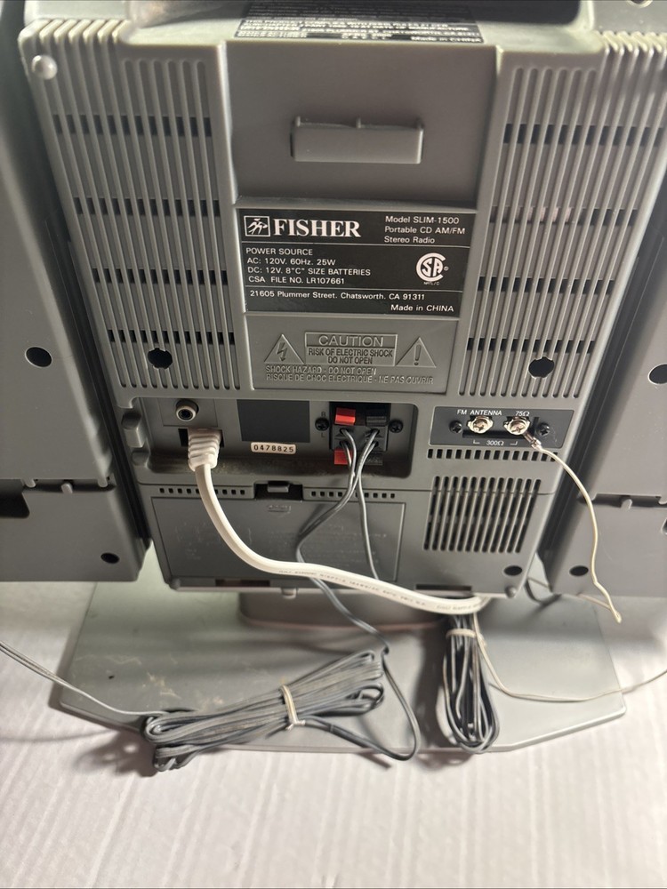 This is a Fisher SLIM-1500 CD Player with AM/FM radio. It features detachable speakers, a remote control, headphone jack, and raw cable speaker jacks. The unit has a silver color and a compact design with dimensions of 21-1/2” in length, 13-1/2” in height, and 6-3/4” at the base. It was manufactured in 2000 as part of the DIGITRADIO product line.