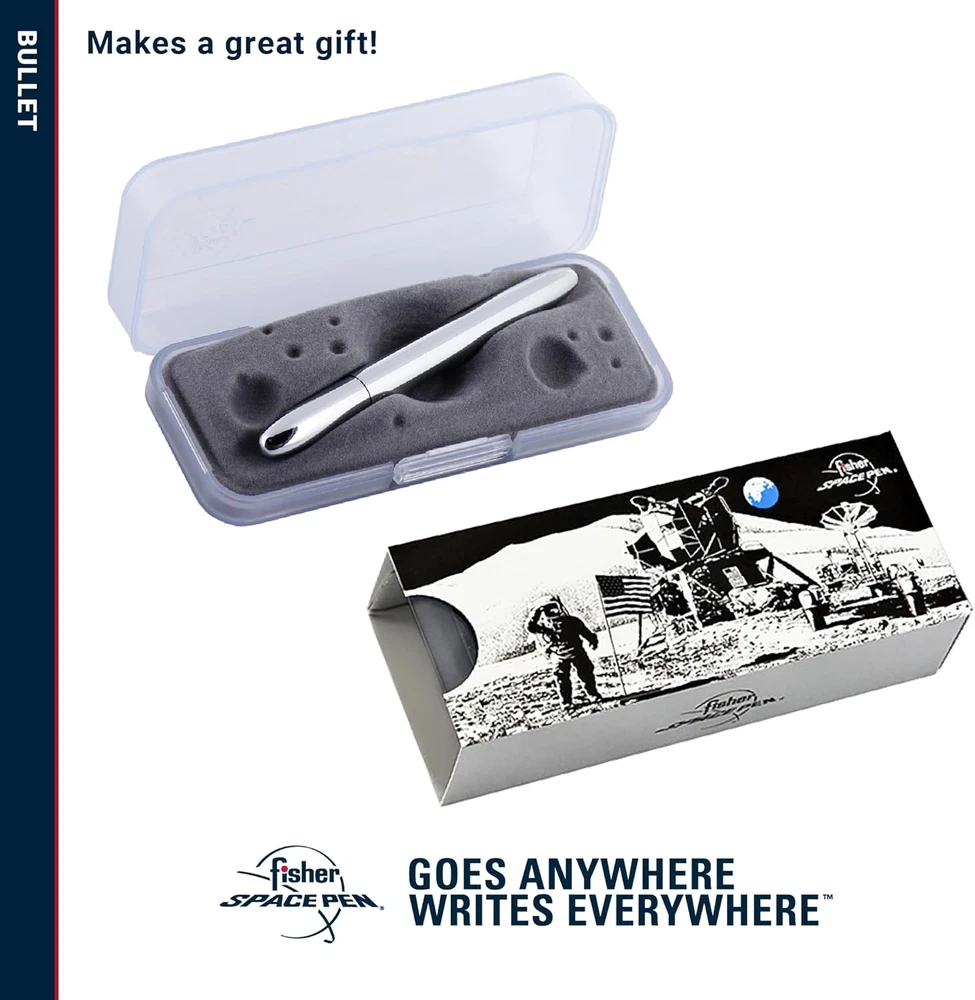 A Pen Designed to Last: The Chrome Bullet Pen is a timeless, classic ballpoint pen and compact enough to carry in your wallet, pocket, purse, car glove box, organizer, or toolbox Write at any Angle: Fisher Space Pens are versatile and practical ballpoint pens that can smoothly write at any angle, even upside down with reliable performance on almost any surface Write in Extreme Temperatures: All Fisher Space Pens write in extreme temperatures ranging from -30°F to 250°F (-34° to +121°C), underwater, in space or any other harsh environment Quality and Reliability: Trusted by Astronauts, Explorers, and Professionals, Fisher Space Pens are often used in industries including Engineering, Aviation, Science, and Outdoor Adventures Explore The Fisher Space Pen Collection: Try our full collection of versatile and functional pens designed to write in Zero Gravity, Underwater, Through Oil and Grease and in Extreme Temperatures Product Description The video showcases the product in use. The video guides you through product setup. The video compares multiple products. The video shows the product being unpacked. Fisher Space Pens Since 1967 Merchant Video The Bullet Pen Held in the permanent collection of the New York Museum of Modern Art as a symbol of elegant, industrial American design, experience true luxury in the palm of your hand. Explore More Fisher Space Pens Add to Cart Add to Cart Customer Reviews 4.7 out of 5 stars 7,299 4.6 out of 5 stars 5,381 4.7 out of 5 stars 3,224 4.6 out of 5 stars 1,052 4.5 out of 5 stars 297 4.7 out of 5 stars 10,718 Price — — — $53.10 $ 53 . 10 $43.20 $ 43 . 20 — Size Open 5.35”; Closed 3.77” Open 5.27”; Closed 5.13” Open 5.06”; Closed 5.12” Open 5.45”; Closed 5.4” Open 3.63”; Closed 3.91” 2.64” / 3.43”/ 3.83” Material Brass Brass Brass Aluminum Brass Brass Color Options Available Various Various Chrome, Black Titanium Matte Black Matte Black Various Finish Polished, Plated, Powder Coat Powder Coated, Cerakote Plated Anodized Aluminum Powder Coated - Point Type Medium Point Medium Point Medium Point Medium Point Medium Point Fine, Medium, Bold Cap vs. Retractable Capped Retractable Retractable Retractable Capped - Pen w/ Clip Available? Yes Yes Yes Yes No -