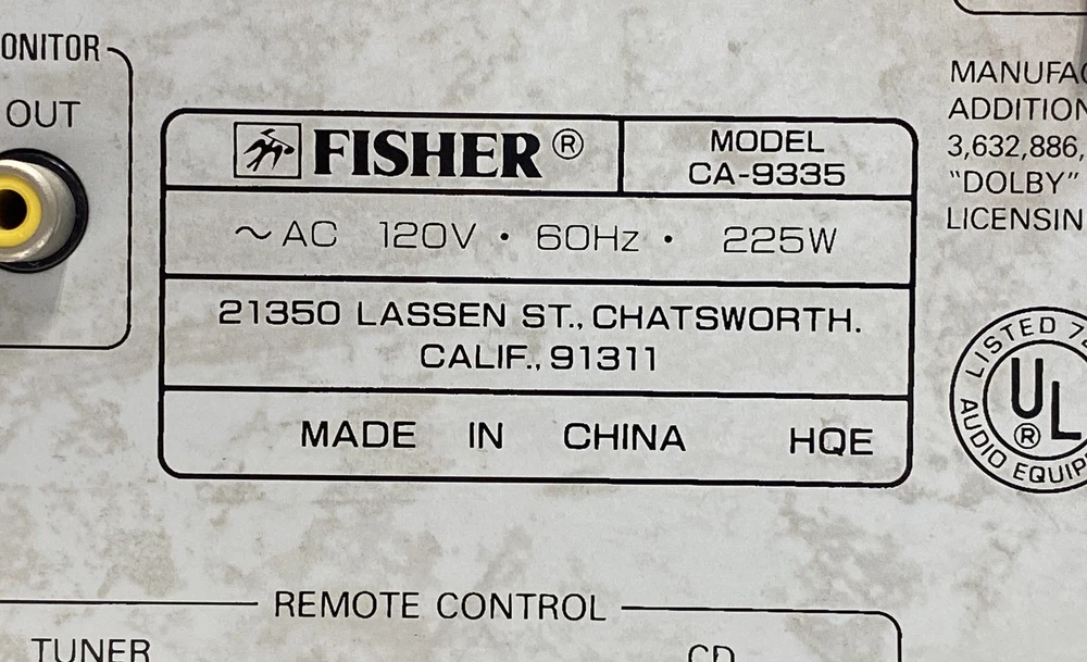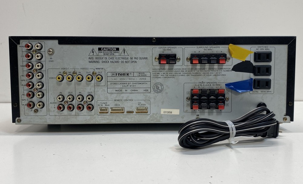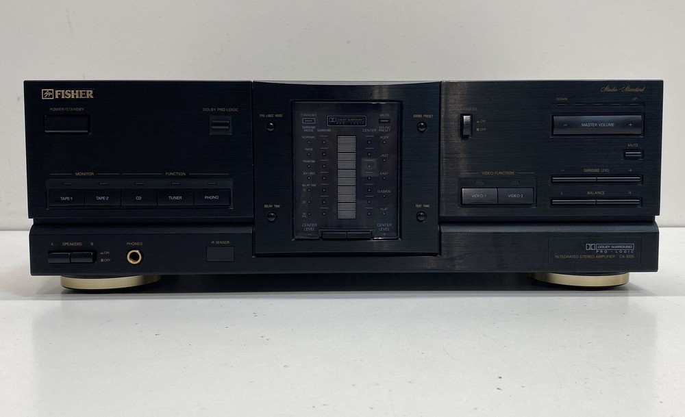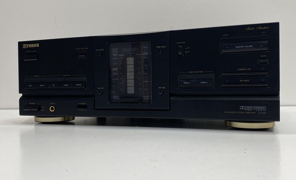 Title : Fisher Stereo Amplifier Condition : Used Brand : Fisher Model : CA-9335 Type : Integrated Stereo Amplifier Number of Channels : 5 Number of Inputs : 10 Number of Outputs : 8 Surround Sound Formats : Dolby Pro Logic Audio Inputs : RCA Phono CD Tuner Tape1 Tape2 Video1 Video2 Audio Outputs : RCA Speaker Terminals Phones Color : Black Band : Stereo Receiver Combo Features : Amplifier Supported Modes : Pro Logic Surround Features : Loudness Master Volume Balance Tape Monitor Video Function Power : 225W MPN : CA-9335 Unit Type : Unit Country/Region of Manufacture : China Compatible Product : Home Audio Serial Number : U3928598 Accessories Included : Power Cord Length : 16.9in Width : 17.1in Height : 5.9in Line Voltage : 120V 60Hz Studio Standard : Yes Mute Function : Yes Speaker Impedance : 8 Ohm Min Main Purpose : Home Theater Video Inputs : Yes Remote Control Capability : Yes Functionality : Integrated Stereo Amplifier Fisher CA-9335 Brand: Fisher Model: CA-9335 Functionality: Integrated Stereo Amplifier Condition: Serial Number: U3928598 Accessories Included: Power Cord Good, sold as is, signs of wear, needs cleaning, marks, scratches, sticky, powers on, lights up, buttons seem to be responsive, unable to test further, cannot guarantee functionality Local Pick up: We offer local pick up by appointment only . Please message us when you have paid for your order so that we can send you the link to book your appointment. Please note that we require an appointment for each order. We do not offer same day pick up, and require 2 business days notice so that we can ensure that your order is ready for you. For more information, please send us a message! Thank you for shopping Goodwill Southern California and for supporting our mission to provide jobs for individuals with disabilities and disadvantages. Your purchases help create jobs, hopes, and futures.