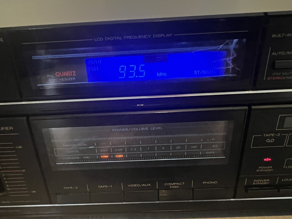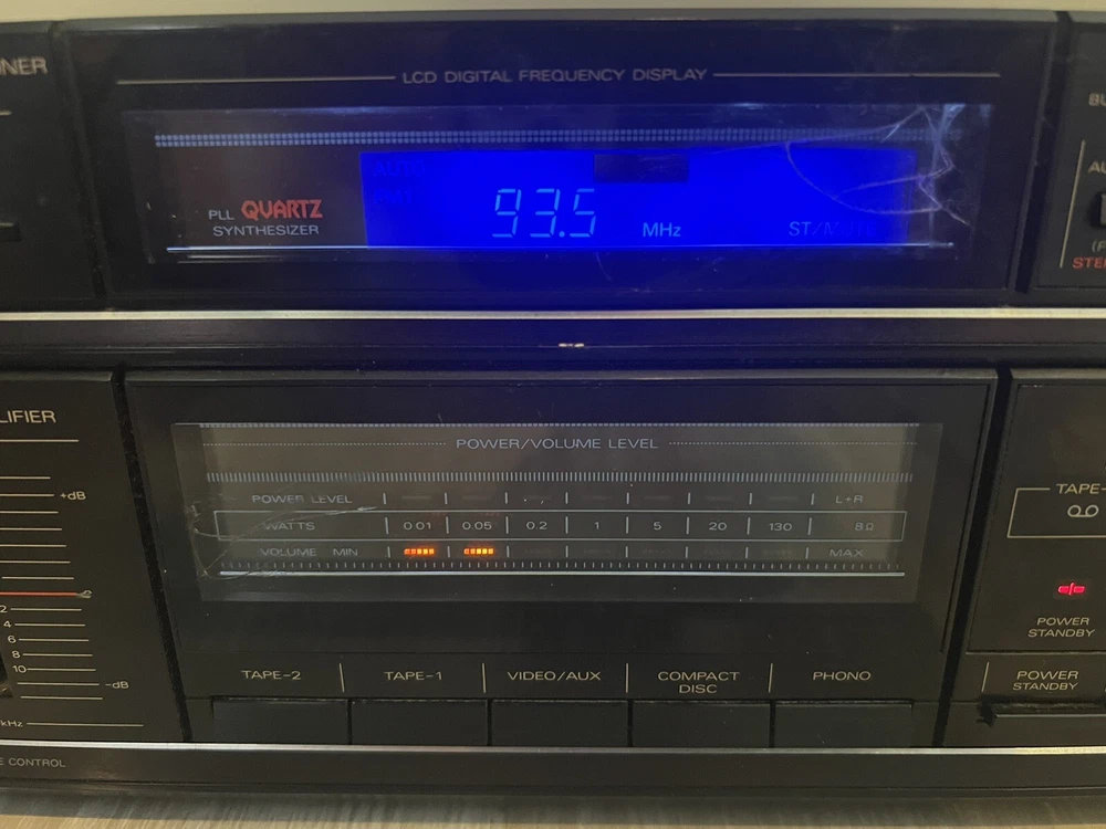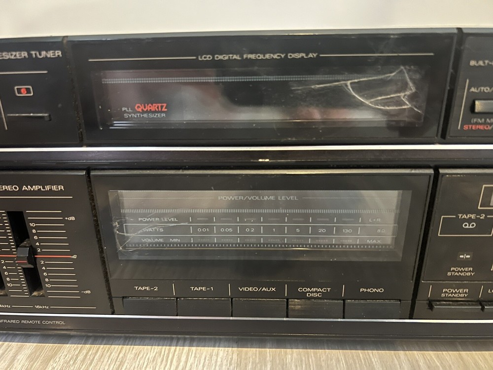 Some cracks on glass of the faceplate that I fixed best I could. Some scratches. See pictures, please. Overall in great shape. Worked well, all functions seemed to respond properly. Great sound from the amp. Lights for the tuner backlight were replaced with LEDs. Note: there are also two lights on top of the tuner screen that were replaced with LEDs. I have, however reversed their direction to light up the insides of the amp -- seemed kinda cool to me :).. They can also be reversed easily into original position if desired. Included: what you see in the pictures. Thank you.