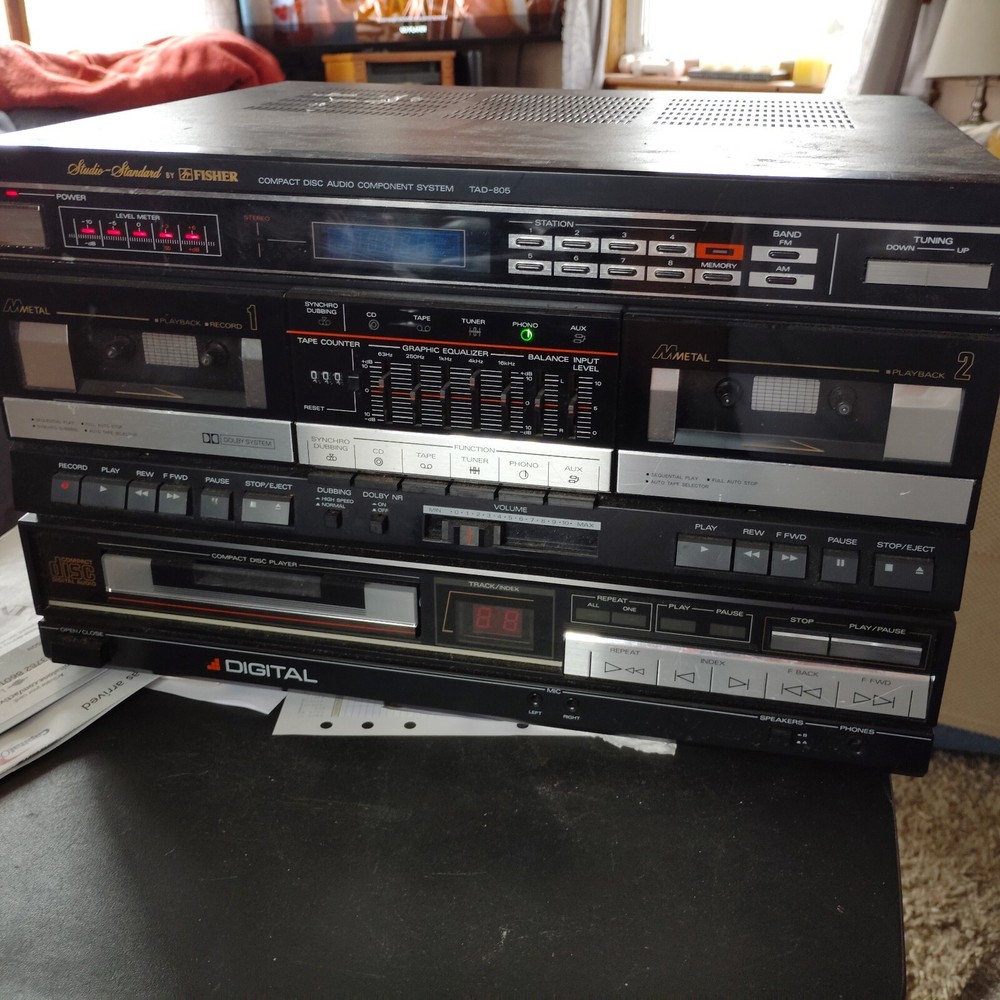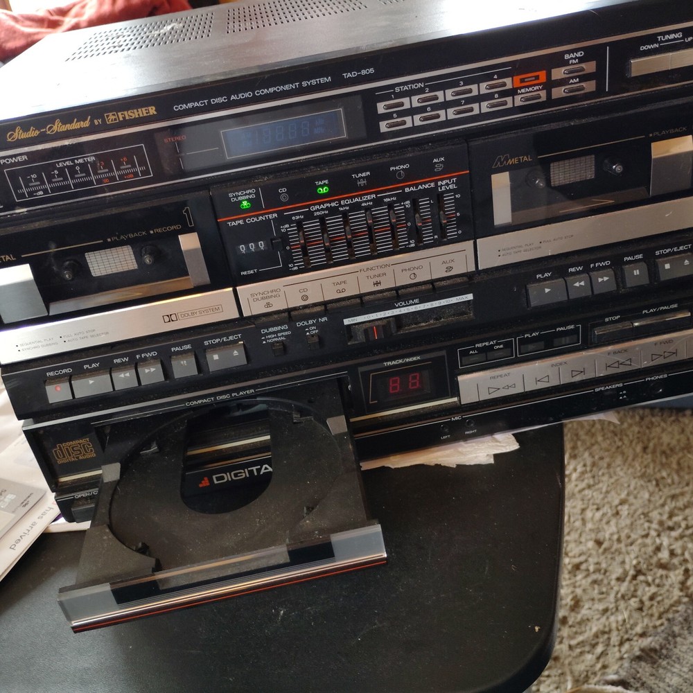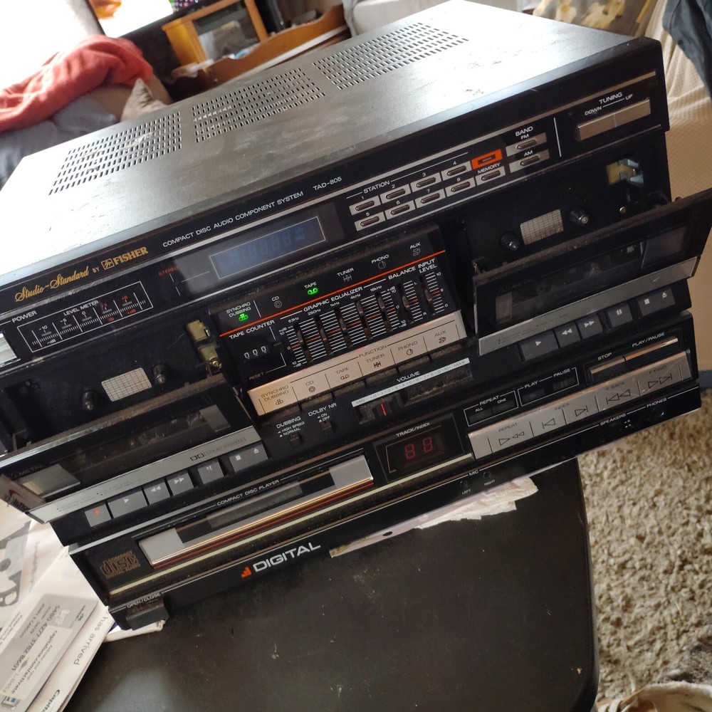 HUGE MAKE AN OFFER SALE : Everything must go to make room for new items. Make an offer and you might be surprised at the response !!! Also, I will combine shipping so you will get the lowest shipping cost ! Message me with an offer and I'll get back to you soo....first come first served so hurry I do not have the speakers needed to test this. It has been in the attic for years, I totally forgot about it. I remember that the CD tray will not pull out without pulling it by hand. I cannot guarantee that everything works, it has been upstairs for a long time. It lights up and the cassette doors open up. IF SHIPPING IS MORE THAN $40, PLEASE LET ME KNOW AND I'LL TRY TO HELP. The Fisher TAD-805 Studio Standard CD Audio Component System is a vintage portable stereo and boombox offering high-quality audio playback. This system is designed to play CDs and is part of the Fisher brand's lineup of audio products. With its model number TAD-805, this audio component system is a sought-after piece for collectors and audiophiles looking to enjoy the nostalgic sound of CDs in a compact and stylish package.