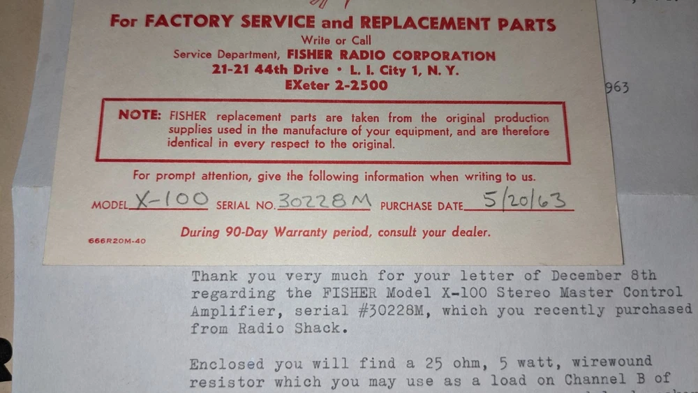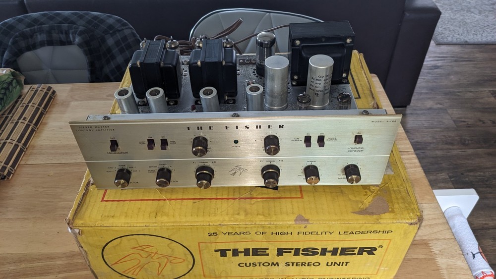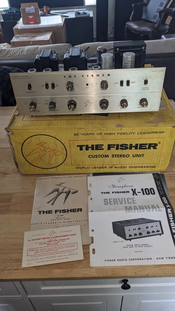 Fisher X-100 - ALL FISHER TUBES Working properly, recapped . Original Factory Box with serial number - Check pictures Comes with original ox and printed manual, Fisher letter with serial number that matches the chassis, date and place of purchase in 1963. Beautiful Faceplate and knobs. All controls and switches are working fine, ALL CLEANED AND LUBRICATED. Bias adjusted as per manual. Recapped All switches are working fine ALL 7189, 12AX7 and 7247 are FISHER ORIGINAL TUBES, made in German and tested strong. High quality audio, rich in harmonics, deep bass and defined treble Check pictures and video. Due to the carelessness of the carriers (amplifier may be damaged), it is recommended to pick it up. If you prefer, I can test the amplifier with you. I am in Costa Mesa-CA I will ship box inside box + lot of protection. Feel free to ask. Check out my other Fisher Units for sale !!
