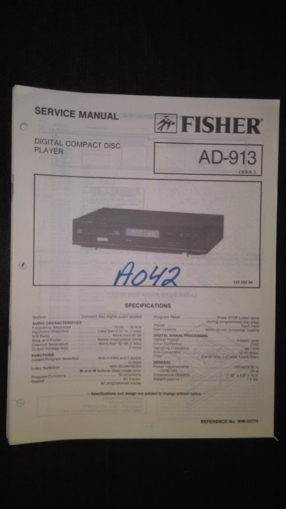 Fisher AD-913 Stereo CD Player Original Repair Service Manual