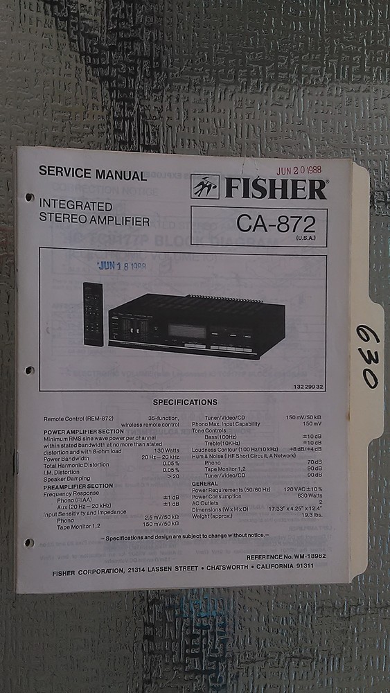 Fisher CA-872 Stereo Amplifier Original Factory Service Manual & Repair Guide