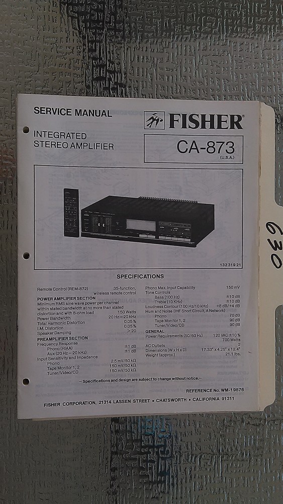 Fisher CA-873 Original Service Manual for Stereo Amp Repair