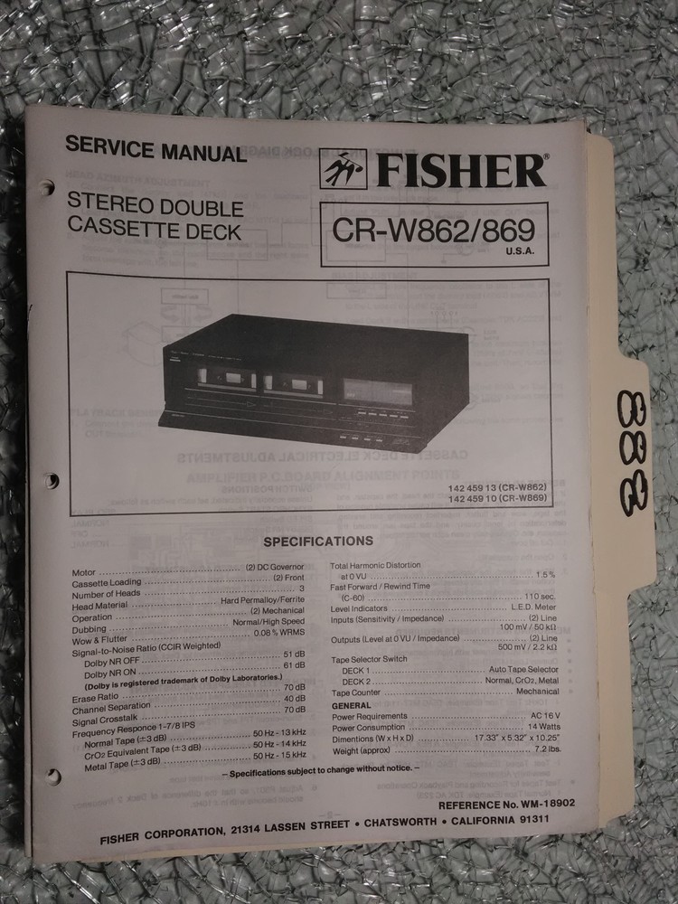 Fisher cr-w862 w869 service manual original repair book stereo dual tape deck