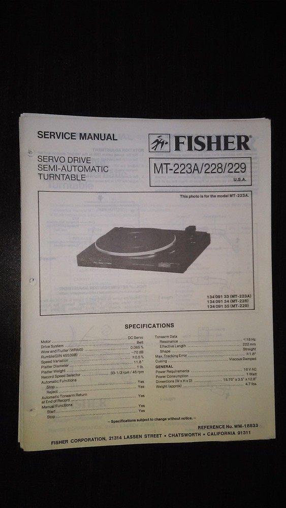 Fisher MT-223A 228 229 Turntable Service Manual Original Stereo Record Player Repair Guide