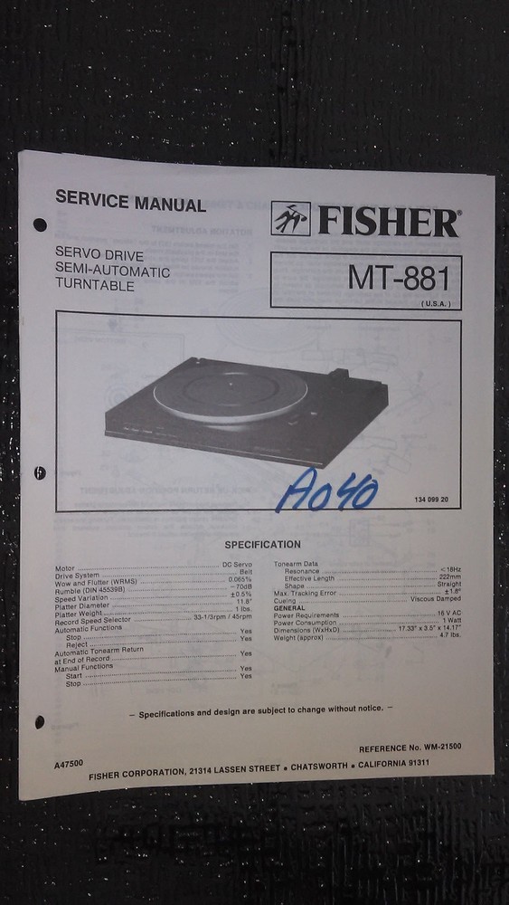 Fisher MT-881 Service Manual Original Turntable Repair Guide