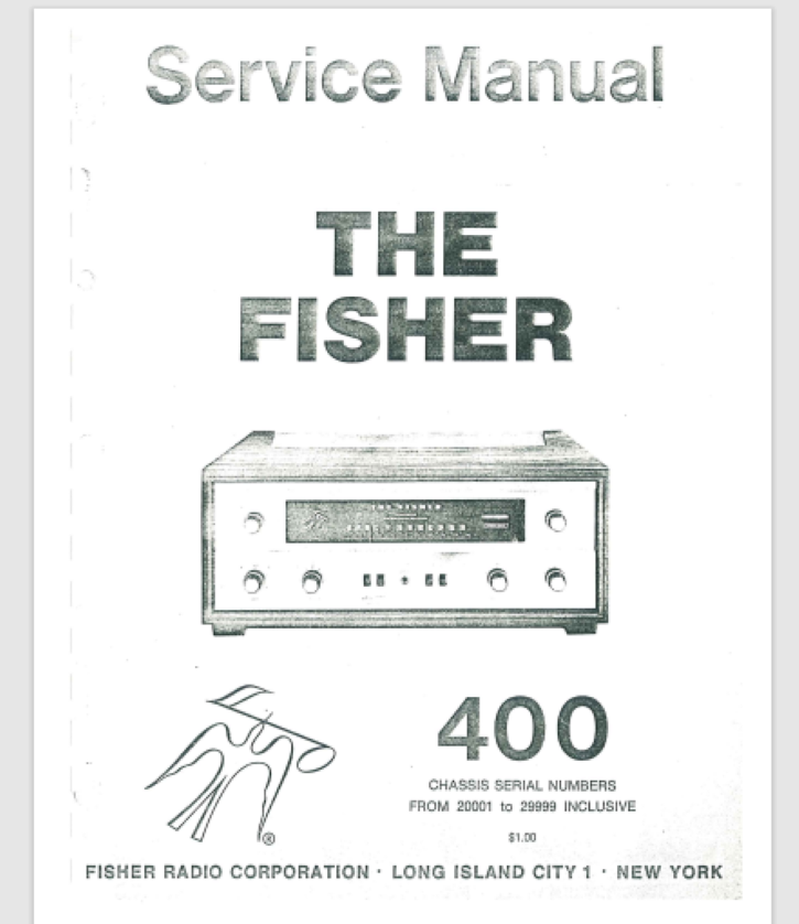Fisher stereo 400 Service Manual 10 pages New reproduction of service manual Glossy protective covers front and back Heavy card stock front and back covers. Comb binding 8 1/2 X 11" format Made in the USA