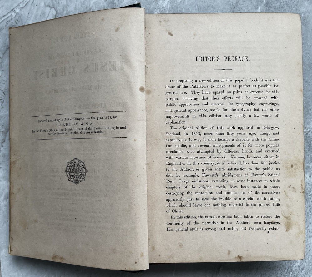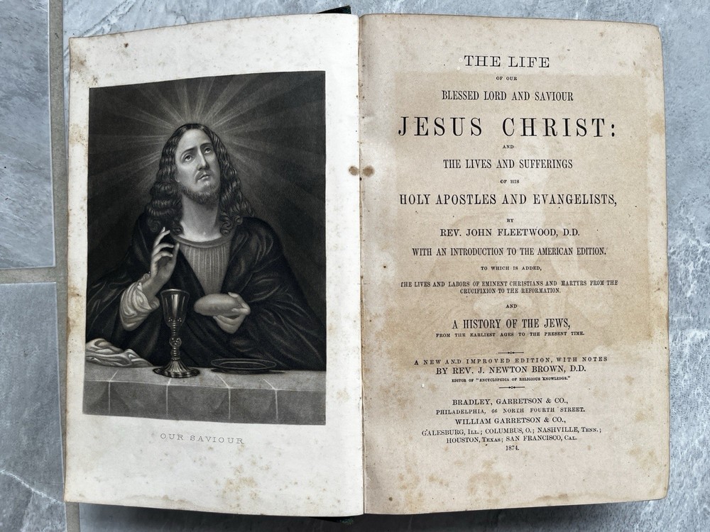 This antique book, titled "LIFE OF CHRIST" and written by REV. JOHN FLEETWOOD, D.D., was published by BRADLEY & CO. The book is bound in leather and has been illuminated with beautiful designs. It is written in English and the subject matter is the life of Jesus Christ. This book is a great addition to any collection and is perfect for those interested in religion and spirituality.