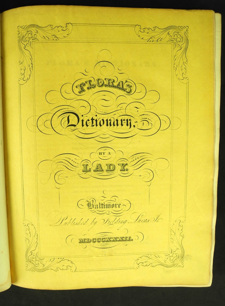 Flora's Dictionary was first published in 1829, with the authorship being credited simply to "a Lady". The book was exceedingly popular, going through several re-printings before, in 1835, Wirt was finally credited as the author under the byline "Mrs. E. W. Wirt of Virginia". This copy does not include illustrations. S8D - E