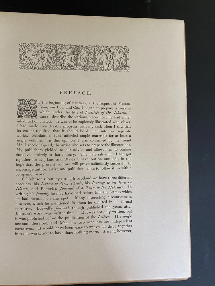 Footsteps of Dr. Johnson (Scotland). George Birkbeck Hill. With illustrations by Launcelot Speed. Sampson, Low, Marston, Searle & Rivington. London, 1890. Quarter roan, 318 pp. Bookplate removed from front endpaper. A Very Good copy.