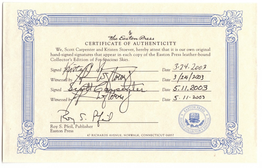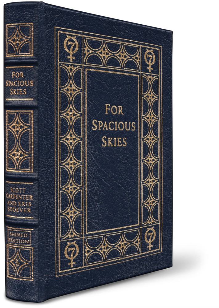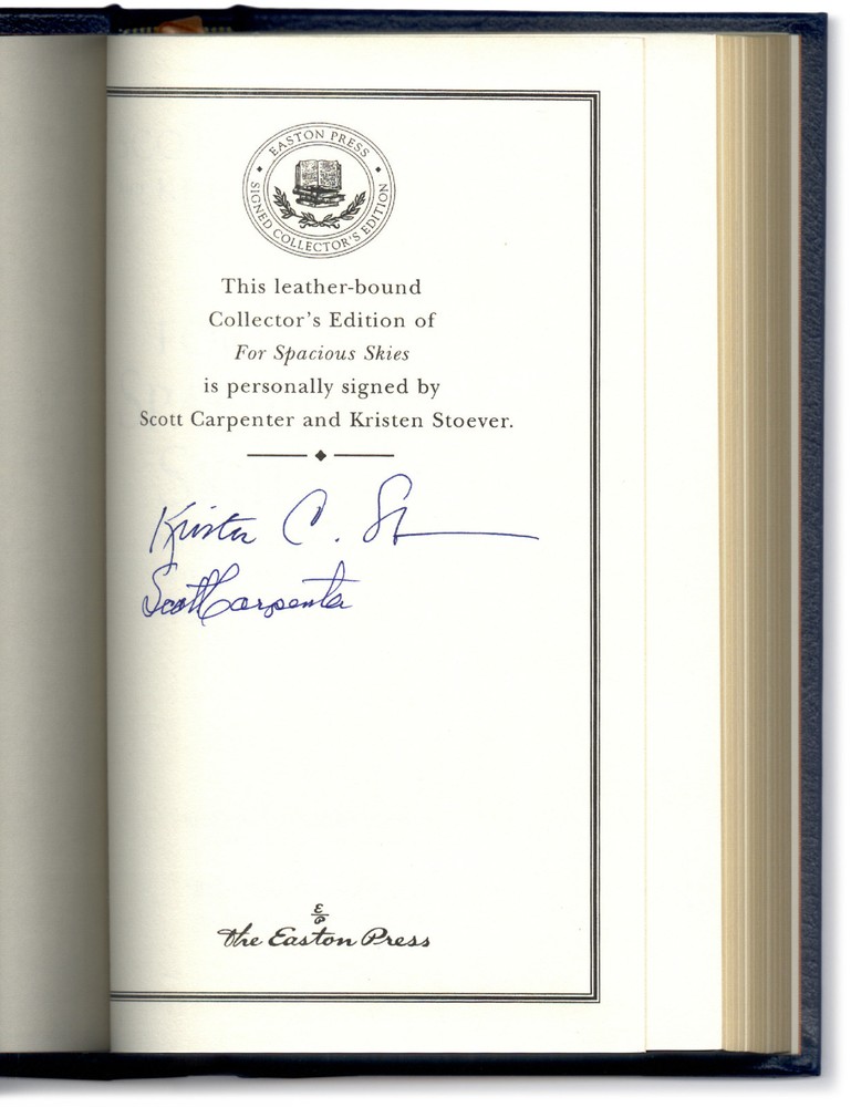 Scott Carpenter with Kris Stoever. For Spacious Skies: The Uncommon Journey Of A Mercury Astronaut . Signed by Scott Carpenter and Kris Stoever on the colophon. Norwalk, CT: Easton Press, 2003. First Limited edition / First printing. Navy leather. xiii, 370 pages. Very fine. Certificate of Authenticity laid in. Carpenter was one of the original Mercury 7, and our fourth man in space. Carpenter went on to be an Aquanaut for the SeaLab Project. He was the author of two science fiction novels. Kris Stoever is Carpenter's daughter. Inventory 16498 We have been selling collectible books since 1992, including many signed books. We have witnessed the signatures in the majority of our signed books, and are familiar with the author's autograph on those we have purchased from reliable sources. We specialize in fine books in the categories of Art, Architecture, Photography, Cinema, Nature, Space Exploration, Literature, including Poetry and many Anthologies. We offer a wide variety of Signed Books in all of these categories and more. We take pride in offering exceptionally fine copies of the books we sell. We always pack our books to arrive at their destination in the same condition as when sent. All of our books described as First Edition are First Edition / First Printing. International orders only through Ebay's Global Shipping Program. Washington State Residents must pay Sales Tax. Payment required within 3 days of end of auction. Returns must be made within 30 days of receipt. Returned items must be well packed and in the same condition as when sent. Buyer pays for return shipping.