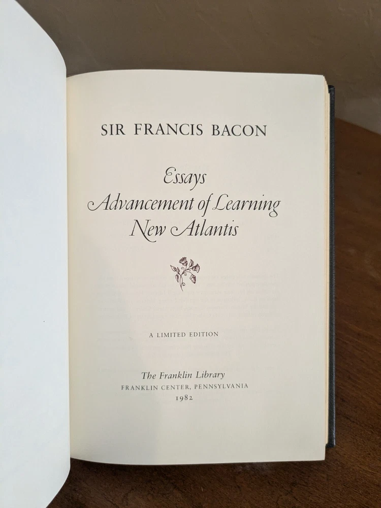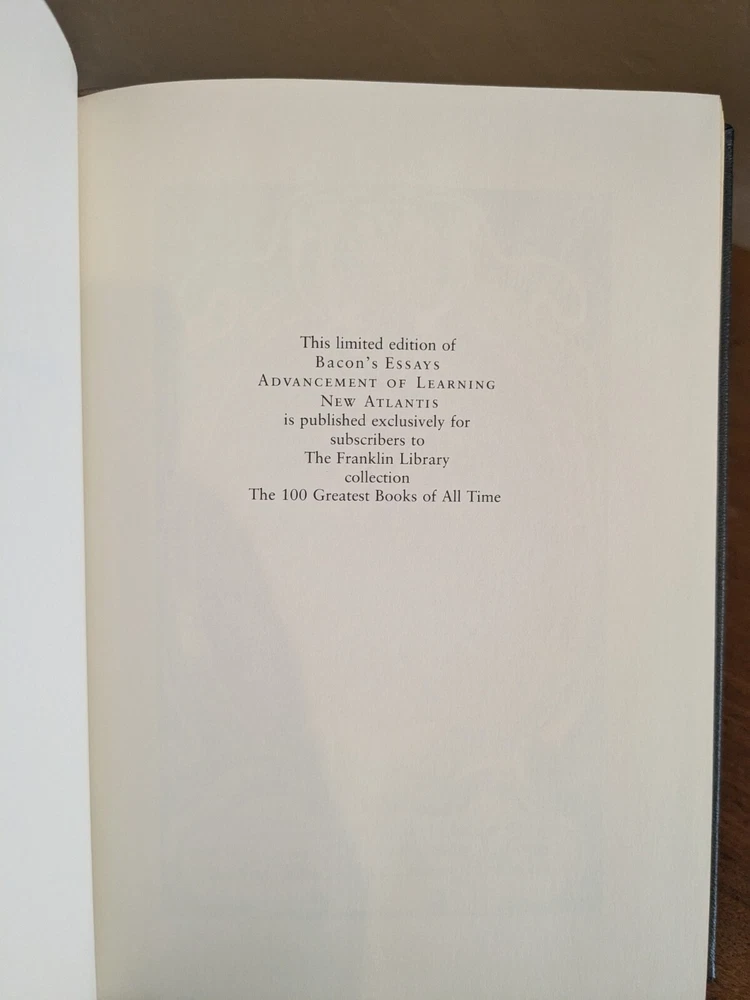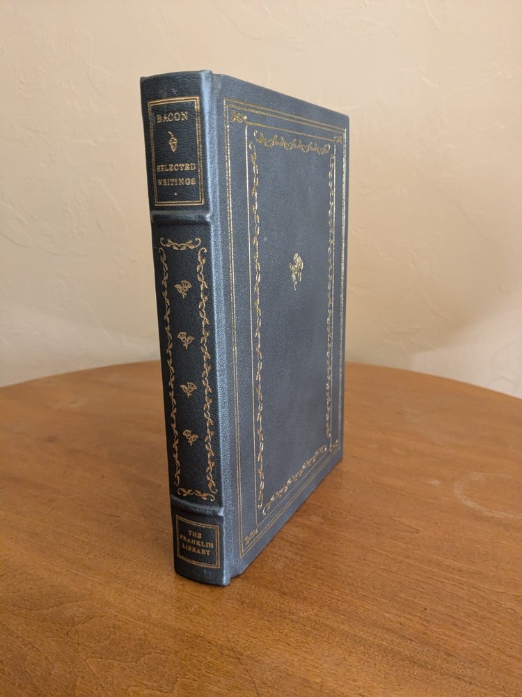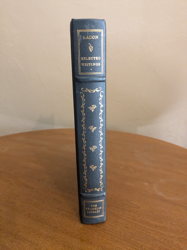 Franklin Library's Selected Writings by Sir Francis Bacon for The 100 Greatest Books of All Time series. Full leather bout with 22kt gold gilt page ends, silk moire end pages and silk marker ribbon. Book is in excellent condition. See pictures for details. No nameplates or writing evident.