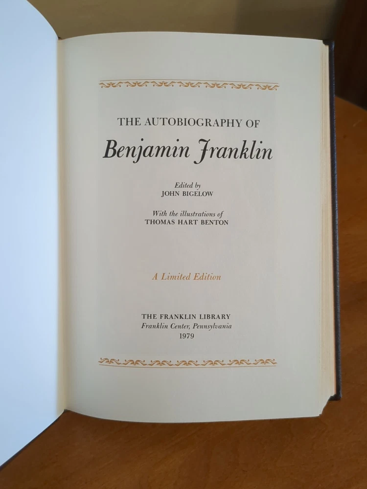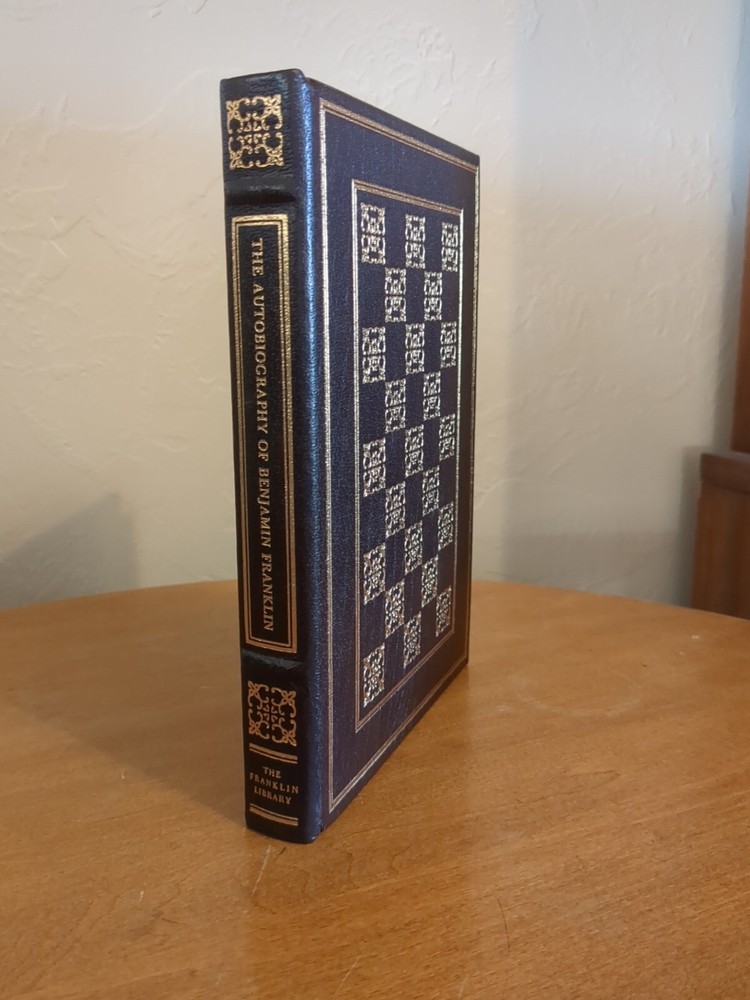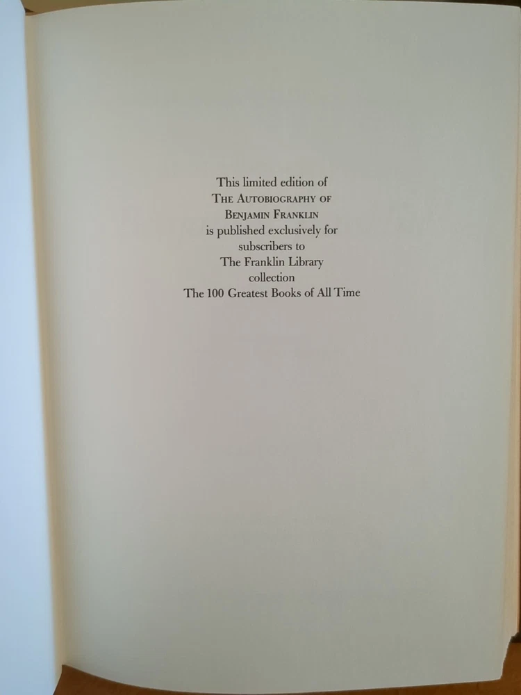 The Autobiography of Benjamin Franklin for Franklin Library's 100 Greatest Books of all Time series. Full leather bound with gold gilt page ends, silk moire end pages and silk marker ribbon. Book is in excellent used condition. See pictures for details.