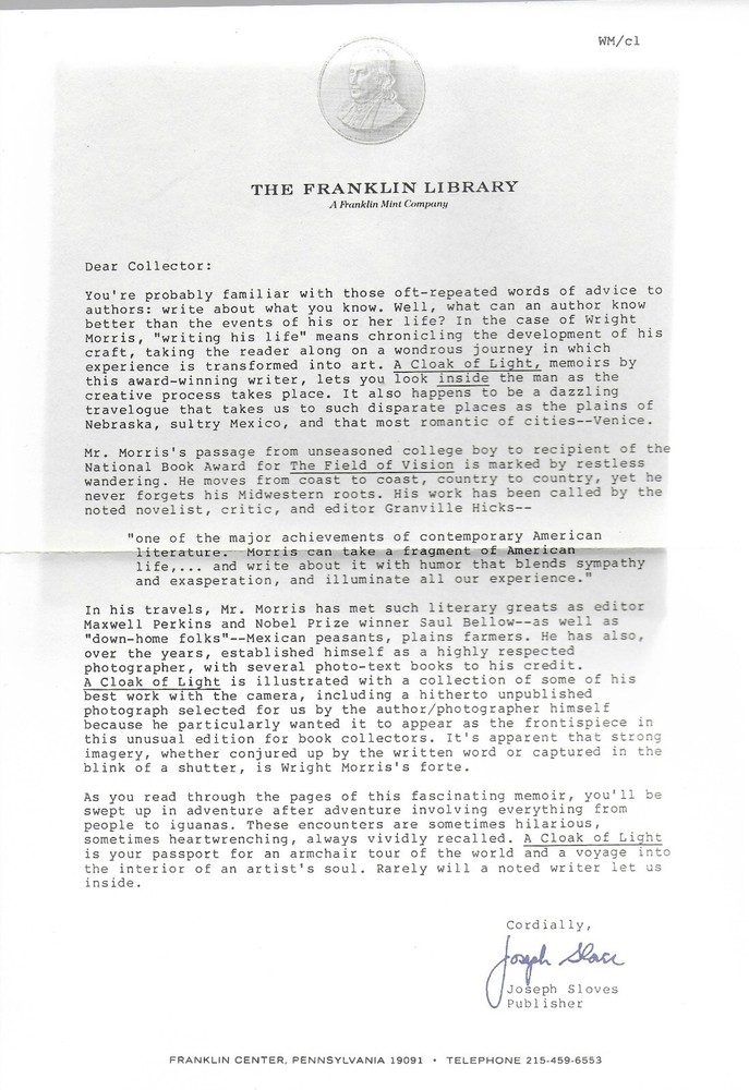 A Cloak of Light by Wright Morris Signed 1 st Edition Franklin Librar y, Illustrat ed with 29 b & w Photographs Franklin Library , Franklin Center, PA published the book, special contents copyright 19 85 . The book is part of Franklin Library’s series The Signed First Edition . The author signed the front flyleaf. The interior, beautiful leather cover, decorated end papers, and attach bookmark are in f ine condition. There are no marks, tears, or bookplates . The page edges are richly gilded to seal out moisture. The book is 6 1/2 ” x 9 1/2 ” and 3 06 pages. Laid in the front, is The Franklin Library Letter for this title. Combine Shipping Discount!!!!! Save money when you buy more than one item (lot) from us! Except in rare cases, s & h to a U. S. address via media mail in the same box is $1.35 for each additional book. eBay may automatically send a combine invoice with the wrong s & h. Please wait to pay until you receive my combine invoice with the correct s & h. PLEASE CHECK OUT MY eBAY STORE AND OTHER AUCTIONS!!! 142025112025