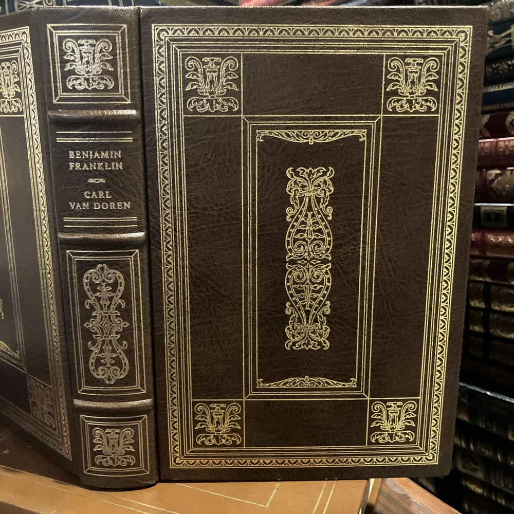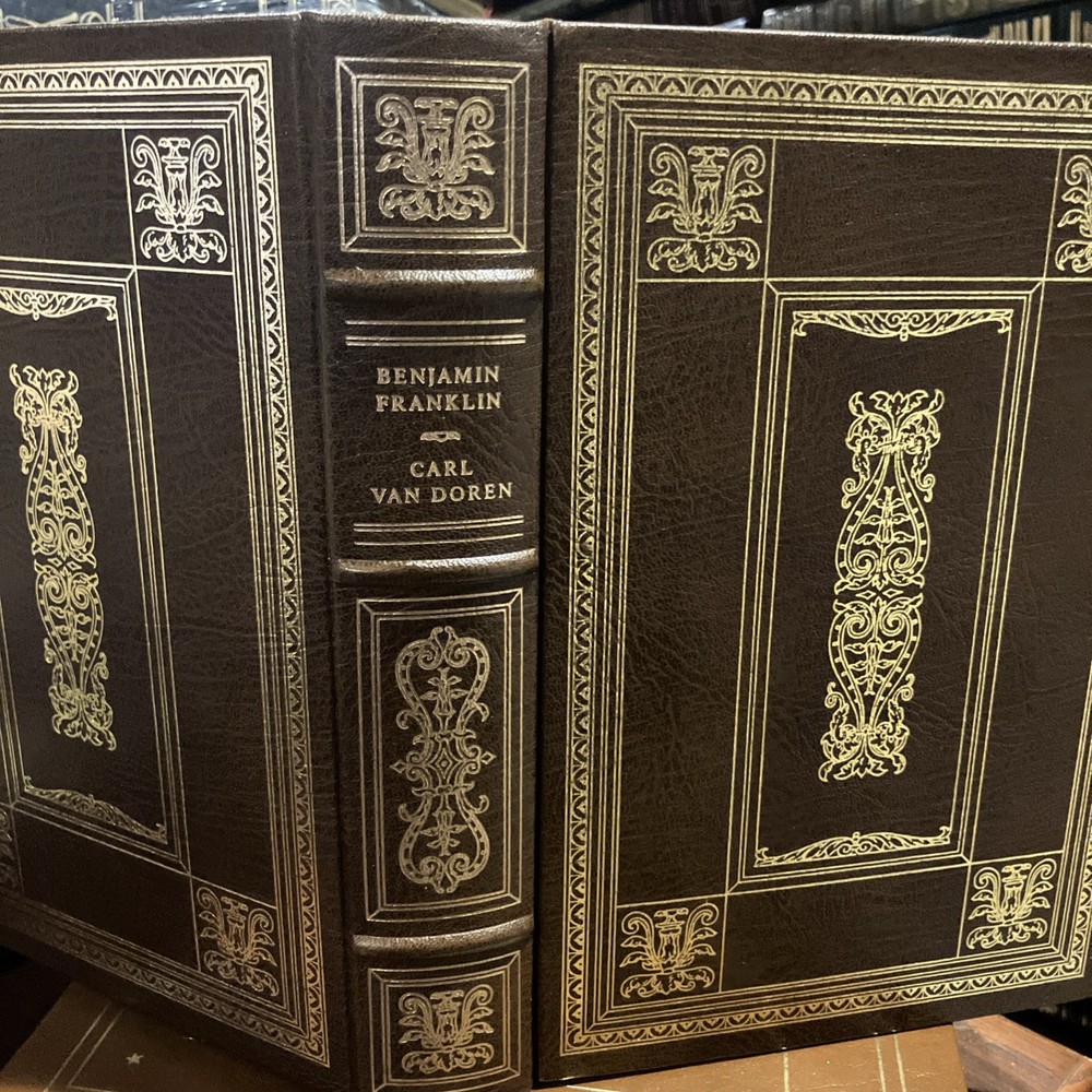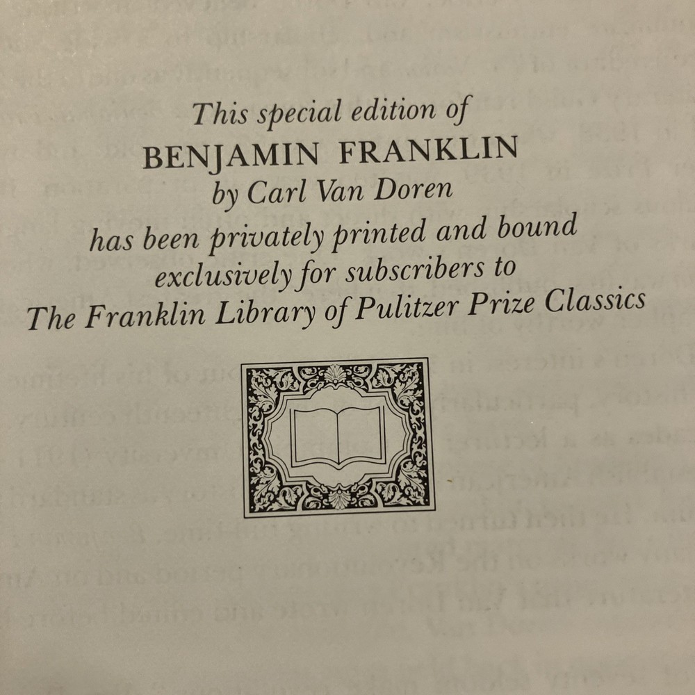 Franklin Library leather edition of Carl Van Doren's "Benjamin Franklin," a Limited edition, Illustrated with portraits of BEN FRANKLIN, one of the PULITZER PRIZE CLASSICS series, published in 1983. Bound in brown leather, the book has marbled paper end leaves, acid-free paper, Symth-sewn binding, hubbed spine, a satin book marker, gold gilding on three edges---in near FINE condition---most would list as FINE. Benjamin Franklin lived from 1706--1790. "Men of seventy seldom make revolutions," Van Doren wrote, but Franklin was no ordinary man." As a historian, Van Doren knew the value of allowing genius the opportunity to speak for himself. Franklin's life was long and full, and his contributions to cultural, scientific, and political life were incredible! Franklin left Boston at age seventeen and secretly sailed to Philadelphia where at the age of twenty-two he opened his own printing shop. Franklin became the postmaster of Philadelphia in 1737 and in 1751; he was elected member of the Assembly for the City of Philadelphia. Franklin married Deborah Read and she helped Franklin in the Post Office. Franklin was a Founding Father of the U.S., a leading author, printer, political theorist, politician, free mason, postmaster, scientist, inventor, civic activist, statesman, and diplomat. As a scientist, he was a major figure in the American Enlightenment and the history of physics for his discoveries and theories regarding electricity. As an inventor, he is known for the lighting rod, bifocals and the Franklin stove. He facilitated many civic organizations, including Philadelphia's fire department and the University of Pennsylvania. As the first U.S. Ambassador to France, he exemplified the emerging American nation. Franklin was foundational in defining the American ethos as a marriage of the practical values of thrift, hard work, education, community spirit, self-governing institutions, and opposition to authoritarianism both political and religious. An accomplished diplomat, he was widely admired among the French as American minister to Paris. When Abigail Adams arrived in Paris in 1784, she asked to dine at Franklin's house where she met MADAME HELVETIUS, who Mrs. Adams described as "untidy, noisy and brazen. She called Dr. Franklin merely Franklin, kissed his cheeks and forehead, sat beside him at dinner sometime holding his hand. I should have been astonished if the good Doctor had not told me that in this lady I should see a genuine Frenchwoman." "Taught from her childhood to venerate the great Franklin, the Puritan lady was shocked to find that Madame Helvetius was so bold with him and that he liked it." Franklin supposedly proposed marriage to Madame Helvetius, but how seriously he meant it is uncertain. However, if in France there was a new woman whom Franklin loved and who loved him, he lost none of his old friends. His efforts proved vital for the American Revolution in securing shipments of crucial munitions from France. From 1785 to 1788, he served as governor of Pennsylvania. His colorful life and legacy of scientific and political achievement, and his status as one of America's most influential Founding Fathers have seen Franklin honored more than two centuries after his death on coinage and the $100 bill, warships, and names of many towns, counties, educational institutions, and corporations. Franklin became famous for his proverbs such as: "Who riseth late trots all day, because he is behind in his business," "The Tongue talks at the head's costs," or "Nothing can be humbler than ambition, when it is so disposed." "Haste makes waste," "Eat to live, and not live to eat," "Keep your eyes wide open before marriage, half shut afterwards." THOMAS JEFFERSON, who replaced Franklin as minister to France, wrote in 1791, "The succession to Dr. Franklin at the court of France was an excellent school of humility. No one can replace him, I am only his successor." In the Preface, Van Doren, who taught at COLUMBIA UNIVERSITY for two decades wrote: "This biography does into detail because Franklin led a detailed life." When the book was originally published in 1938, it was on the non-fiction best-sellers list for months and was awarded the PULTIZER PRIZE in 1939. Van Doren's book combines meticulous scholarship with direct and moving language. 845 pages, including a bibliography, Chapter References, and an index. I offer Combined shipping.