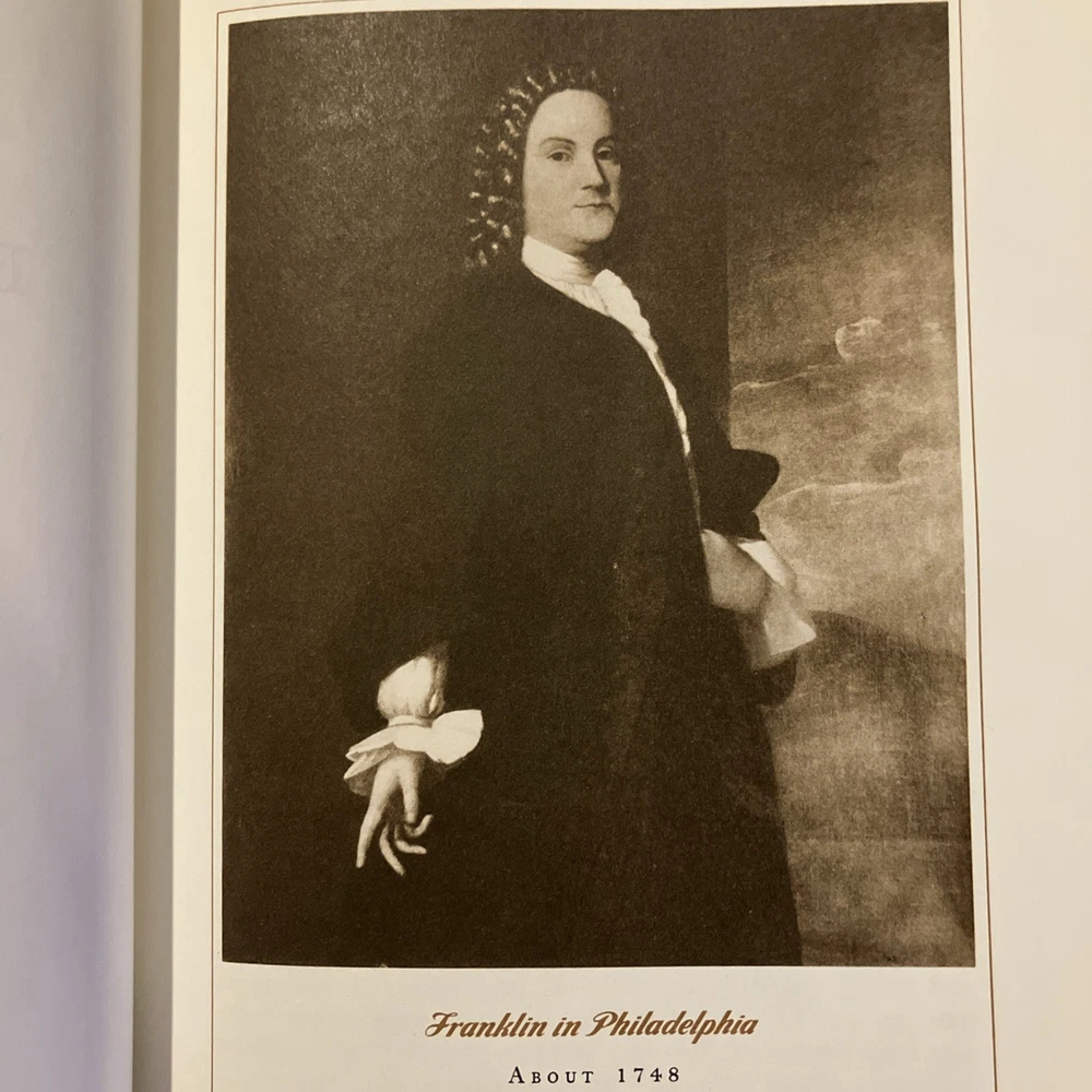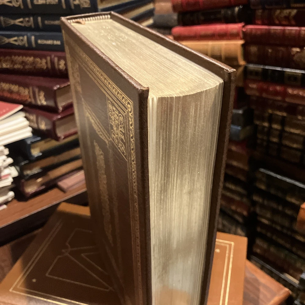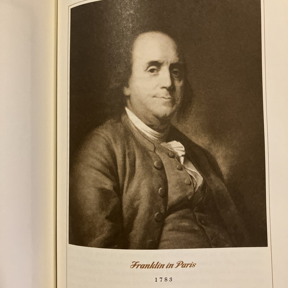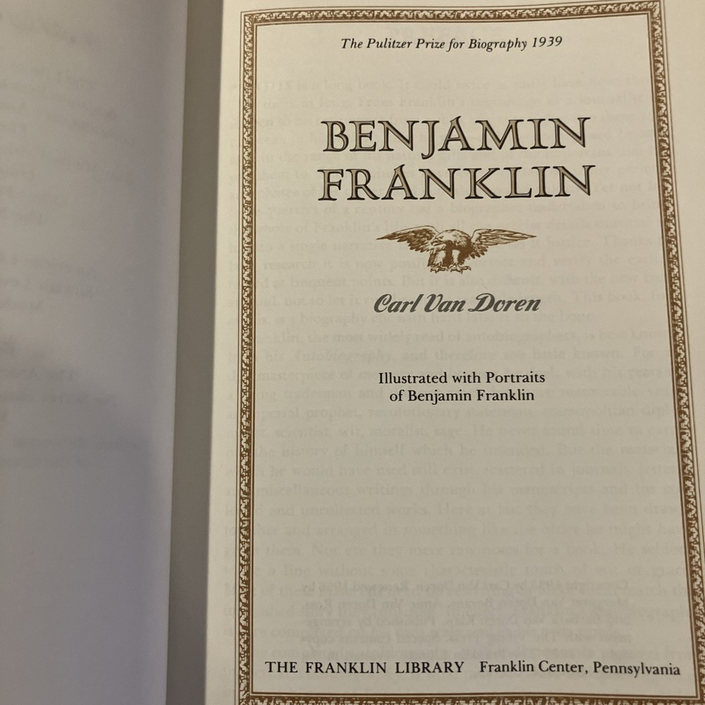 Franklin Library leather edition of Carl Van Doren's "Benjamin Franklin," a Limited edition, Illustrated with portraits of BEN FRANKLIN, one of the PULITZER PRIZE CLASSICS series, published in 1983. Bound in brown leather, the book has marbled paper end leaves, acid-free paper, Symth-sewn binding, hubbed spine, a satin book marker, gold gilding on three edges---in near FINE condition---most would list as FINE. Benjamin Franklin lived from 1706--1790. "Men of seventy seldom make revolutions," Van Doren wrote, but Franklin was no ordinary man." As a historian, Van Doren knew the value of allowing genius the opportunity to speak for himself. Franklin's life was long and full, and his contributions to cultural, scientific, and political life were incredible! Franklin left Boston at age seventeen and secretly sailed to Philadelphia where at the age of twenty-two he opened his own printing shop. Franklin became the postmaster of Philadelphia in 1737 and in 1751; he was elected member of the Assembly for the City of Philadelphia. Franklin married Deborah Read and she helped Franklin in the Post Office. Franklin was a Founding Father of the U.S., a leading author, printer, political theorist, politician, free mason, postmaster, scientist, inventor, civic activist, statesman, and diplomat. As a scientist, he was a major figure in the American Enlightenment and the history of physics for his discoveries and theories regarding electricity. As an inventor, he is known for the lighting rod, bifocals and the Franklin stove. He facilitated many civic organizations, including Philadelphia's fire department and the University of Pennsylvania. As the first U.S. Ambassador to France, he exemplified the emerging American nation. Franklin was foundational in defining the American ethos as a marriage of the practical values of thrift, hard work, education, community spirit, self-governing institutions, and opposition to authoritarianism both political and religious. An accomplished diplomat, he was widely admired among the French as American minister to Paris. When Abigail Adams arrived in Paris in 1784, she asked to dine at Franklin's house where she met MADAME HELVETIUS, who Mrs. Adams described as "untidy, noisy and brazen. She called Dr. Franklin merely Franklin, kissed his cheeks and forehead, sat beside him at dinner sometime holding his hand. I should have been astonished if the good Doctor had not told me that in this lady I should see a genuine Frenchwoman." "Taught from her childhood to venerate the great Franklin, the Puritan lady was shocked to find that Madame Helvetius was so bold with him and that he liked it." Franklin supposedly proposed marriage to Madame Helvetius, but how seriously he meant it is uncertain. However, if in France there was a new woman whom Franklin loved and who loved him, he lost none of his old friends. His efforts proved vital for the American Revolution in securing shipments of crucial munitions from France. From 1785 to 1788, he served as governor of Pennsylvania. His colorful life and legacy of scientific and political achievement, and his status as one of America's most influential Founding Fathers have seen Franklin honored more than two centuries after his death on coinage and the $100 bill, warships, and names of many towns, counties, educational institutions, and corporations. Franklin became famous for his proverbs such as: "Who riseth late trots all day, because he is behind in his business," "The Tongue talks at the head's costs," or "Nothing can be humbler than ambition, when it is so disposed." "Haste makes waste," "Eat to live, and not live to eat," "Keep your eyes wide open before marriage, half shut afterwards." THOMAS JEFFERSON, who replaced Franklin as minister to France, wrote in 1791, "The succession to Dr. Franklin at the court of France was an excellent school of humility. No one can replace him, I am only his successor." In the Preface, Van Doren, who taught at COLUMBIA UNIVERSITY for two decades wrote: "This biography does into detail because Franklin led a detailed life." When the book was originally published in 1938, it was on the non-fiction best-sellers list for months and was awarded the PULTIZER PRIZE in 1939. Van Doren's book combines meticulous scholarship with direct and moving language. 845 pages, including a bibliography, Chapter References, and an index. I offer Combined shipping.