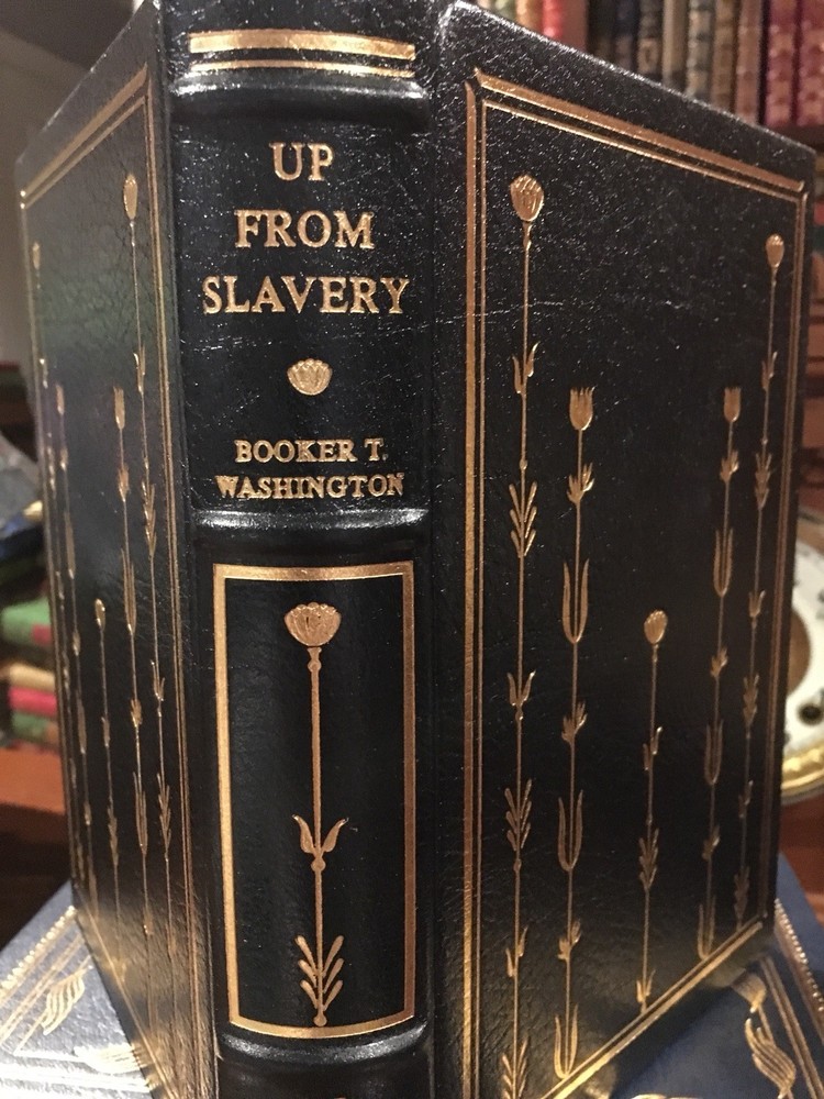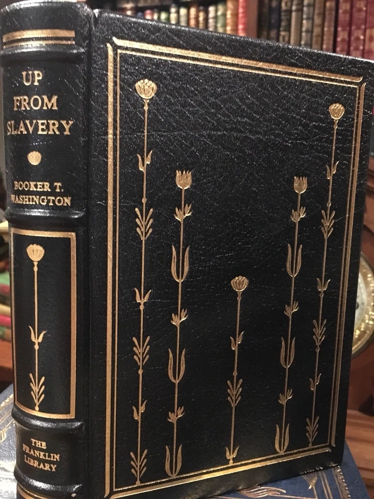 Franklin Library leather edition of Booker T. Washington's "Up From Slavery: An Autobiography," a Limited edition, Illustrated by Bart Forbes, one of the 100 GREATEST MASTERPIECES OF AMERICAN LITERATURE series, published in 1977. Bound in navy blue leather, the book has ivory moire silk end leaves, a satin book marker, Symth-sewn binding, acid-free paper, hubbed spine, and gold gilding on three edges---in near FINE condition. Booker Taliaferro Washington, who lived from 1856-1915, was the son of a Negro slave and a white man. He became a leading educator of Negroes. After graduation from the Negro vocational school, HAMPTON INSTITUTE, he founded TUSKEGEE NORMAL and INDUSTRIAL INSTITUTE which emphasized industrial training. "Up from Slavery," which was originally published in 1901, is the story of his life and his struggles. At Tuskegee, Booker T. taught the African American students "cleanliness and orderliness" and when white supporters visited the Alabama campus, he taught the students to show "deference" to their white 'superiors' by stepping off the sidewalk to allow the white folks to pass. He organized a curriculum that stressed the "mechanical arts" or practical studies---as opposed to classical liberal arts education that required 'critical thinking' and abstract reasoning. He was the African American leader who said that African Americans did not want to attend white colleges and public schools, preferring "separate but equal" facilities. Booker T. Washington was in conflict with W.E.B. Dubois who argued for classical learning. 307 pages. I offer Combined shipping.
