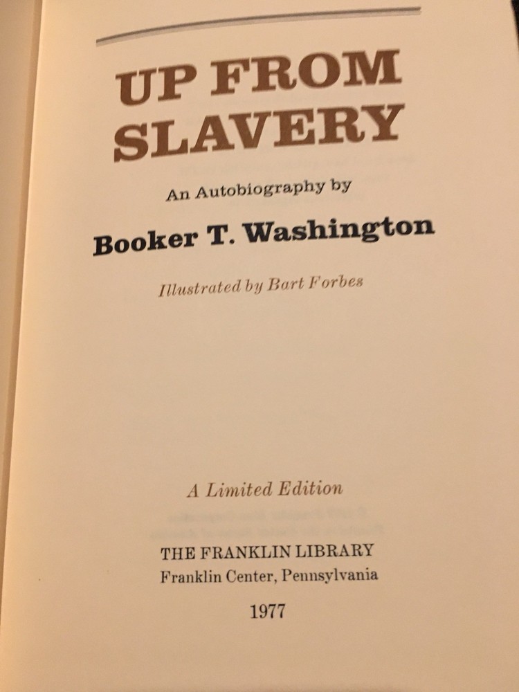 Franklin Library leather edition of Booker T. Washington's "Up From Slavery: An Autobiography," a Limited edition, Illustrated by Bart Forbes, one of the 100 GREATEST MASTERPIECES OF AMERICAN LITERATURE series, published in 1977. Bound in navy blue leather, the book has ivory moire silk end leaves, a satin book marker, Symth-sewn binding, acid-free paper, hubbed spine, and gold gilding on three edges---in near FINE condition. Booker Taliaferro Washington, who lived from 1856-1915, was the son of a Negro slave and a white man. He became a leading educator of Negroes. After graduation from the Negro vocational school, HAMPTON INSTITUTE, he founded TUSKEGEE NORMAL and INDUSTRIAL INSTITUTE which emphasized industrial training. "Up from Slavery," which was originally published in 1901, is the story of his life and his struggles. At Tuskegee, Booker T. taught the African American students "cleanliness and orderliness" and when white supporters visited the Alabama campus, he taught the students to show "deference" to their white 'superiors' by stepping off the sidewalk to allow the white folks to pass. He organized a curriculum that stressed the "mechanical arts" or practical studies---as opposed to classical liberal arts education that required 'critical thinking' and abstract reasoning. He was the African American leader who said that African Americans did not want to attend white colleges and public schools, preferring "separate but equal" facilities. Booker T. Washington was in conflict with W.E.B. Dubois who argued for classical learning. 307 pages. I offer Combined shipping.