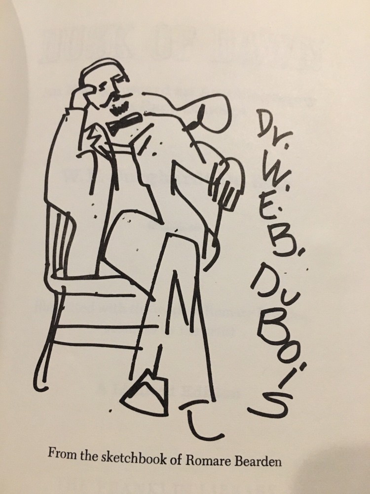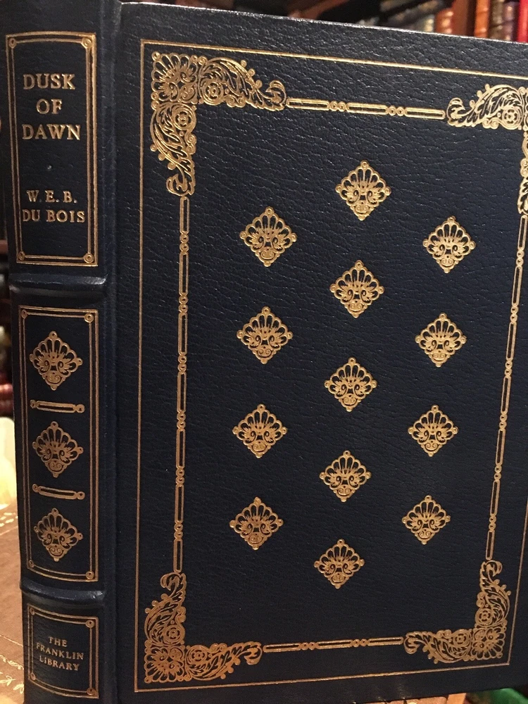 Franklin Library leather edition of W.E.B. Du Bois's "Dusk of Dawn: An Essay toward an Autobiography of a Race Concept," a Limited edition, Illustrated by ROMARE BEARDEN, one of the 100 GREATEST MASTERPIECES OF AMERICAN LITERATURE series, published in 1980. Bound in navy blue leather, the book has matching French moire silk end leaves, acid-free paper, Symth-sewn binding, a satin book marker, hubbed spine, gold gilding on three edges----in near FINE condition. William Edward Burghardt Du Bois, who lived from 1868---1963, was born in Massachusetts, educated at FISK UNIVERSITY in Nashville and HARVARD UNIVERSITY, where studied under Charles Eliot Norton, William James and George Santayana. He earned a PhD at Harvard---the first African American to do so. Du Bois taught at Wilberforce University and Atlanta University. He became the first editor of CRISIS magazine and the elder spokesperson for the NAACP. Du Bois was opposed to what he called the "Tuskegee Machine," a reference to Booker T. Washington's college that emphasized the "mechanical arts" and encouraged the black students to be deferential to white folks who visited the campus. ROMARE BEARDEN, who illustrated this volume, was the most famous African American artist of his day. 355 pages, including an Index. I offer Combined shipping.