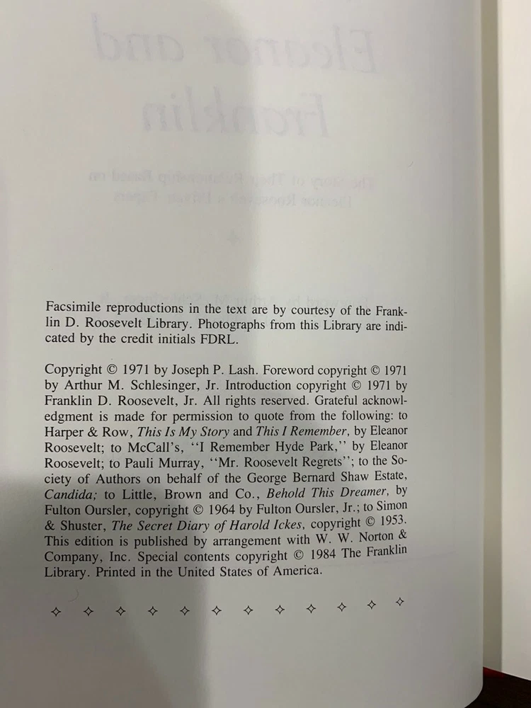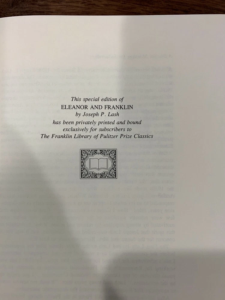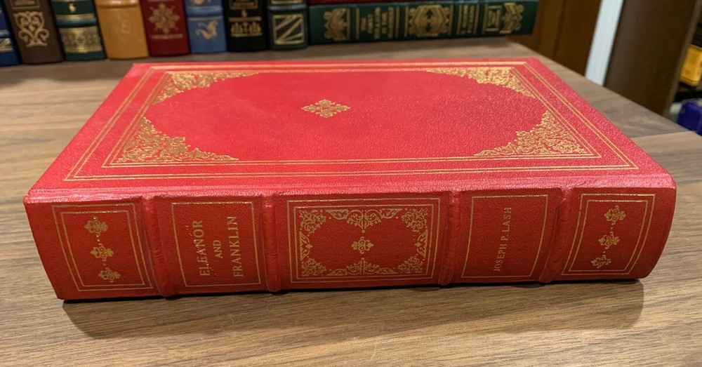 ELEANOR AND FRANKLIN by Joseph P. Lash (1984) - Franklin Library Collector's Edition Book - Limited Edition Leather Hardcover Special edition book is full leather with hubbed spine, high quality paper, pages that are sewn to the binding and gilded page edges on all 3 sides. Special features include: - Full genuine leather binding - 22k gold lettering and stampings on spine and covers - Attached silk page marker - Silk moire end papers This book is part of the the Franklin Library Pulitzer Prize Classics. This was a division of The Franklin Mint that is no longer in existence and all of their books and editions are considered "out of print" and therefore difficult to find. This Collector' s Edition was printed in 1984. The book includes photos and the book originally won a Pulitzer Prize for biography in 1972. See photos for details.