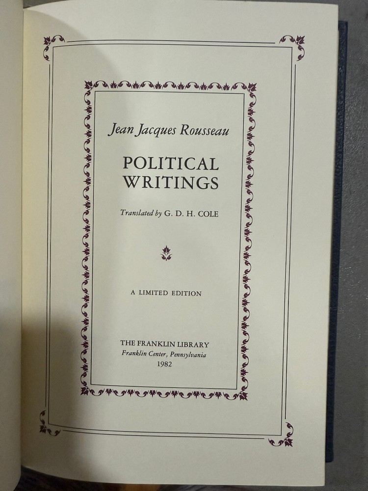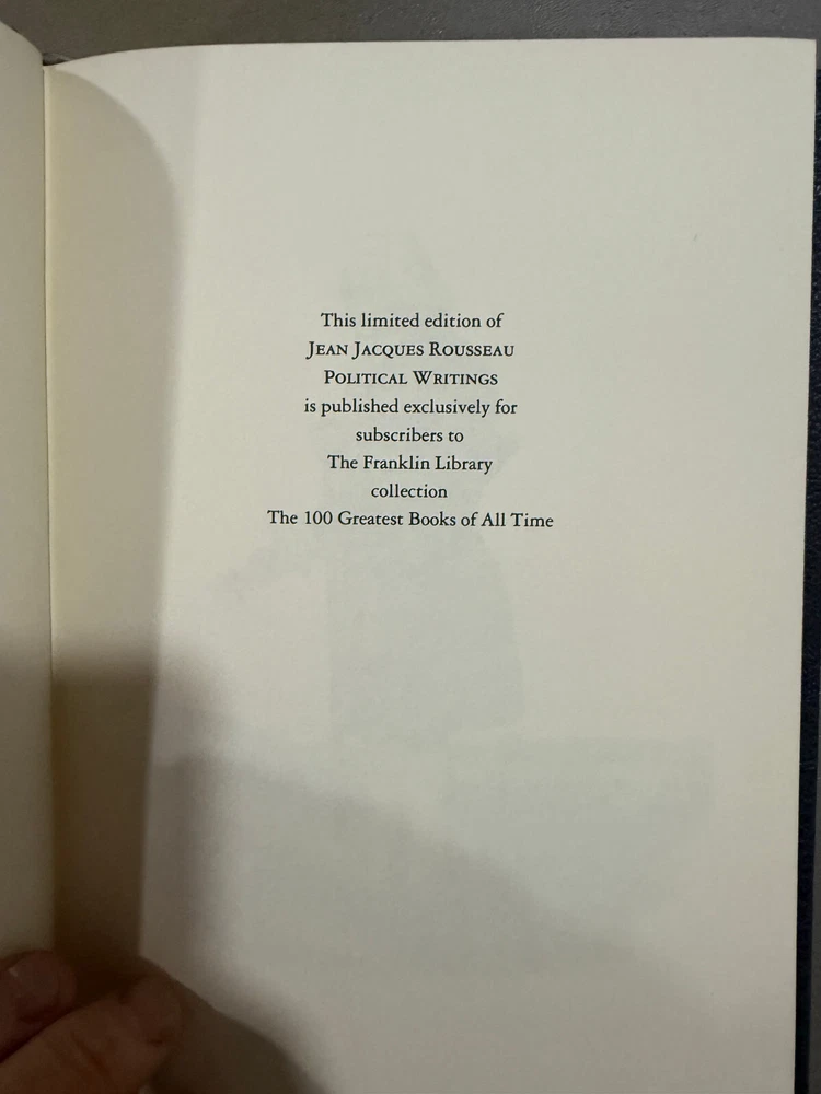 Jean Jacques Rousseau - Political Writings Franklin Library 100 Greatest Books Series Very Good Plus Condition! New Books get listed daily !!! 100s of Easton Press and Franklin Library books available!! All books get cleaned with a leather cleaner to remove any dust, odor and restore the beauty of leather!! Combined Shipping Discount: USA buyers - every book $1 off International combined shipping: 1 or 2 books - $45 3 or 4 books - $75 5 + books $17 per book 10+ books $13 per book WE SHIP DAILY!! RETURNS: Hassle-Free 30-days return policy and we pay for a return !! Check our Inventory (Link to eBay Store): http://stores.ebay.com/EastonFranklinBooks