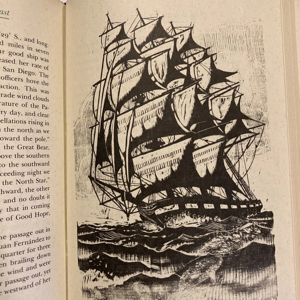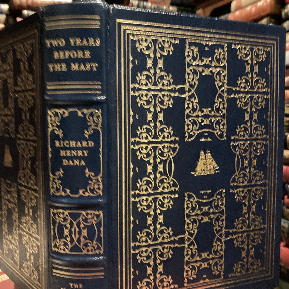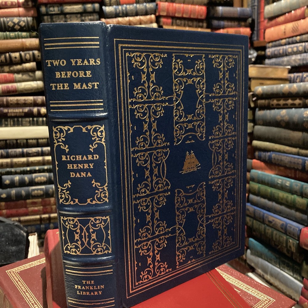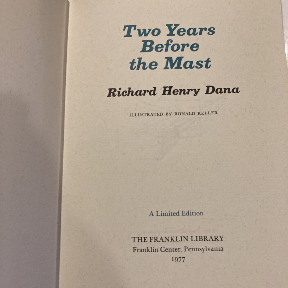 Franklin Library leather edition of Richard Henry Dana's "Two Years Before the Mast," a Limited edition, Illustrated by Ronald Keller, one of the 100 GREATEST MASTERPIECES OF AMERICAN LITERATURE series, published in 1977. Bound in navy blue leather, the book has navy blue moire silk end leaves, a satin book marker, hubbed spine, acid-free paper, gold gilding on three edges---in near FINE condition. Richard Henry Dana, who lived from 1815--1882, was an American lawyer and politician from Massachusetts, a descendant of an eminent colonial family, who gained fame for the memoir, "Two Years Before the Mast." While an undergraduate at Harvard College, Dana had an attack of the measles which affected his vision. Thinking it might help his sight, Dana left Harvard to enlist as a common sailor on a voyage around CAPE HORN on the brig PILGRIM. He returned to Massachusetts two years later, aboard the Alert (which left California sooner than the Pilgrim ). He kept a diary throughout the voyage, and, after returning, he wrote a recognized American classic, " Two Years Before the Mast ," published in 1840. The term "before the mast" refers to the quarters of the common sailors, in the forecastle, in the front of the ship. His writing evidences his later sympathy with the lower classes. He later became a prominent anti-slavery activist and helped found the Free Soil Party. In the book, which takes place between 1834 and 1836, Dana gives a vivid account of "the life of a common sailor at sea as it really is." He sails from Boston to South America and around Cape Horn to California. Dana's ship was on a voyage to trade goods from the United States for the Mexican colonial Californian missions' and ranchos' cow hides. They traded at the ports in San Diego Bay, San Pedro Bay, Santa Barbara Channel, Monterey Bay, and San Francisco Bay. B oth as a writer and as a lawyer, he was a champion of the downtrodden, from seamen to fugitive slaves and freedmen. Dana captures the tedious, difficult work of a sea man. The chapter with the brutal flogging is a real life witnessing. 555 pages. I offer Combined shipping.