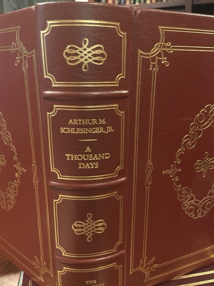 Franklin Library leather edition of Arthur Schlesinger's "A Thousand Days: John F. Kennedy in the White House," a Limited edition, Personally Signed by ARTHUR SCHLESINGER, published in 1979. Bound in a deep camel tan leather, the book has burnt orange French moire silk end leaves, a satin book marker, acid-free paper, Symth-sewn binding, hubbed spine, gold gilding on three edges---in near FINE condition. John Fitzgerald "Jack" Kennedy, who lived from 1917 – 1963, was an American politician who served as the 35th President of the United States from January 1961 until his assassination in November 1963. The CUBAN MISSILE CRISES, the BAG OF PIGS INVASION, the NUCLEAR TEST BAN TREATY, the establishment of the PEACE CORPS, developments in the SPACE RACE, the building of the BERLIN WALL, the CIVIL RIGHTS MOVEMENT, the "New Frontier" domestic program, and abolition of the federal death penalty in the District of Columbia--- all took place during his presidency. Kennedy also avoided any significant increase in the American presence in Vietnam, refusing to commit combat troops and keeping the level of others, mostly military advisors, to only 16,000. JFK graduated from Harvard University. After military service in the U.S. Naval Reserve in World War II, Kennedy represented Massachusetts in the U.S. House of Representative from 1947 to 1953 as a Democrat. Thereafter, he served in the U.S. Senate from that state from 1953 until 1960. Kennedy defeated Vice President and Republican candidate RICHARD NIXON in the 1960 U.S. Presidential Election. At age 43, he was the youngest man to have been elected to the office, and the first person born in the 20th century to serve as president; to date, he has been the only Roman Catholic president. Schlesinger's biography is the "definitive" work and Mrs. Kennedy and the Kennedy family gave exclusive interviews and he had access to papers other writers did not have. 937 pages, including an Index. I offer Combined shipping.