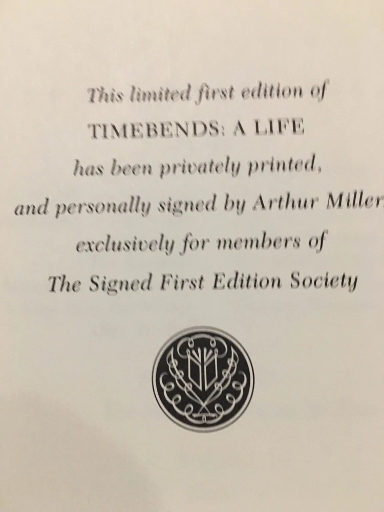Franklin Library leather edition of Arthur Miller's "Timebends: A Life," Frontispiece Portrait by Christine Bunn, a limited edition, one of the SIGNED FIRST EDITION SOCIETY series, published in 1987. Bound in red leather, the book has decorative paper end leaves, a satin book marker, acid-free paper, Symth-sewn binding, gold gilding on three edges---in near Fine condition. Arthur Asher Miller, who lived from 1915 – 2005, was a prolific American playwright, essayist, and prominent figure in twentieth-century American theatre. Among his most popular plays are "All My Sons," "Death of a Salesman," "The Crucible," "A View from the Bridge, and The Misfits." Miller was born in Harlem of Polish Jewish parents. In the Wall Street Crash on 1929, the family lost almost everything. As a teenager, Miller delivered bread every morning before school to help the family. After graduating high school in 1932 he worked at several menial jobs to pay for his college tuition before enrolling at the UNIVERSITY OF MICHIGAN where he began writing plays. Miller retained strong ties to his alma mater throughout the rest of his life. After his graduation in 1938, he joined the Federal Theatre Project, a NEW DEAL agency established to provide jobs in the theater. In 1940, Miller married Mary Grace Slattery and they became parents to two children. Miller was exempted from military service during World War II because of a high-school football injury injury to his left kneecap. 1940 was also the year his first play was produced; "The Man Who Had All the Luck" won the Theatre Guild's National Award. In 1947, Miller's play "All My Sons" was a success on BROADWAY, earning him his first TONY AWARD and his reputation as a playwright was established. In 1948, Miller wrote "Death of a Salesman." and the play premiered on Broadway on February 10, 1949, directed by ELIA KAZAN, and starring Lee J. Cobb as Willy Loman and Mildred Dunnock as Linda. The play was commercially successful and critically acclaimed, winning a numerous award, including the New York Drama Critics' Award and the Pulitzer Prize. The play was performed 742 times. In 1955, Miller's "A View from the Bridge" opened on Broadway. In 1956, Miller married MARILYN MONROE. Miller was subpoenaed by the HUAC. Miller wrote the screenplay "The Misfits" and Marilyn Monroe was given the leading role. In 1961, Miller and Monroe divorced after their five years of marriage. Nineteen months later, Monroe died of a likely drug overdose. 614 pages---in a GORGEOUS, SIGNED binding! I offer Combined shipping.
