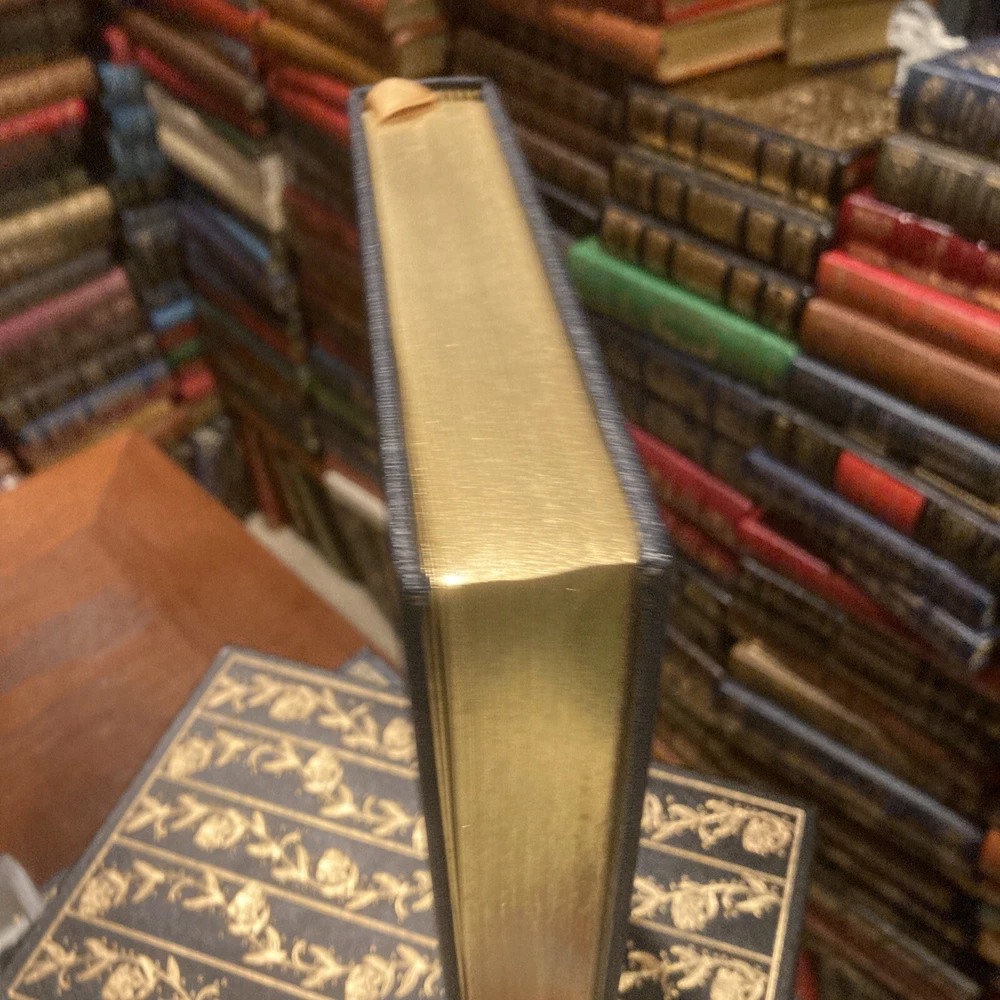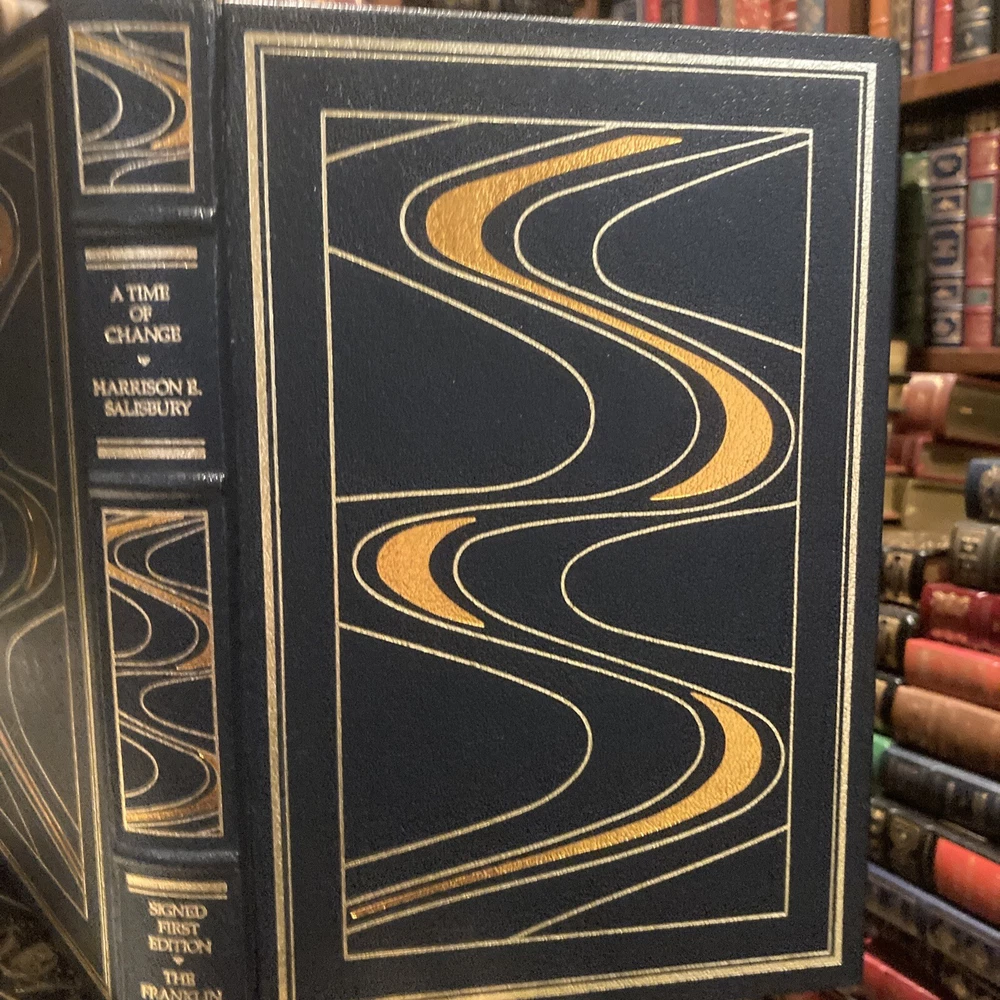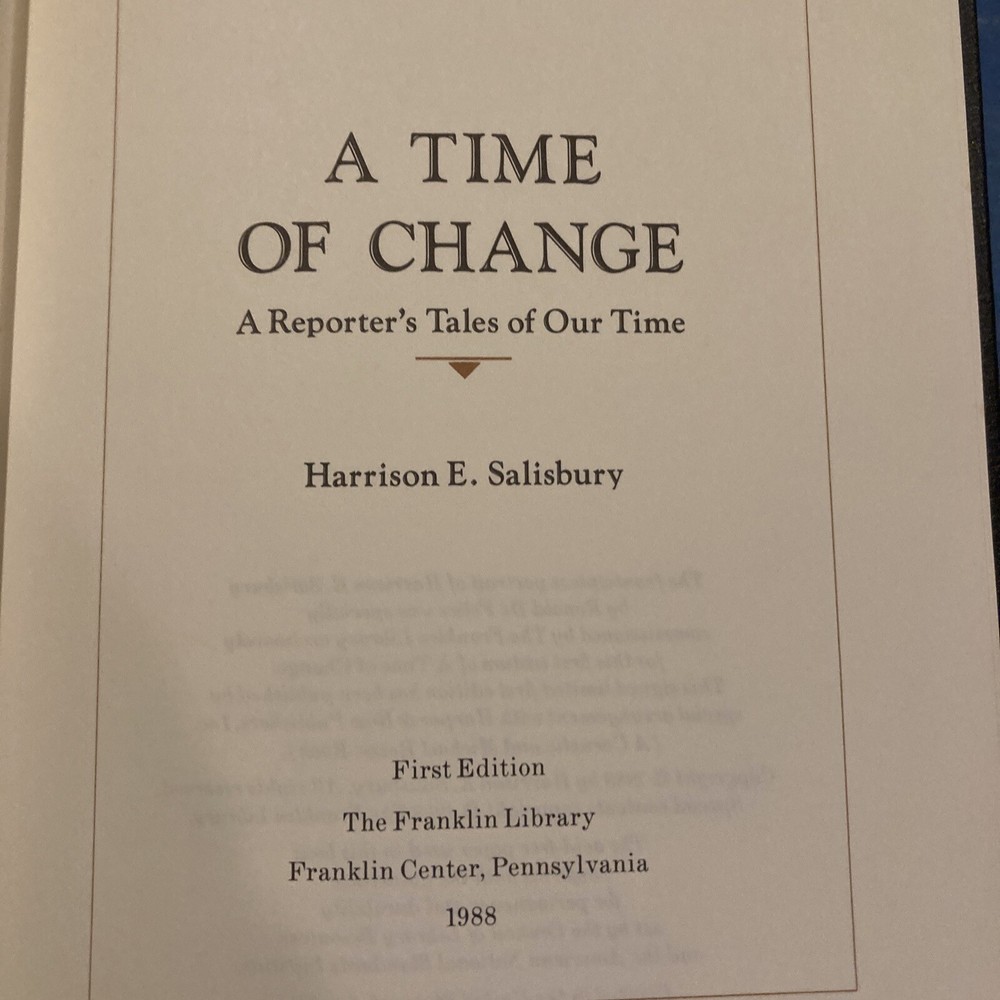 Franklin library leather edition of Harrison Salisbury's "A Time of Change," Frontispiece Portrait of Harrison Salisbury by Ronald De Felice, a First edition, PERSONALLY SIGNED by HARRISON SALISBURY, one of the SIGNED FIRST EDITION SOCIETY series, published in 1988. Bound in hunter green leather, the book has decorative paper end leaves, a satin book marker, acid-free paper, Symth-sewn binding, gold gilding on three edges---in near FINE condition---except for minor 'foxing' on gilt on fore edge. Harrison Evans Salisbury , who lived from 1908 – 1993, was an American journalist and the first regular New York Times correspondent in MOSCOW after World War II. He was born in Minneapolis, Minnesota, and graduated from University of Minnesota in 1930. He spent nearly 20 years with United Press (UP), much of it overseas, and was UP's foreign editor during the last two years of World War II. He joined the NEW YORK TIMES in 1949 and became their Moscow correspondent, traveling widely in Siberia, Central Asia and Outer Mongolia along China's borders. In a 'special message,' Salisbury wrote: "The world into which I was born was a Victorian world. In 1908 Queen Victoria had been dead for seven years but she still reigned in the gabled house kept by my father in Minneapolis. . ." "I have spent quote a lot of time on the fission lines of our day---wartime Europe, the Middle East, Russia, China, Southeast Asia, and the barricades of our own America in the 1960s. We have come to think of Russia as a country invented by Lenin and perfected by Stalin but Russia was Russia for hundreds of years before 1917. Russian imperialism was invented by the Czars, not the commissars. Stalin's ikons were Ivan the Dread, Peter the Great, and Nicholas I. Mao Zedong slept in the same Ming Palace as did his predecessors. Salisbury has traveled the globe, earning a reputation as a tough and knowledgeable journalist. He was awarded the PULITZER PRIZE for International Reporting in 1955 and was nominated for a second Pulitzer in 1967 for his hard-hitting reports from Hanoi during the VIETNAM WAR. Salisbury knew every president since DWIGHT EISENHOWER, and met with heads of state of CHINA and the SOVIET UNION. He and his wife trekked the Long March, retracing the 1934-35 Mao Zedong 'Long March,' a 6,000-mile journey. RONALD REAGAN was making his first trip to CHINA, and "I knew that many Chinese were excited about the President's visit." "Reagan left a strong impact on Xi'an, and as I later found, in Bejing as well." Later Salisbury wrote: "I was in Moscow after the Summit at Genea in 1985. One of Mr. Gorbachev's close aides invited me to his office. He was walking on air over the Gorbachev-Reagan meeting. . .I did not meet Reagan until 1985 when I was twice invited to the White House. In the last chapter, Salisbury describes spending Christmas 1985 in Florence, Italy, where the "streets were awash with people, young, old, rich, poor, gay, and serious . . .At the Uffizi, I stood "intoxicated, my eyes brimming with joy, my mind in turmoil . . ." Folks, Salisbury knew many of the "shakers and movers" of the 20th century. 354 pages, including an Index. I offer Combined shipping.