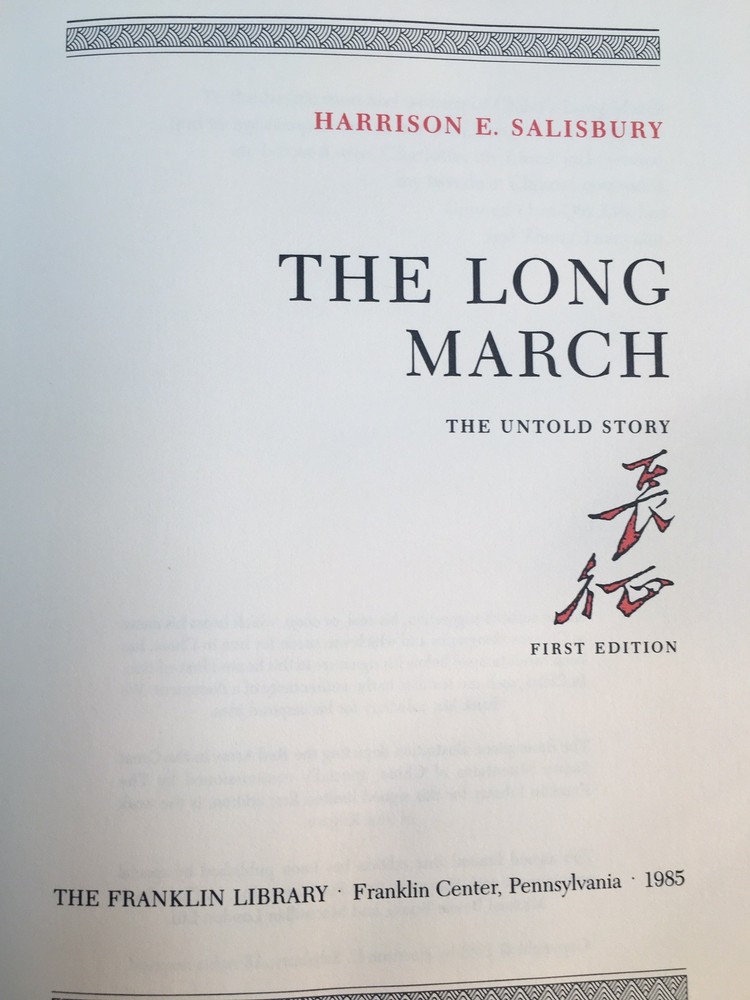 Franklin library leather edition of Harrison Salisbury's "The Long March: The Untold Truth," Frontispiece of the Red Army by Susi Kilgore, a First edition, PERSONALLY SIGNED by HARRISON SALISBURY, one of the SIGNED FIRST EDITION SOCIETY series, published in 1985. Bound in black leather, the book has decorative paper end leaves, a satin book marker, acid-free paper, Symth-sewn binding, gold gilding on three edges---in near FINE condition. Harrison Evans Salisbury , who lived from 1908 – 1993, was an American journalist and the first regular New York Times correspondent in MOSCOW after World War II. He was born in Minneapolis, Minnesota and graduated from University of Minnesota in 1930. He spent nearly 20 years with United Press (UP), much of it overseas, and was UP's foreign editor during the last two years of World War II. He joined the NEW YORK TIMES in 1949 and became their Moscow correspondent, traveling widely in Siberia, Central Asia and Outer Mongolia along China's borders. Salisbury and his wife, Charlotte, and several Chinese guides, spent two and a half arduous months retracing the route taken by MAO ZEDONG and his comrades. The Salisbury party traversed China's harshest terrain---snowpeaked mountain ranges and treacherous marshlands---covering 7,400 miles. Of the 86,00 Long Marchers in Mao's group, only 4,000 made it to Shaanxi in the north a year later. In 1972, Salisbury presented the proposal to ZHOU ENLAI who eventually approved the project. "The Long March" is compelling reading about the Chinese Red Army's retreat from CHIANG Kai-Shek's Nationalist forces in 1934. Only 4,000 made it to Shaanxi in the north a year later. 419 pages, including an Index. I offer Combined shipping.