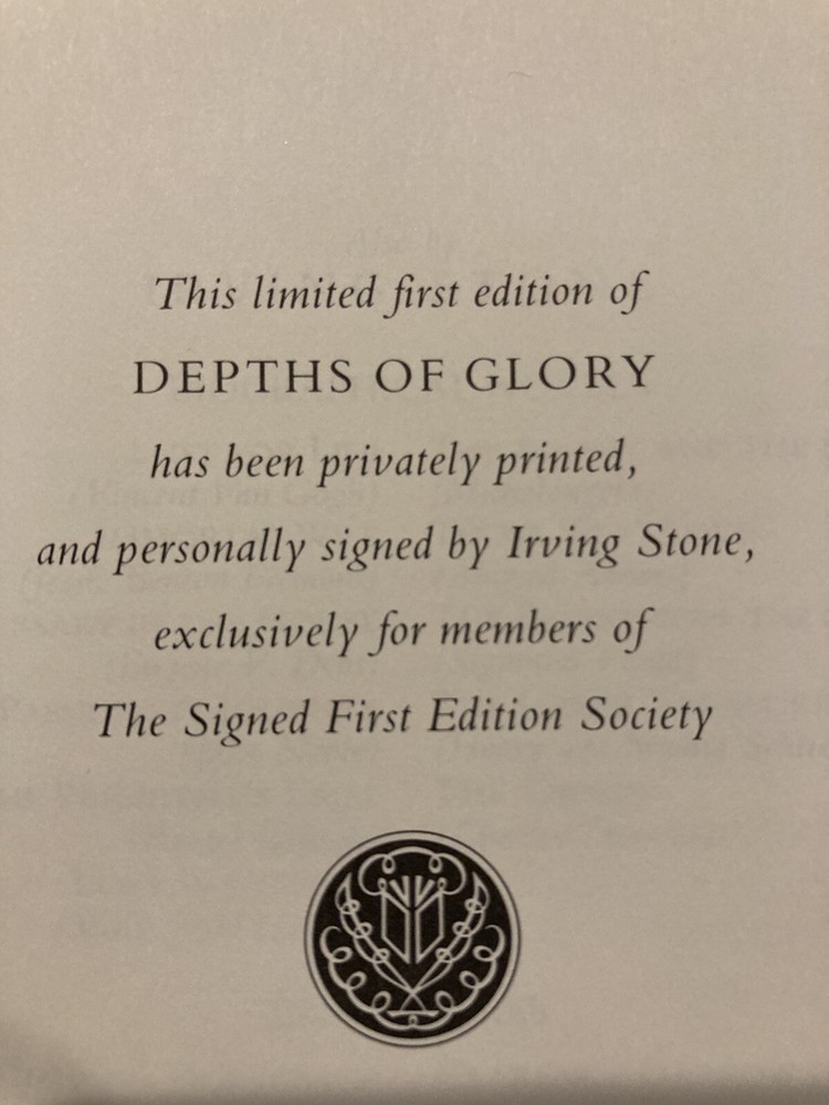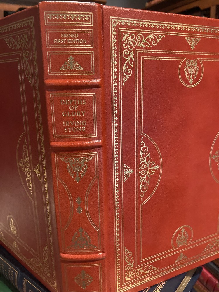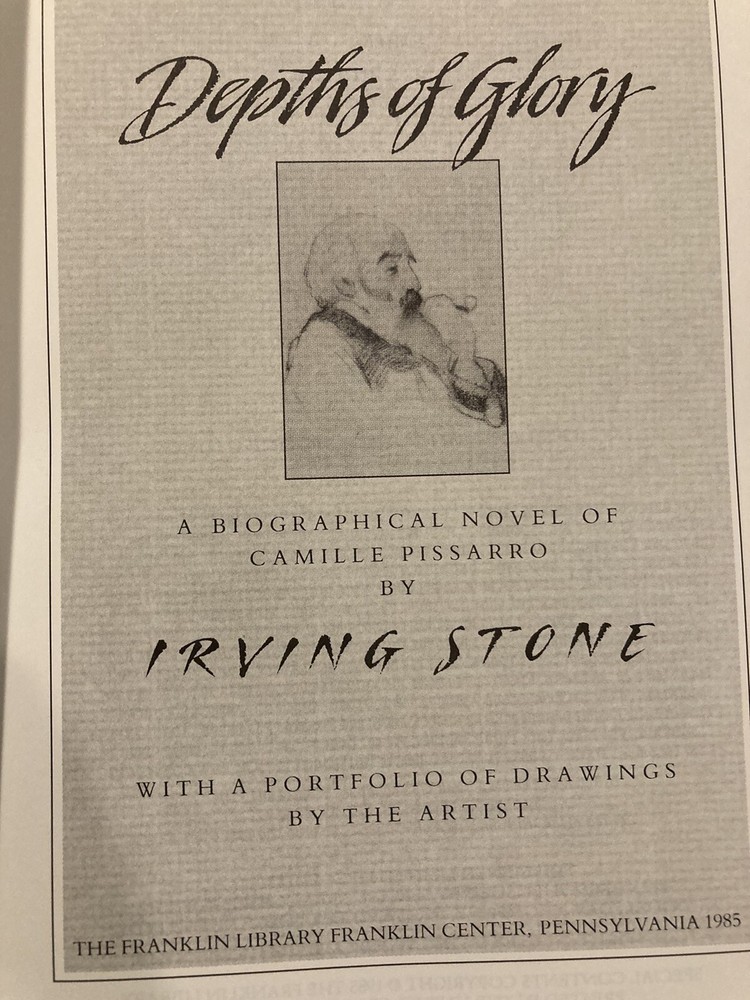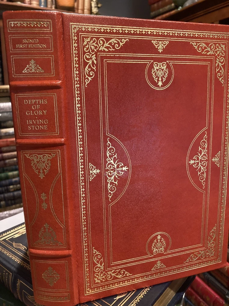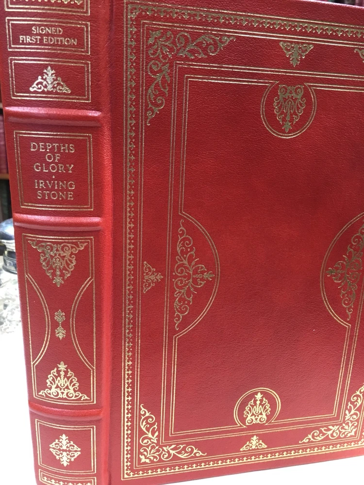 Franklin Library leather edition of Irving Stone's "Depths of Glory: A Biographical Novel of Camille Pissarro," a limited edition, With a Portfolio of Drawings by the Artist, one of the SIGNED FIRST EDITION series, published in 1985. Bound in red leather, the book has marbled paper end leaves, acid-free paper, Symth-sewn binding, a satin book marker, gold gilding on three edges---in near FINE condition. Irving Stone, who was lived from 1903 --- 1989, was an American writer, chiefly known for his biographical novels of noted artists, politicians and intellectuals. Camille Pissarro, who lived from 1830 – 1903, was a Danish-French Impressionist. Pissarro studied from great forerunners, including Courbet, Corot, Seurat, and Signac. In 1873 he helped establish a collective society of fifteen aspiring artists, becoming the "pivotal" figure in holding the group known as Impressionist painters. Cezanne said "he was a father for me. A man to consult and a little like the good Lord," and he was also one of Gauguin's masters. Renoir referred to his work as "revolutionary," through his artistic portrayals of the "common man," as Pissarro insisted on painting individuals in natural settings without "artifice or grandeur." Pissarro is the only artist to have shown his work at all eight Paris Impressionist exhibitions, from 1874 to 1886. He "acted as a father figure not only to the Impressionists" but to the major Post-Impressionists. 647 pages, including a Glossary and bibliography. I offer Combined shipping.