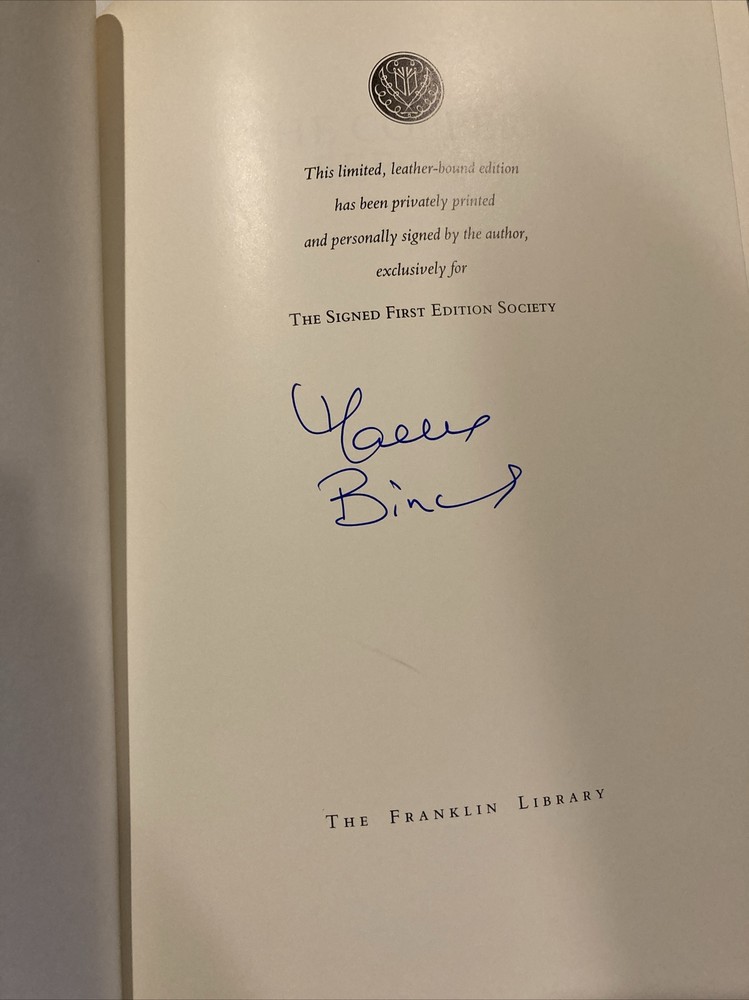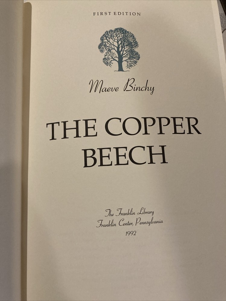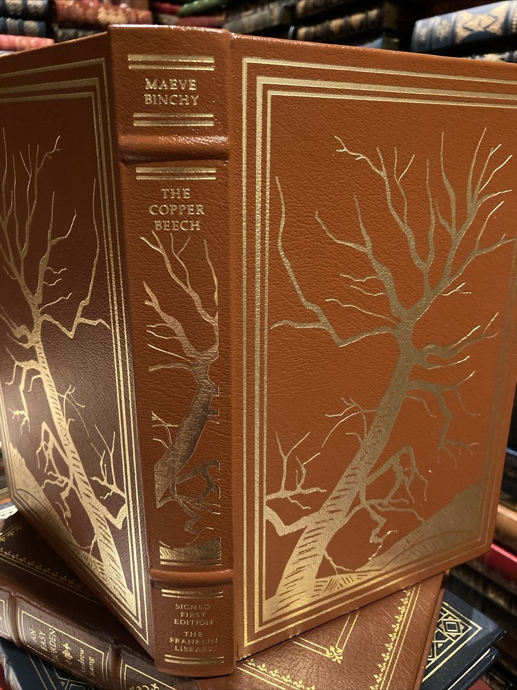 Franklin Library leather edition Maeve Binchy's "The Copper Beech," one of the SIGNED FIRST EDITION series, PERSONALLY SIGNED by Maeve Binchy, Frontispiece by M. John English, published in 1992. Bound in copper gold leather, the book has marbled paper end leaves, acid-free paper, Symth-sewn binding, a satin bookmarker, hubbed spine, gold gilding on three edges--- in FINE condition. COLLECTOR'S NOTES is included. Maeve Binchy Snell, who lived from 1939---2012, was an Irish novelist, playwright, short story writer, columnist, and speaker best known for her sympathetic and often humorous portrayal of small-town life in Ireland. She is an astute observer of what lies beneath the surface of everyday existence. A European copper beech spreads its protective canopy over an old schoolhouse as the unmarried schoolteacher, MADDY ROSS, harbors a deep love for Father Barry Brian---though neither admits to any feeling. Life also deals a difficult hand for poor MAURA O'SULLIVAN; still fate remains on the side of this resolved and courageous woman and her special child. Fatherless EDDIE BARTON, a social outcast, also has a difficult life. Like Maddy Ross, Shancarrig's young new physician, DR. JIMS, seems destined for a life alone---until he gets some useful advice from his dying mentor. Binchy brings to her literary canvas a cast of characters whose small-town life mirror accomplishments and defeats that share a universal resonance. 345 pages. I offer combined shipping.