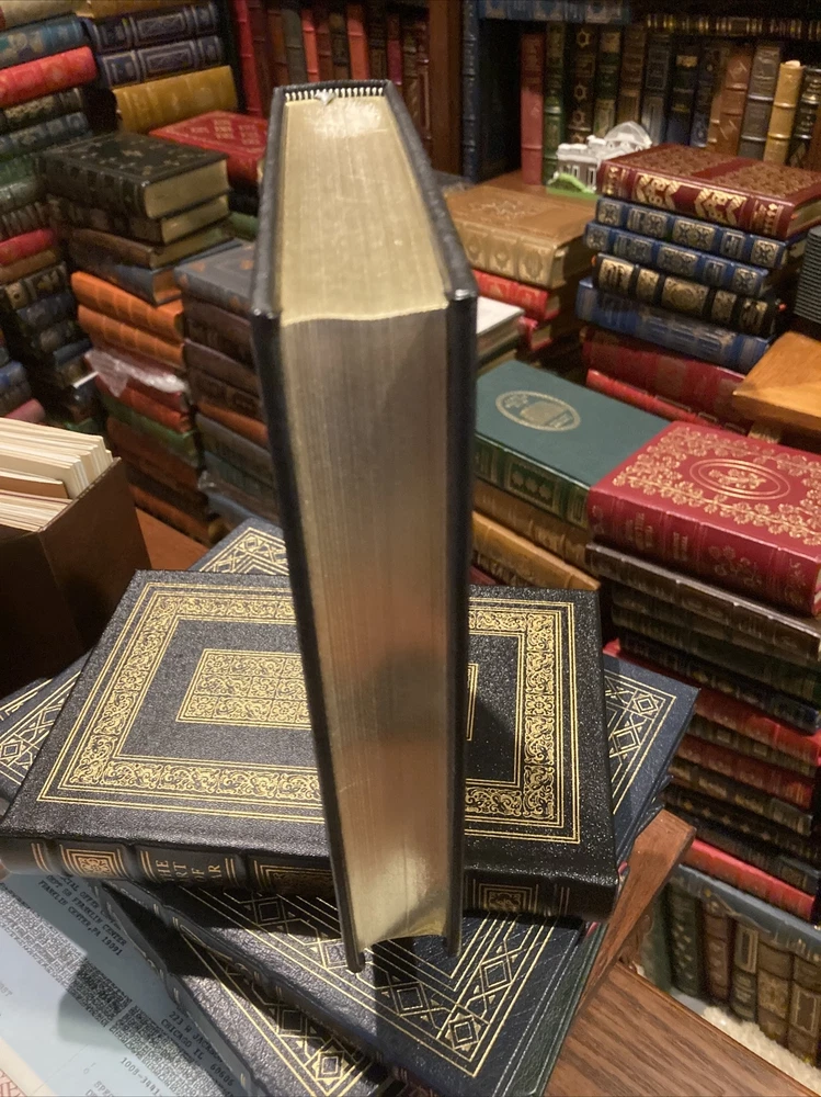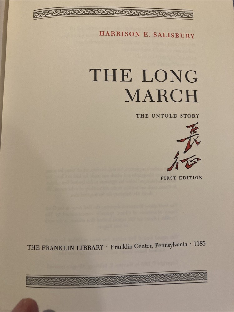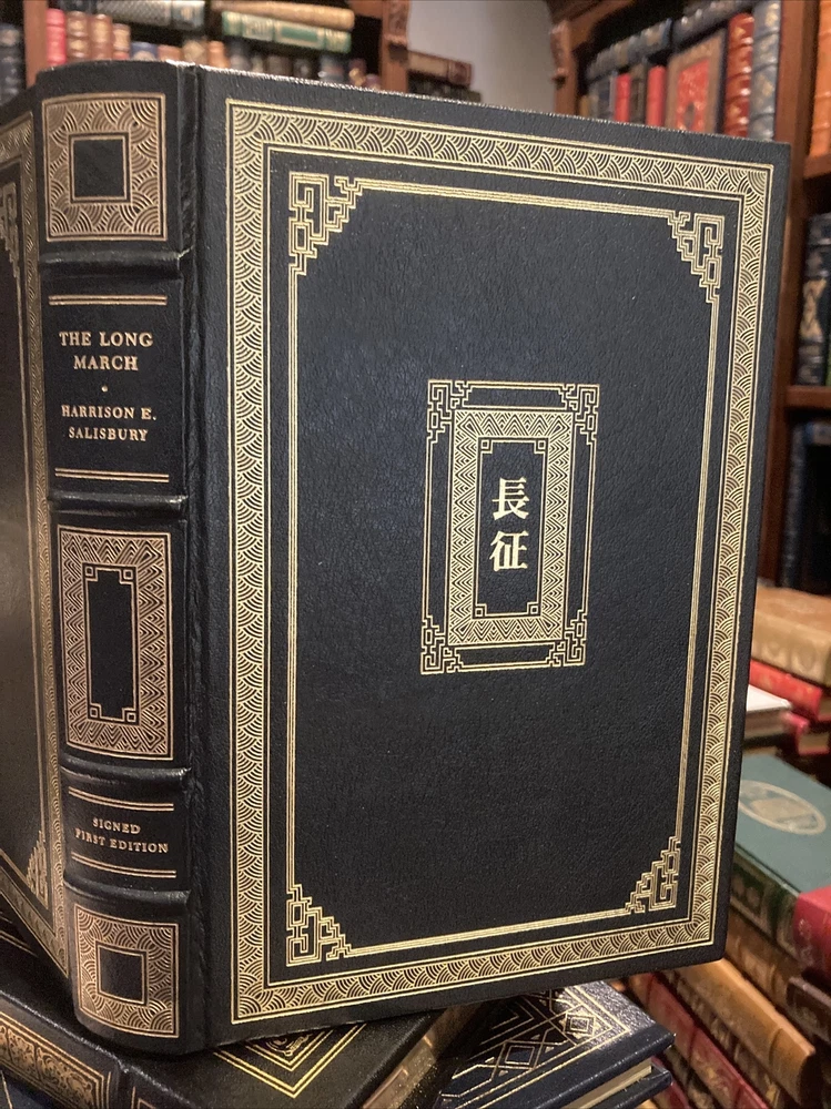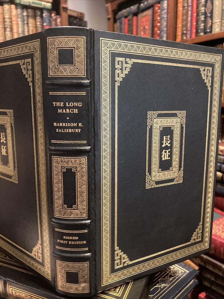 Franklin library leather edition of Harrison Salisbury's "The Long March: The Untold Truth," Frontispiece of the Red Army by Susi Kilgore, a First edition, PERSONALLY SIGNED by HARRISON SALISBURY, one of the SIGNED FIRST EDITION SOCIETY series, published in 1985. Bound in black leather, the book has decorative paper end leaves, a satin book marker, acid-free paper, Symth-sewn binding, gold gilding on three edges---in near FINE condition---except for quarter-sized rub on top gilt. [See photo.] Harrison Evans Salisbury , who lived from 1908 – 1993, was an American journalist and the first regular New York Times correspondent in MOSCOW after World War II. He was born in Minneapolis, Minnesota and graduated from University of Minnesota in 1930. He spent nearly 20 years with United Press (UP), much of it overseas, and was UP's foreign editor during the last two years of World War II. He joined the NEW YORK TIMES in 1949 and became their Moscow correspondent, traveling widely in Siberia, Central Asia and Outer Mongolia along China's borders. Salisbury and his wife, Charlotte, and several Chinese guides, spent two and a half arduous months retracing the route taken by MAO ZEDONG and his comrades. The Salisbury party traversed China's harshest terrain---snowpeaked mountain ranges and treacherous marshlands---covering 7,400 miles. Of the 86,00 Long Marchers in Mao's group, only 4,000 made it to Shaanxi in the north a year later. In 1972, Salisbury presented the proposal to ZHOU ENLAI who eventually approved the project. "The Long March" is compelling reading about the Chinese Red Army's retreat from CHIANG Kai-Shek's Nationalist forces in 1934. Only 4,000 made it to Shaanxi in the north a year later. 419 pages, including an Index. Combined shipping is available.