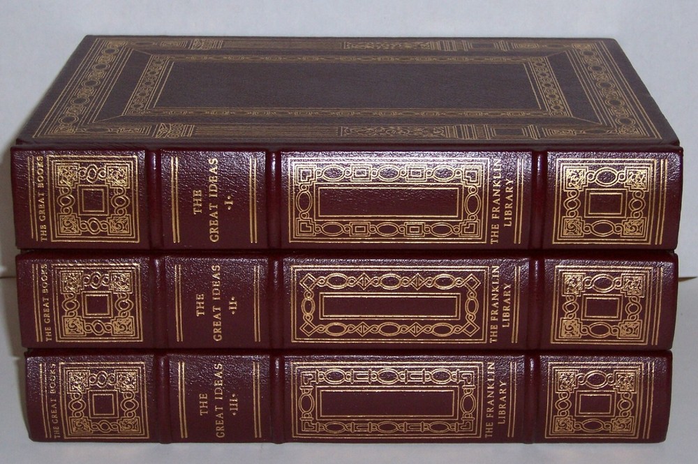 Books from Franklin Library Bound in premium leathers, distinctive cover design, hubbed spine accented in 22-karat gold Endsheets of moire, permanent satin ribbon page marker Thread sewn pages for strength and durability, gilded page edges for beauty and protection Handsome readable typefaces, beautiful illustrations, archival-quality acid-neutral paper TITLE The Great Ideas: A Syntopicon of The Great Books of The Western World in 3 volumes AUTHOR Mortimer J. Adler, Editor in Chief; William Gorman, General Editor MORE DETAILS Exclusively Published by Franklin Library for Subscribers to the 25th Anniversary Limited Edition A Syntopicon of The Great Books of The Western World a complete 3 volume series: 1. The Great Ideas: A Syntopicon of The Great Books of The Western World, Vol I (1985) 2. The Great Ideas: A Syntopicon of The Great Books of The Western World, Vol II (1985) 3. The Great Ideas: A Syntopicon of The Great Books of The Western World, Vol III (1985) DESCRIPTION this set is in like new and unread condition: binding is tight, crisp & bright inside pages, and solid hardcover. SHIPPING Books will be packed safely, and shipped via USPS Media Mail with tracking number.