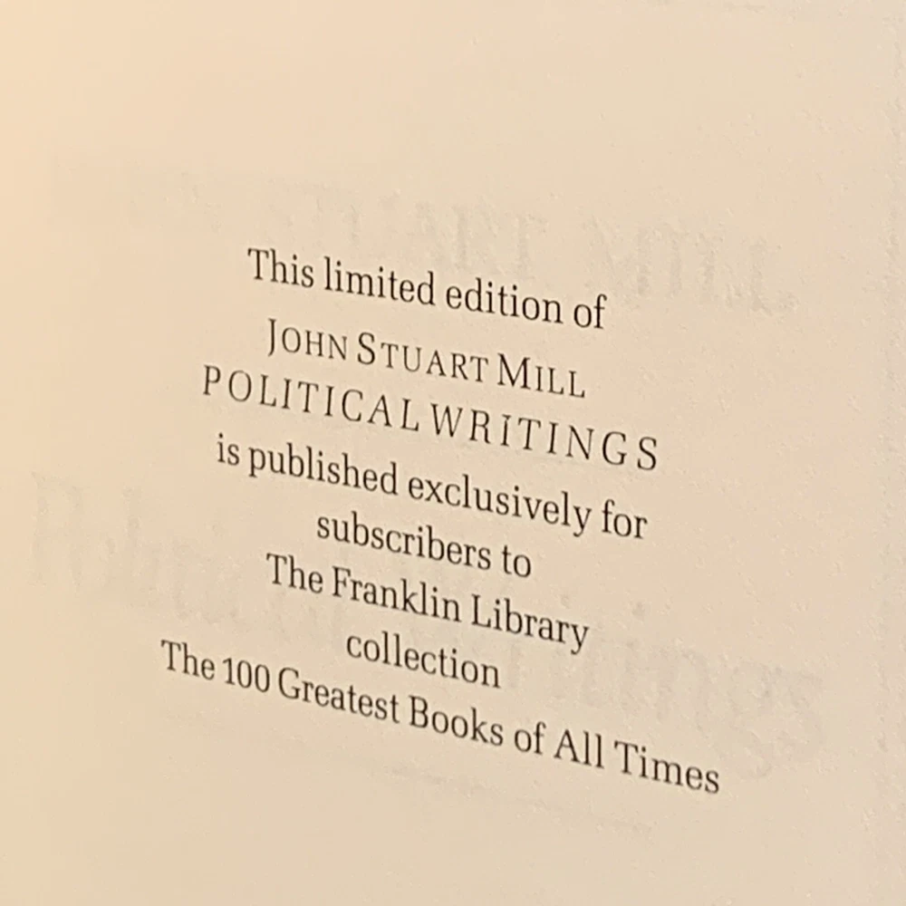 Franklin Library: The Political Writings of John Stuart Mills &Editor’s Notes. Crisp clean pages, impeccable leather cover, excellent gold gilt edges. Near Mint.