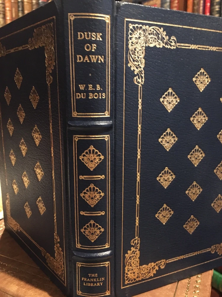 Franklin Library leather edition of W.E.B. Du Bois's "Dusk of Dawn: An Essay toward an Autobiography of a Race Concept," a Limited edition, Illustrated by ROMARE BEARDEN, one of the 100 GREATEST MASTERPIECES OF AMERICAN LITERATURE series, published in 1980. Bound in navy blue leather, the book has matching French moire silk end leaves, acid-free paper, Symth-sewn binding, a satin book marker, hubbed spine, gold gilding on three edges----in near FINE condition. William Edward Burghardt Du Bois, who lived from 1868---1963, was born in Massachusetts, educated at FISK UNIVERSITY in Nashville and HARVARD UNIVERSITY, where studied under Charles Eliot Norton, William James and George Santayana. He earned a PhD at Harvard---the first African American to do so. Du Bois taught at Wilberforce University and Atlanta University. He became the first editor of CRISIS magazine and the elder spokesperson for the NAACP. Du Bois was opposed to what he called the "Tuskegee Machine," a reference to Booker T. Washington's college that emphasized the "mechanical arts" and encouraged the black students to be deferential to white folks who visited the campus. ROMARE BEARDEN, who illustrated this volume, was the most famous African American artist of his day. 355 pages, including an Index. I offer Combined shipping.