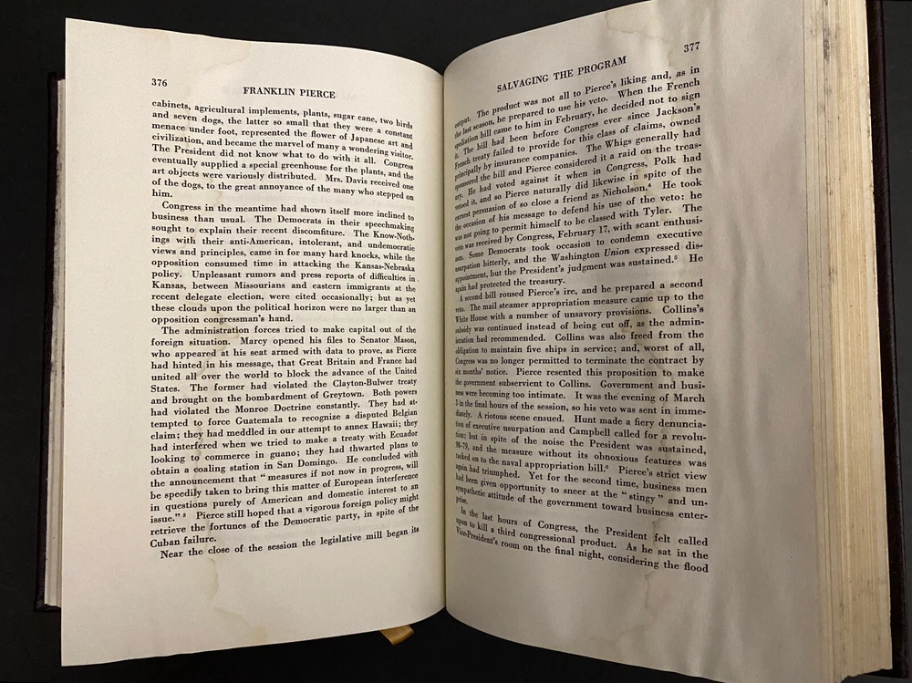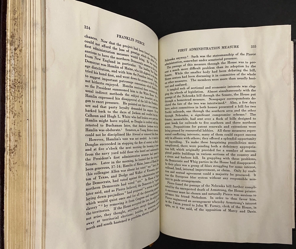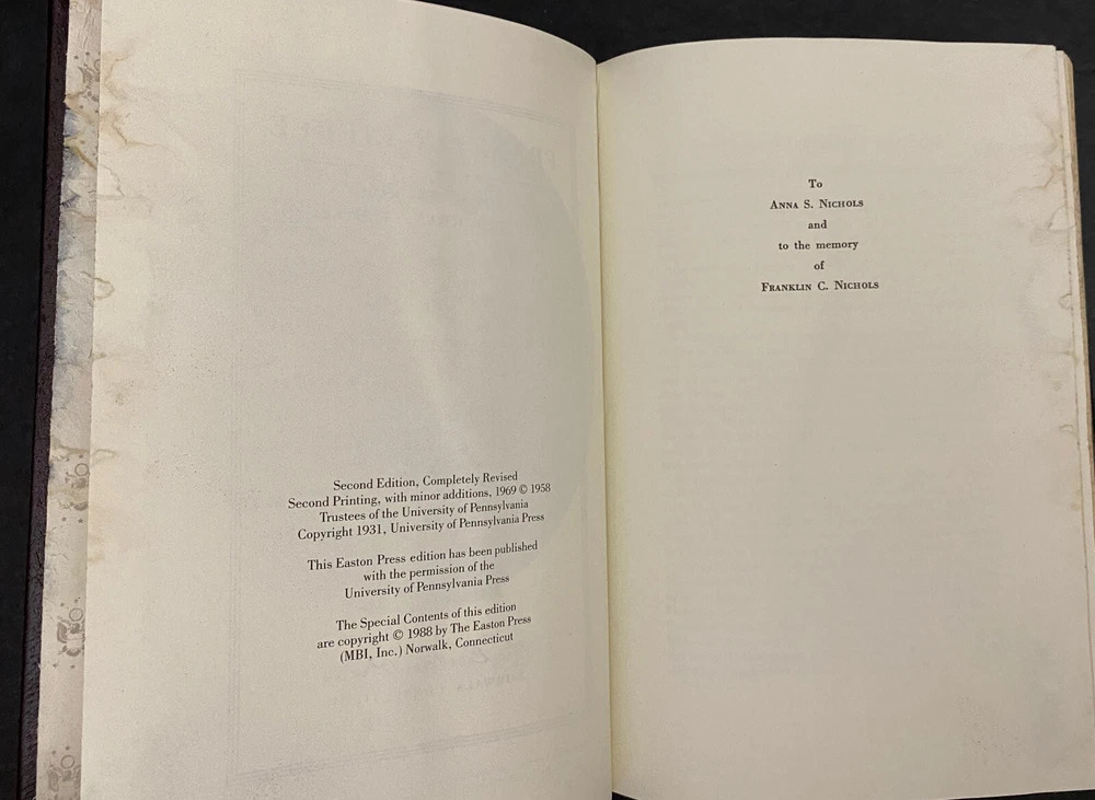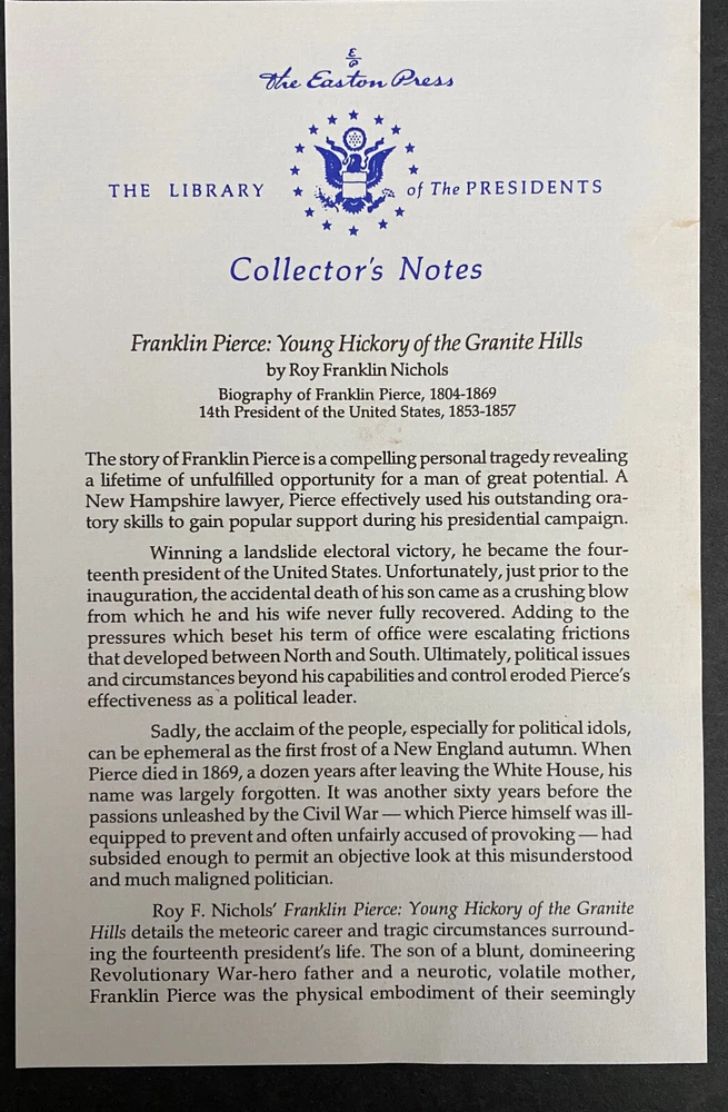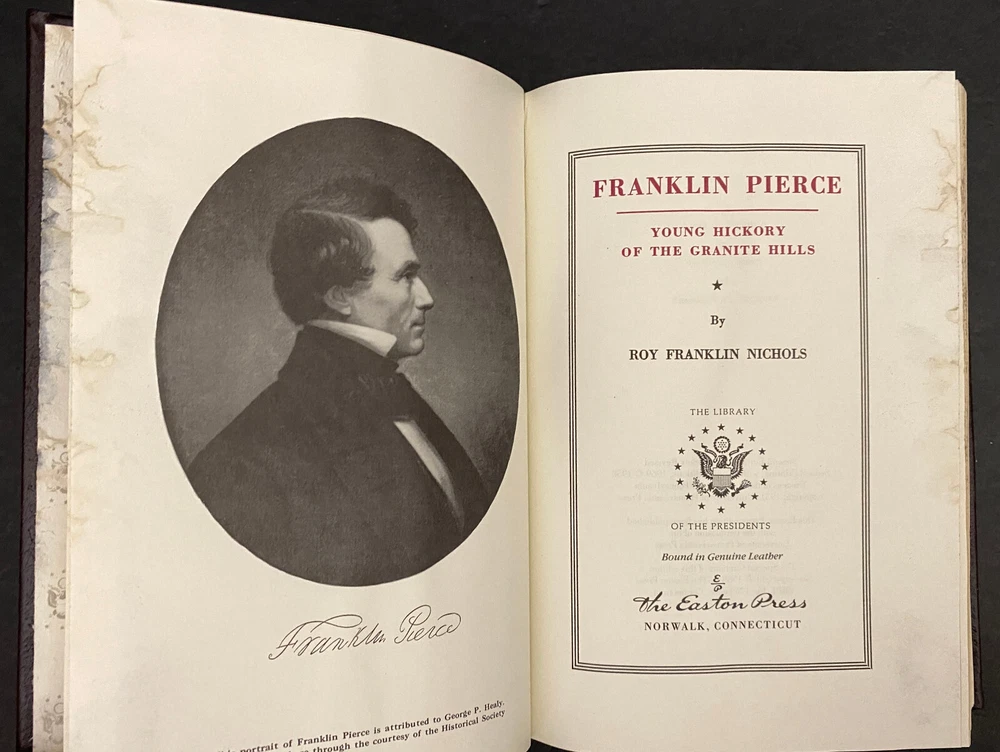 Franklin Pierce : Young Hickory of the Granite Hills by Roy Franklin Nichols, 1988 Easton Press, Water Damaged This is part of The Library of The Presidents Collection. The water damage is on the front edges of the pages of the book. The water damage is throughout the book. The book is warped. The gilding on the front edge is uneven. There is a small scuff mark on the front leather. The binding is tight. Previous owner's bookplate is attached to the front end paper. Included is the Collector's Notes. All items are from a smoke free environment. Your order will ship by the next business day after receiving payment. We will be happy to combine shipping. Please contact us with any questions. Thank you!