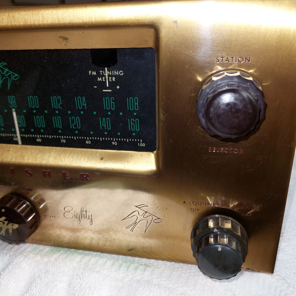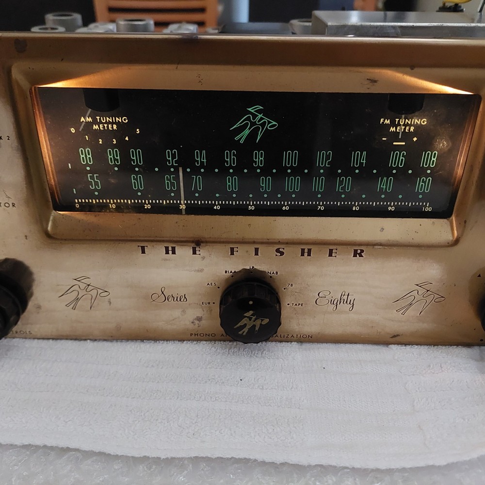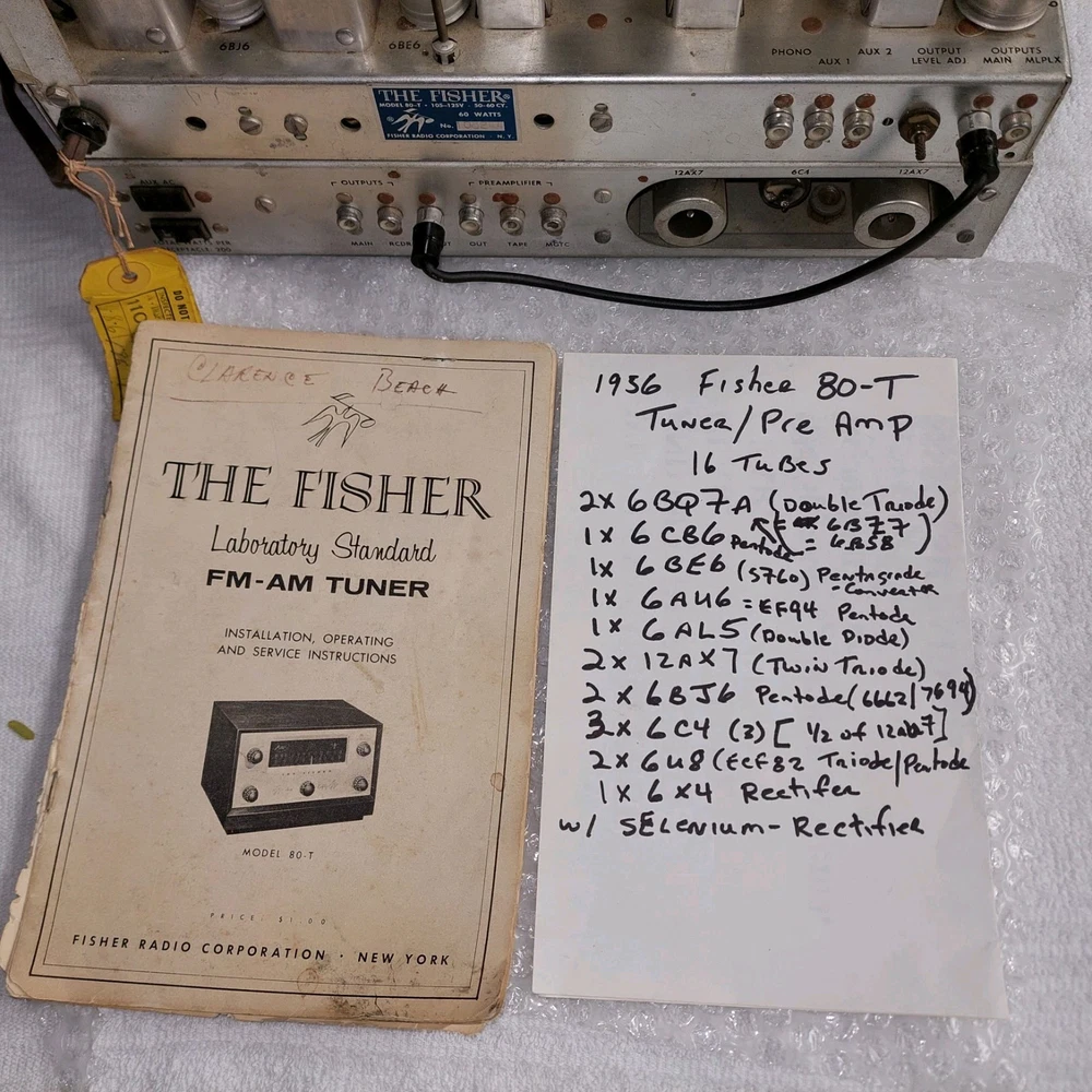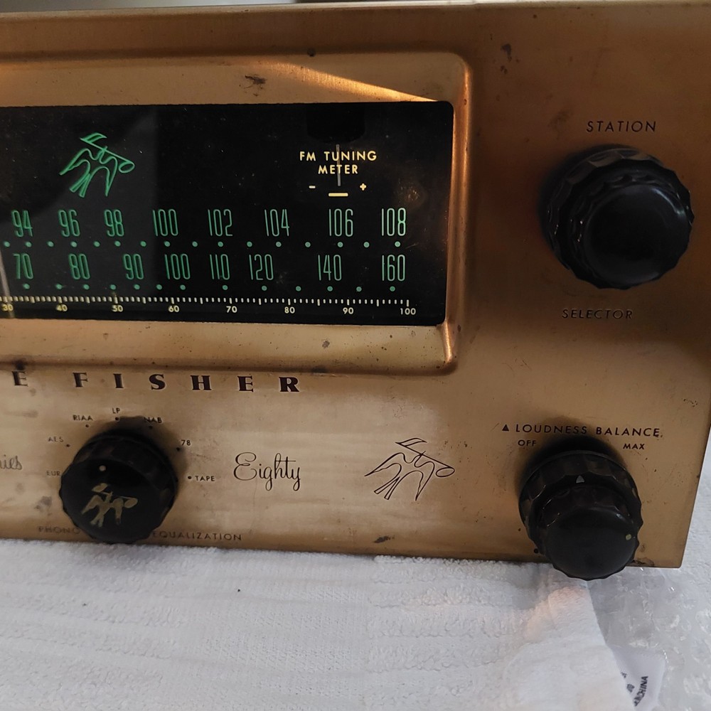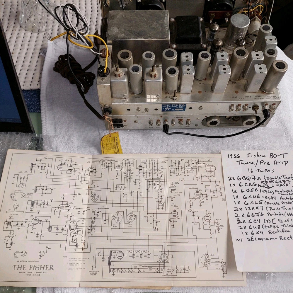 LOCAL PICKUP AVAILABLE Cutler Bay, Florida 33190 This unit is Cross-Listed.. This unit just back 03/06/2025 from a complete servicing/restoration by a Radio/HiFi/Ham Restoration Professional with 50 year Radio restoration experience Restoration work done to Factory Specifications. ONE(1) 1956 FISHER MODEL Lab Series 80-T High Quality MONO PREAMPLIFIER with AM/FM Radio(Mono) .Electronic CONDITION: WORKING AS DESIGNED Detailed Restoration included : REPLACING ALL OUT OF TOLERANCE OLD RESISTORS AND ALL PIO CAPS to NOS re-tested Polyester/Mylar tone caps at lower tolerances in both PreAmp and AM/FM Radio chassis. Re-Checked and adjusted AM/FM Alignment. Cleaned &Checked all point-to point solder connections, Cleaned Sockets, Pots, Switch & Contacts with CRC QD electrical contact cleaner then Deoxit5 electrical lubricant. Replace pilot light, Re-Tested all 16 tubes and replace one 6AU6 with nos USA vintage tube. All 16 tubes are USA vintage tubes a couple original 'The Fisher' tubes by USA manufacturers( Tung-Sol, RCA, GE ect). The Mono Pre-Amp section has 3 tubes (1xRCA Black Plate 1950s 12AX7, 1xGE 1950s 12AX7, 1x Original Fisher 6C4 ), The 6X4 rectifier is the original 'The Fisher' tube as are a couple other Radio tubes. Cosmetics are Fair to Good considering this unit is 70years old.: The glass is nice and Clear with complete silk screening visible. Both AM & FM Tuning Meters work as designed. Also the AM & FM Antenna 4pin connections on top right side support a Loop ,72 Ohm and a 300 Ohm Antenna with wire leads are provided for easy connection. All 5 Original Fisher knobs ('SongBirds') are in very good cosmetic and working condition and clean. We spent a couple hours cleaning the faceplate (had lots of aged tarnish on it) with Flitz polymer polish and went through 5 large micro-fiber cloths by hand rubbing tarnish/oxidation off the face. However it will cleanup a little better with another couple of hours of detailing with Flitz polish if you want to spend the time to do so . There is no rust but some pitting on this faceplace. Also it does have surface scratches in the face plate. See all the pics close up for cosmetics. Essentially we are selling this unit working as designed electronically restored and you make the call as to wither the cosmetics are good enough for you. The 3 tube preamp is connected to the power supply and 13 tube tuner internally via an umbilical cord.. From the service manual is this info: TUBE COMPLEMENT: A total of 16 including 2-6BQ7A, 1-6CB6, 1-6BE6, 1-6AU6, 1-6AL5, 2-12AX7, 2-6BJ6, 3-6C4, 2-6U8 and 1-6X4. PHYSICAL DATA: Overall dimensions: 12 3/4” wide, 8 3/4” deep, 6” high. Allow an additional 1” depth for control knobs. Shipping weight: approximately 21 pounds. Total of eight controls: Bass Control and Treble Controls - bass and treble controls are of the variable crossover type and afford up to 15 db boost and cut at 50 and 10,000 cycles, respectively. EQ Selector (7 positions: EUR, AES, RIAA, LP, NAB, 78, and TAPE) Volume Control Adjustable Loudness Control ; can be turned on or off from front panel. AFC Control and Power Switch Channel Selector (6 positions: AM Broad, AM Sharp, FM, Phono, Aux 1, Aux 2) Station Selector WE TESTED THIS Fisher LAb Series 80-T MONO AM/FM Radio & PREAMP WITH OUR RESTORED FISHER 1959 X-1000 (x-101) MONO INPUT. Testing AM Broadcast & AM Sharp1 CHANNEL and FM on Channel 2 and OUR PHILIPS 312 TURNTABLE WITH MM CART into the Phono 1 Channel(Mono) and with a CD Player(Stereo to Mono rca jack inserted) into AUX1 & 2 input channels, The audio sound is very clean and clear, We will Pull all Tubes and Tube Shields and the Front 5 Knobs and pack them in a separate box and place that box into the box with the well packaged Fisher 80-T. Please read out feedback, We have many years safe exp/ shipping fragile Vintage Electronics, Tubes & Speakers. PACKING & SHIPPING DETAILS Shipping will be calculated USPS ground for a very well packed and extra insulated package. Full value insurance is included. Being offered at a fair "Complete Restoration " Buy it Now Price. WE HAVE MANY YEARS OF EXPERIENCE SHIPPING FRAGILE ELECTRONICS VACUUM TUBES AND SPEAKERS. net dims approx: 13 "W X 9"D X 6"H NET WEIGHT: 14lbs shipped box dims: 16"W x12" X 10"H shipped box weight: 22 lbs WE will ship this unit Boxed Very Well Wrapped for safe shipping, THANK YOU FOR LOOKING! .
