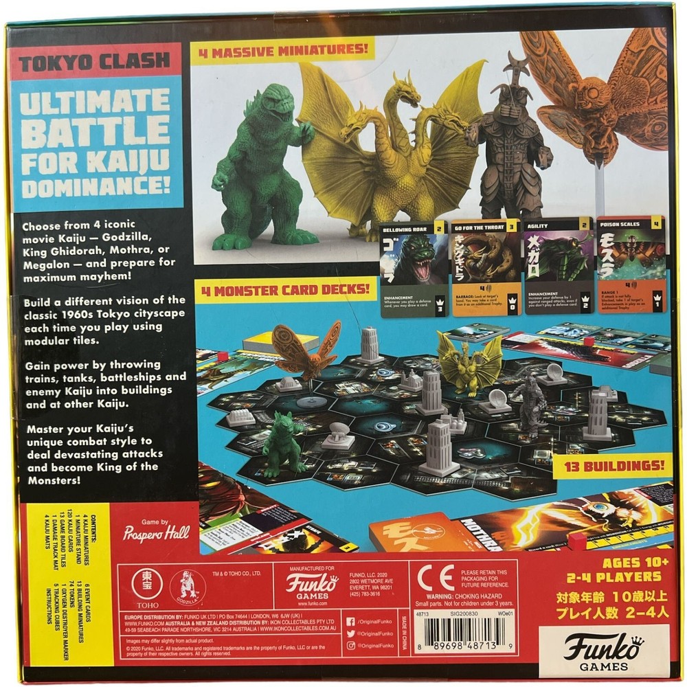 Productt description for the Funko Games Godzilla Boardgame: Experience epic monster battles with the Funko Games Godzilla Boardgame! Choose your favorite kaiju and compete against other players to wreak havoc and earn the most points. Each monster has unique abilities and attacks, and the game features stunning artwork and detailed miniature figures. With easy-to-learn gameplay and endless replayability, this board game is perfect for Godzilla and tabletop gaming fans. Join the battle and prove who is the true king of the monsters! The box seal is still intac, and there is no damage on it, as you can see in the product photos; If you need further information, please feel free to contact me.