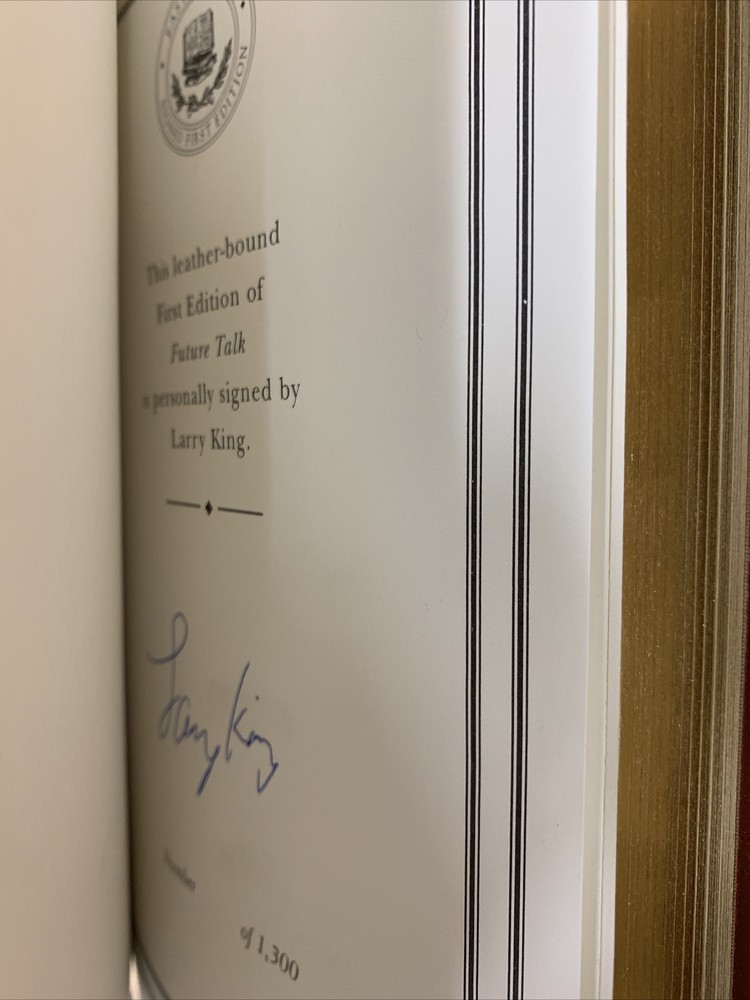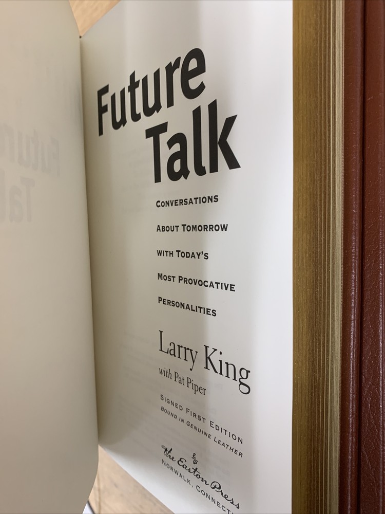 Future Talk Larry King 1998 Signed Limited First Edition Easton Press. See photos for condition. Final sale no returns. Shipped with USPS Media Mail. F7