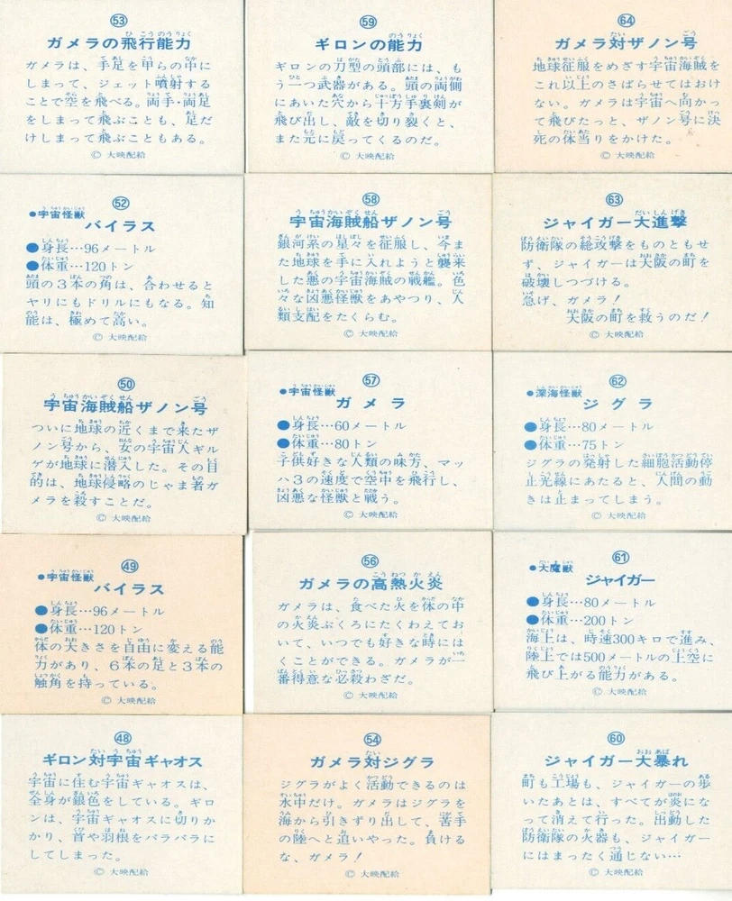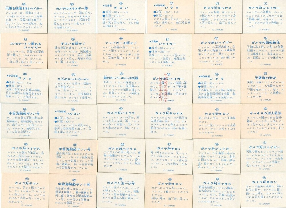 ■ DESCRIPTION ● 51 sheets This is a card made by Yamakatsu of Japan in the 1970s with a lot of 51 vintage gamera cards. Each card is 5 cm x 6.7 cm (1.97 inches x 2.6 inches). The card is in very good condition. ★Please note that the numbers on the back are not aligned. ■ PAYMENT METHODS WE ONLY ACCEPT Pay pal ■ SHIPPING Please choose the delivery method from the following. We will deliver it carefully using packing materials. ● Standard international shipping: DHL (within 1 week from shipping) USA, Canada, Australia, etc. ● Economy delivery: International e-packet Japan Post (airmail) (2 to 3 weeks after shipping) Asia / Europe etc. Both provide online tracking If you would like to know the number of days of arrival in another country, please contact us. ■ Please note These charges are the buyer's responsibility. Please check with your country's customs office to determine what these additional costs will be prior to bidding or buying. Customs fess are normally charged by the shipping company or collected when you pick the item up. These fees are not additional shipping charges.