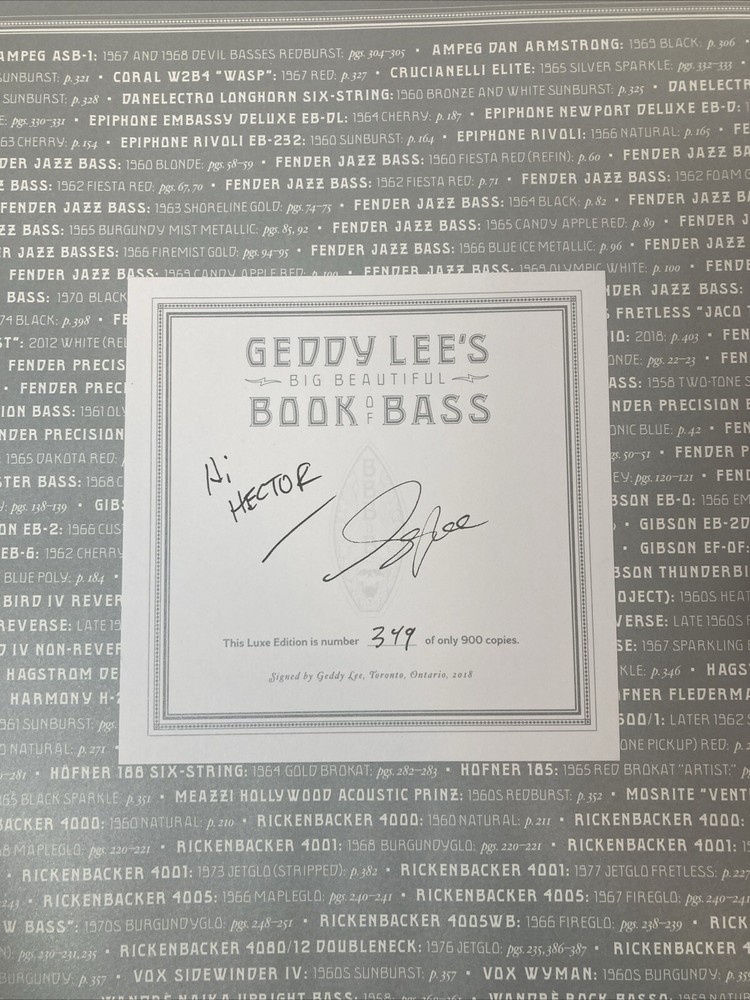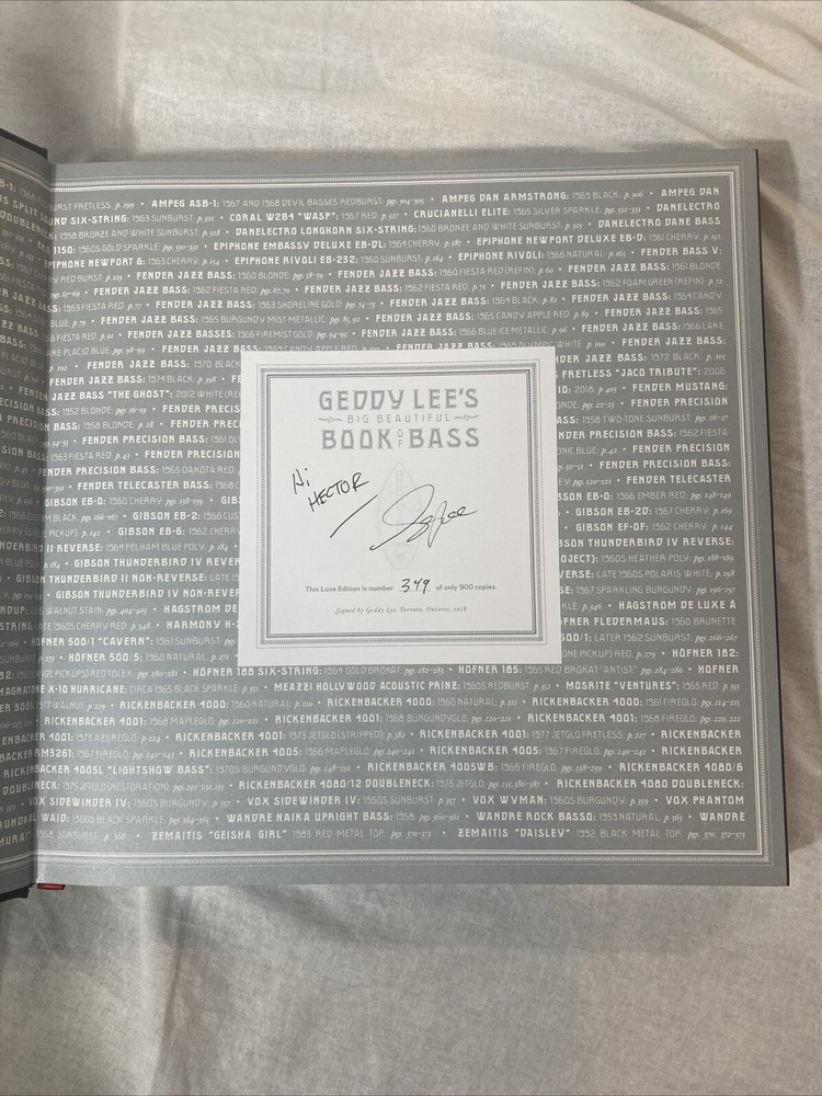 ARTIST : Geddy Lee TITLE : Big Beautiful Book of Bass PUBLISHER : Harper Design, 2018 DESCRIPTION : Up for auction is a signed, limited edition of Rush bassist Geddy Lee's book on basses titled Big Beautiful Book of Bass. The book features Lee's collection of basses. The book was published by Harper Design in 2018. The book was limited 900 signed and numbered copies. This is copy 349. CONDITION : The book is in fine condition with only minor wear to the board edges, see photos. The spine and boards are tight and straight. There are no internal markings, other than Lee' signature. There is no previous owner's bookplate or markings. The slipcase case is in near fine condition with minor wear and bumping to the corners, see photos. Don't forget to take a look at my other signed, limited edition books and prints for sale. Thank you