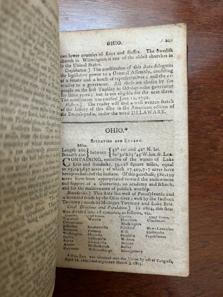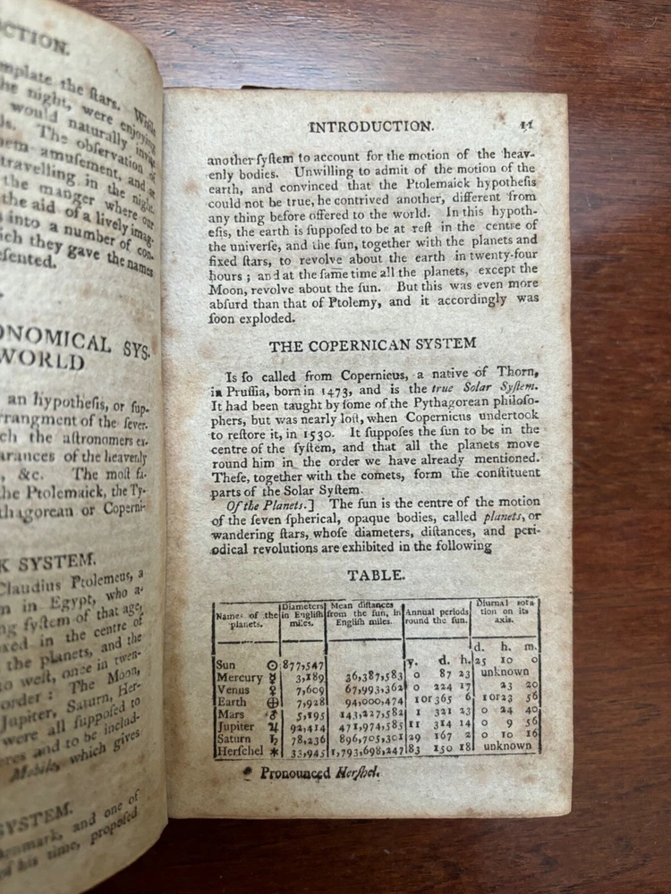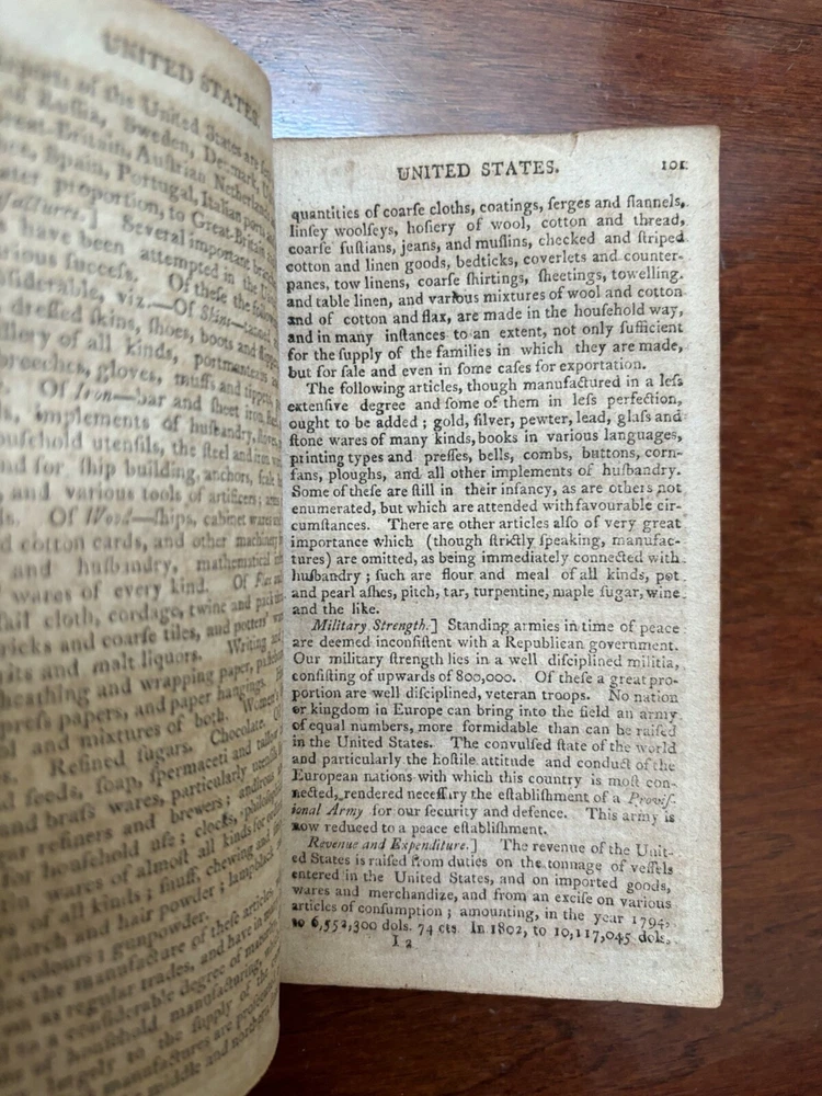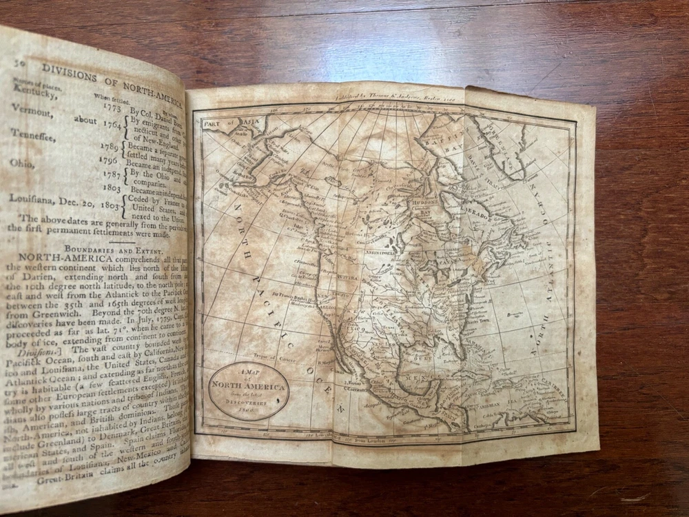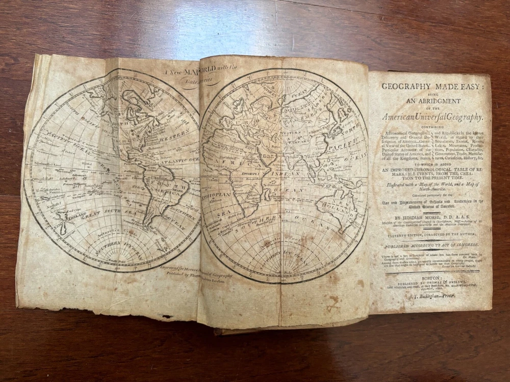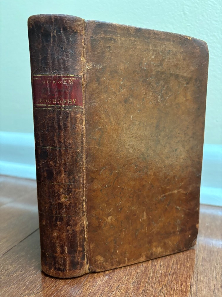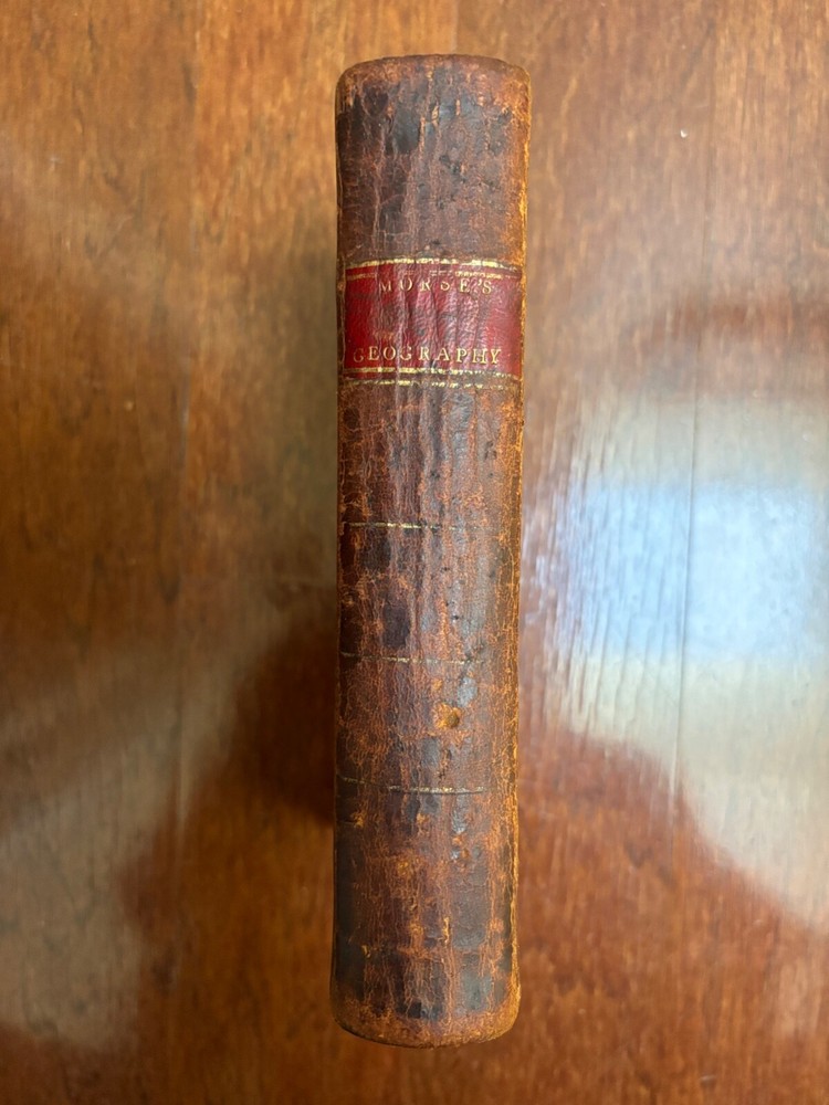 Geography Made Easy: Being An Abridgment of the American Universal Geography by Jedidiah Morse Both folding maps are complete and present and solidly attached --- Map of the World faces the title page and Map of North America at p. 50 Good condition --- covers solidly attached --- book is nearly 220 years old and shows signs of handling and time Thomas & Andrews --- 1807 --- 11th edition Leather bound --- gold lettering and tooling and red title box on spine Cover with shelf wear, scuffing, bumping and wear at corners --- some wear to gilt on spine Soiling to edges of page block --- previous owner's name in ink on FFEP --- endpaper creases Both maps with creasing, light edge wear, foxing/toning 432 pp. --- pages unmarked --- no loose or missing pages Toning and foxing throughout --- infrequent corner/edge creases Around 4 1/2" x 7" Will be securely bubble wrapped in a box and shipped via USPS Media Mail [CD]