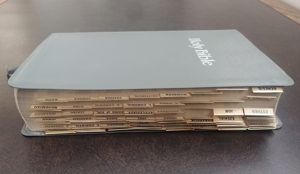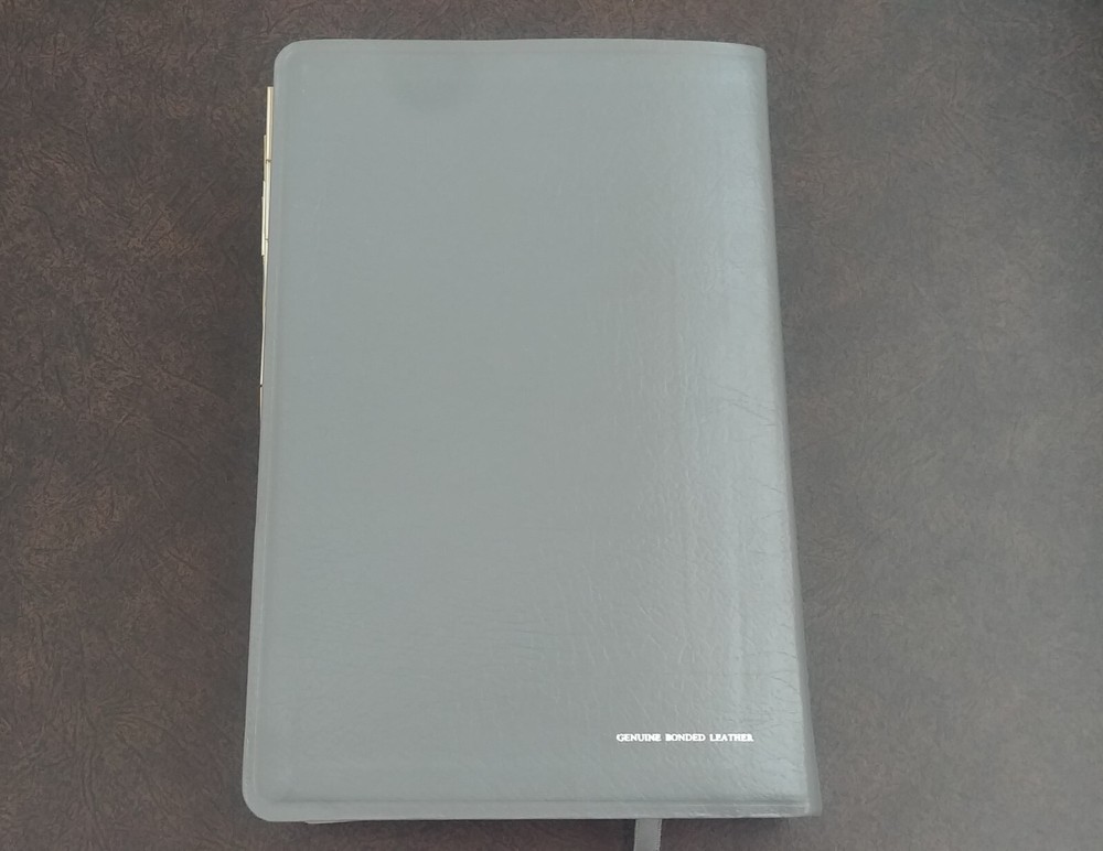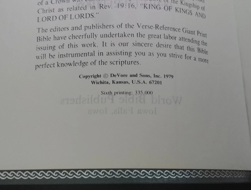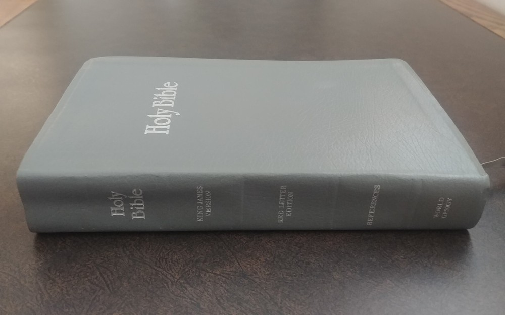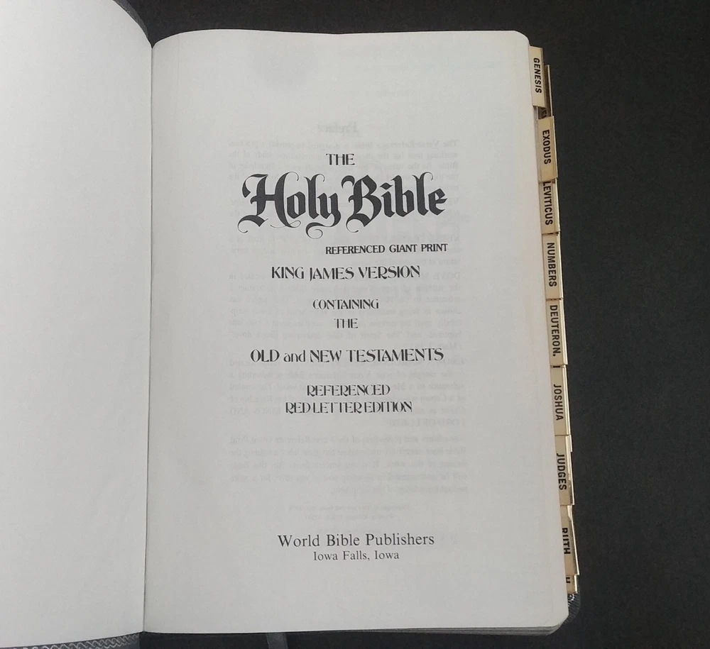 Holy Bible with References. King James Version. World Bible Publishers [1979]. Giant Print. Genuine Bonded Leather. Books of the Bible are Tabbed. Silk Ribbon. Pre-owned. Condition is “Very Good.” No writing or marking in Bible. No missing pages. From a smoke free home. Please see pictures for condition. Ships as shown in the above pictures. Shipped with USPS Media Mail. Shipped fast and with careful packaging.