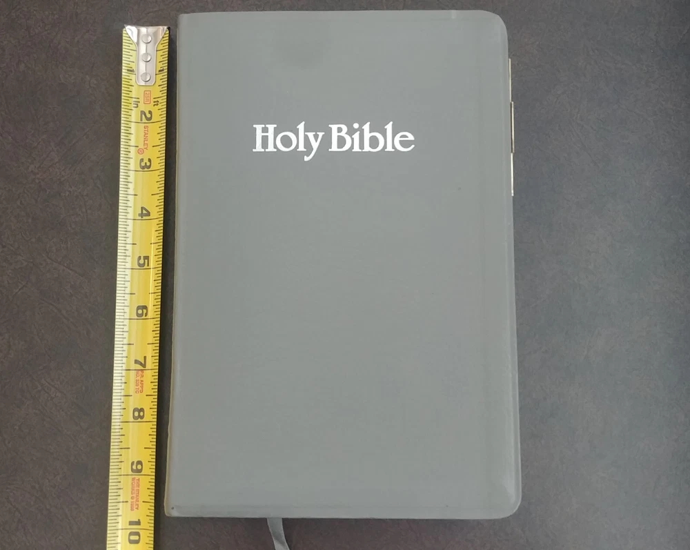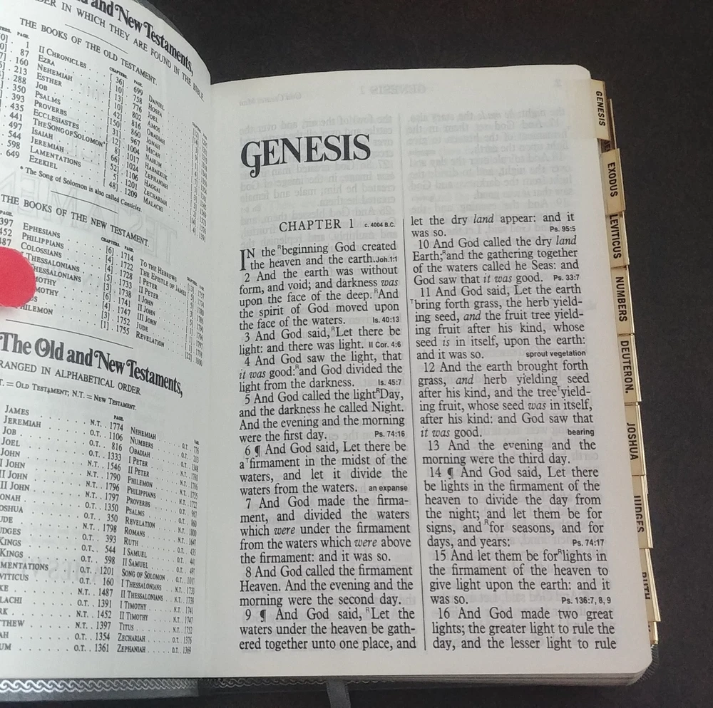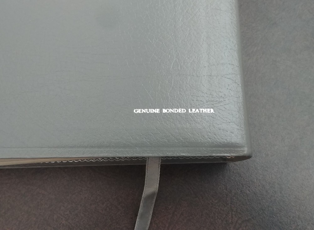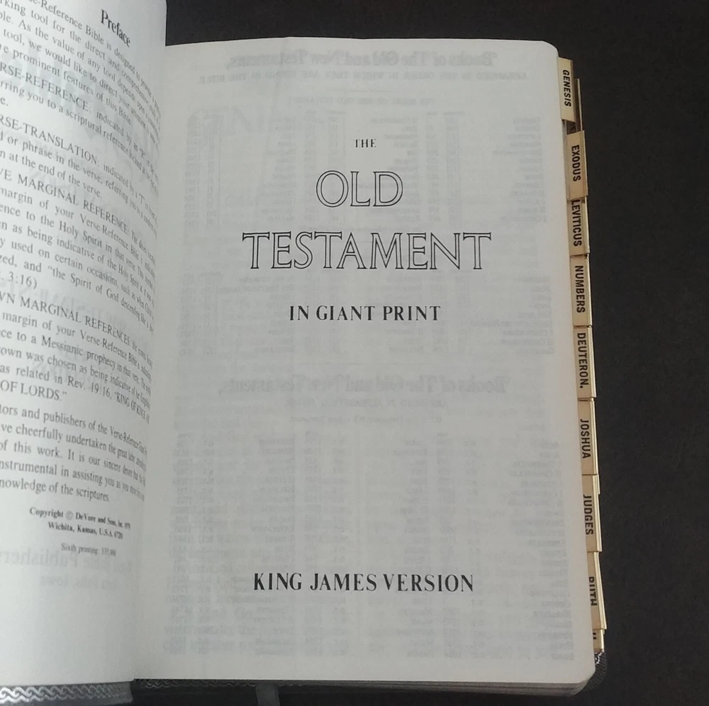 Holy Bible with References. King James Version. World Bible Publishers [1979]. Giant Print. Genuine Bonded Leather. Books of the Bible are Tabbed. Silk Ribbon. Pre-owned. Condition is “Very Good.” No writing or marking in Bible. No missing pages. From a smoke free home. Please see pictures for condition. Ships as shown in the above pictures. Shipped with USPS Media Mail. Shipped fast and with careful packaging.